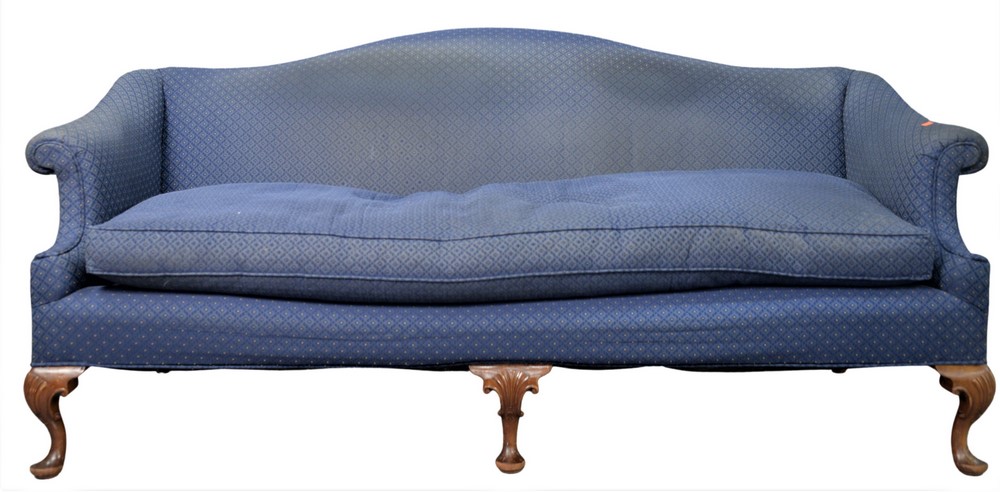 Lot 248: Margolis Queen Anne Style Sofa, having carved knees and camelback, height 36 inches, length 75 1/2 inches.