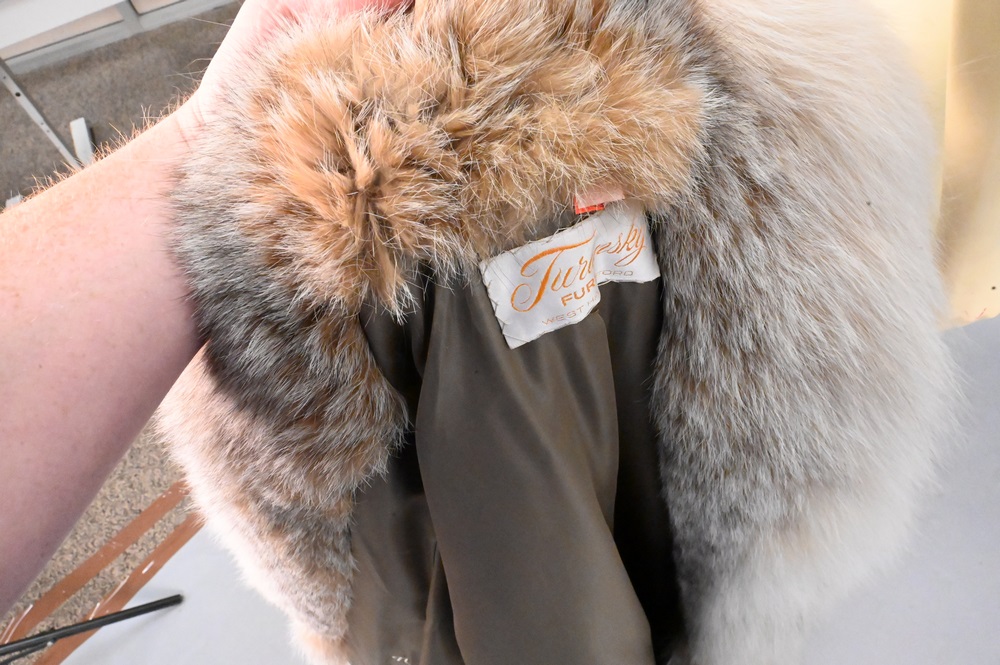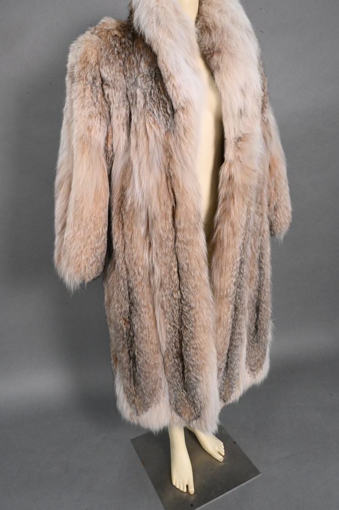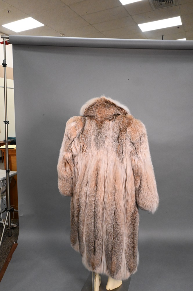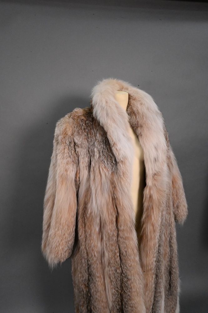Lot 248: Natural Full Length Lynx Coat, vertically cut, fully let out, shawl collar, straight sleeves, West Hartford, CT tag, like new condit…