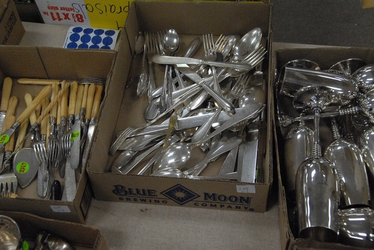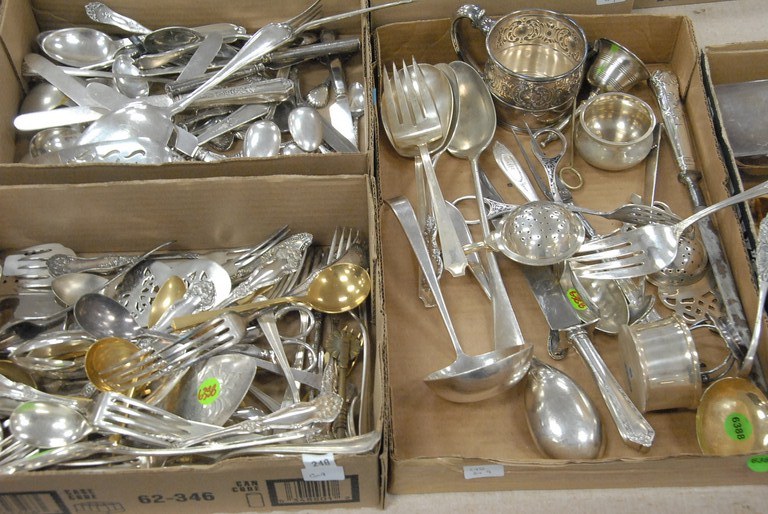 Lot 248: Nine box lots mostly silverplate flatware, wine coaster, silver plated rectangular box, fish set, and goblets.