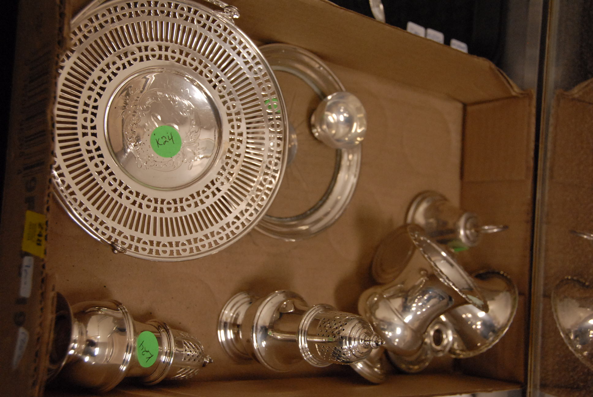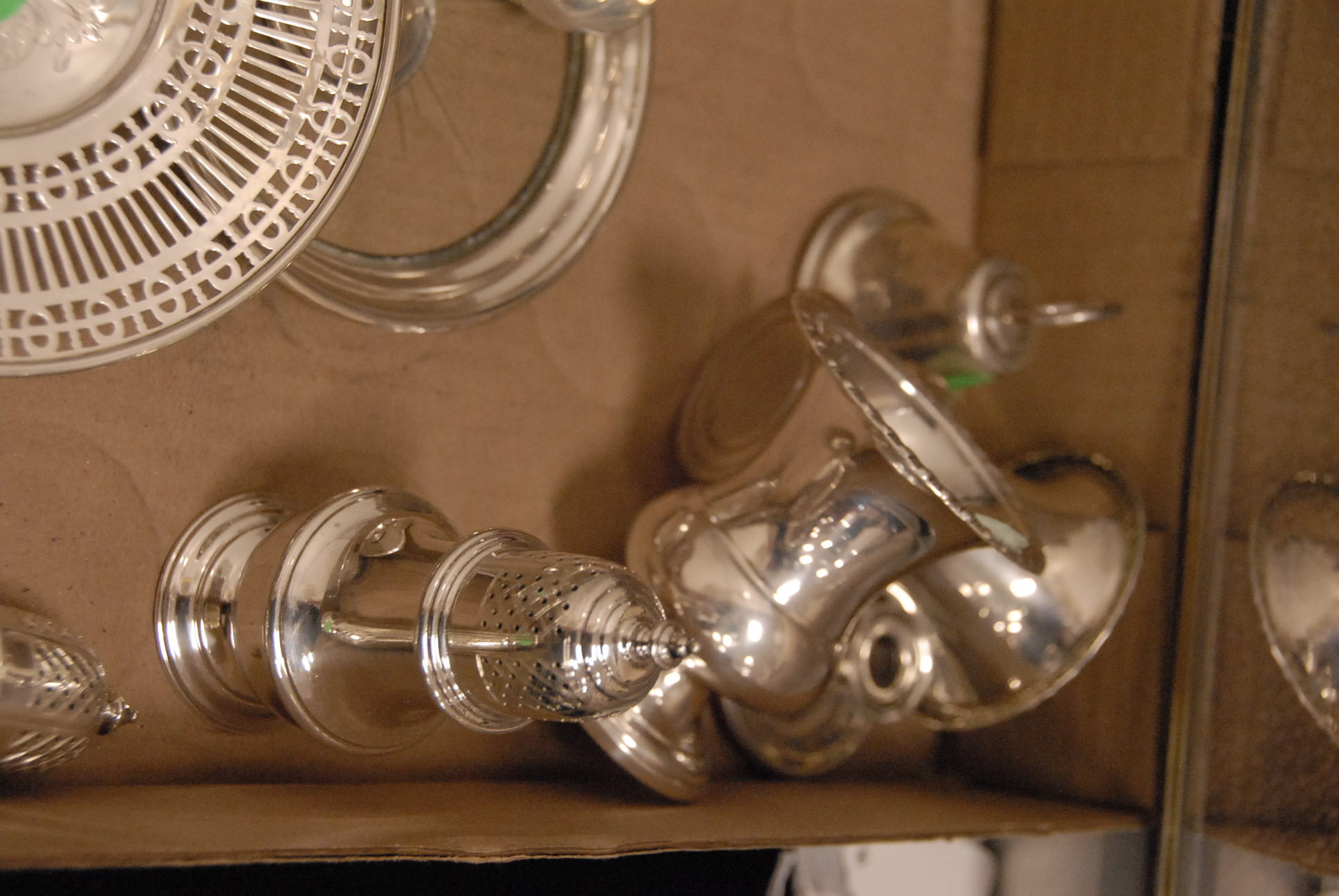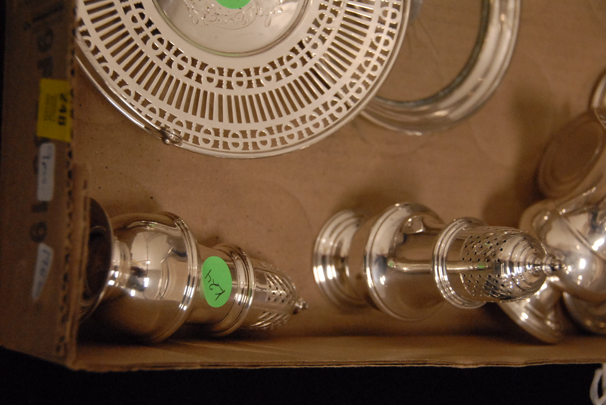 Nine pc lot of sterling silver cigarette holders, pepper shakers, small dish.