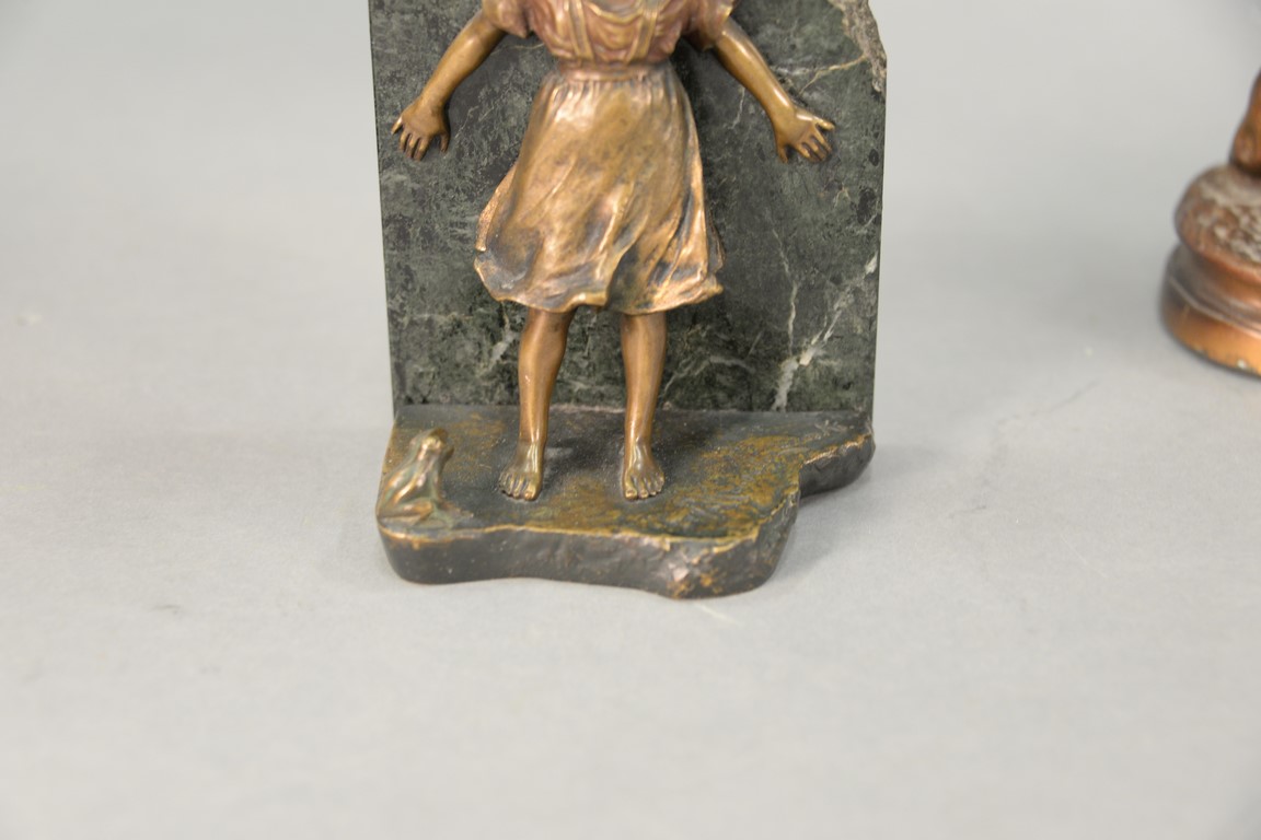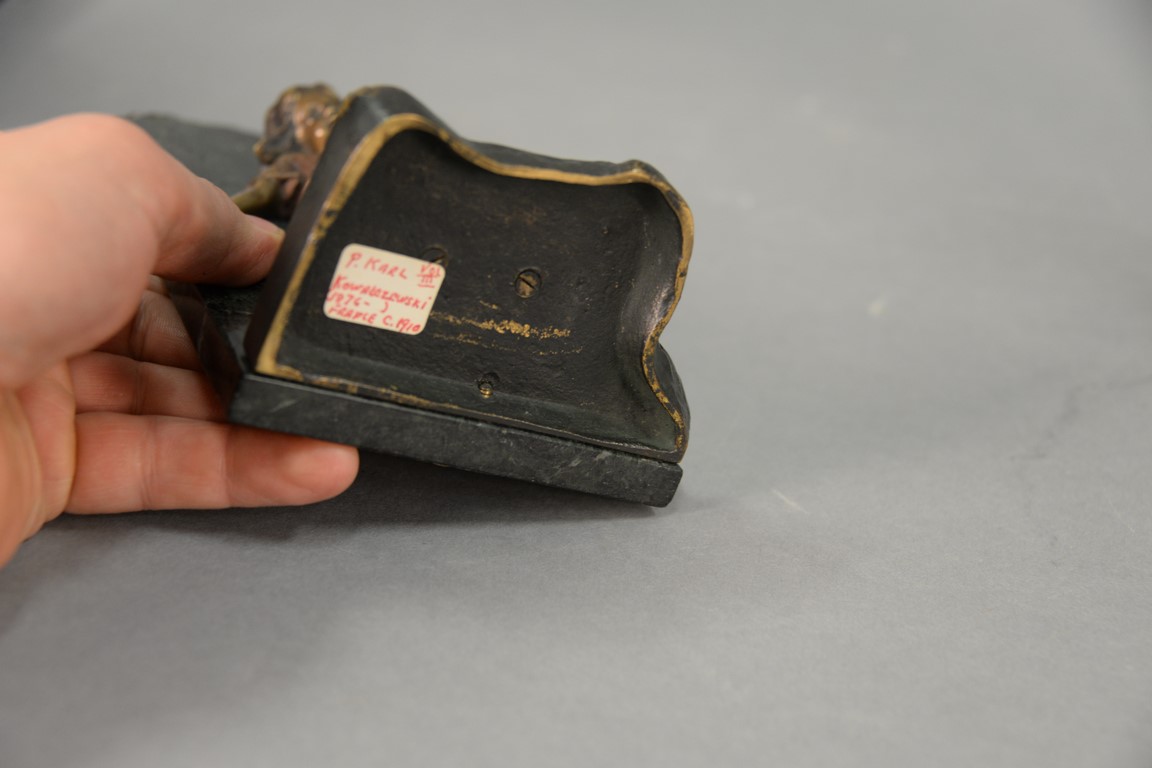 Paul Ludwig Kowalczewski 1865-1910 bronze figure of a girl standing against a wall looking at a frog, signed on base, P. Kowalczewski, ht. 6 1/2in.