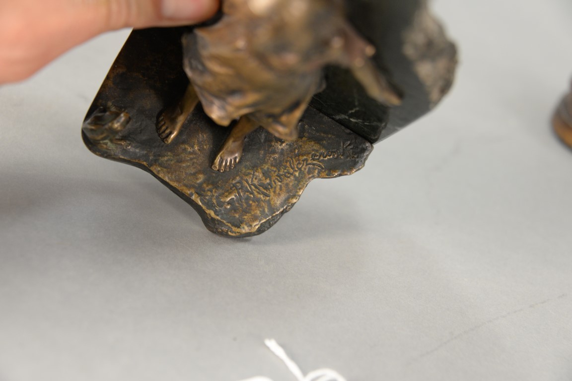 Lot 248: Paul Ludwig Kowalczewski 1865-1910 bronze figure of a girl standing against a wall looking at a frog, signed on base, P. Kowalczew…