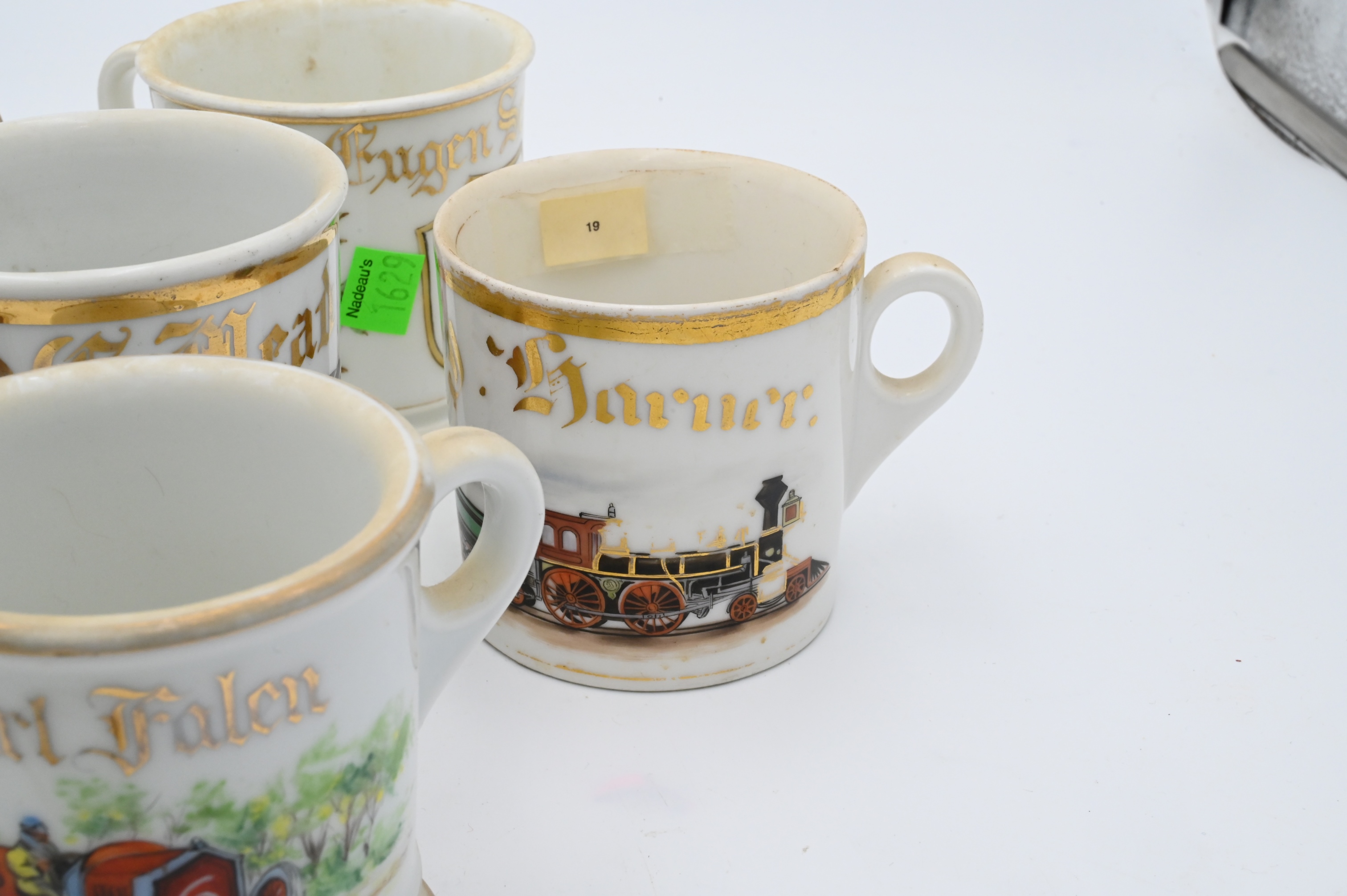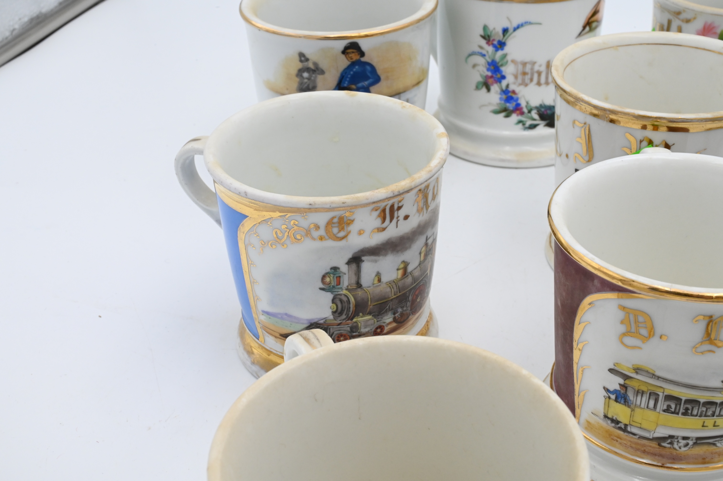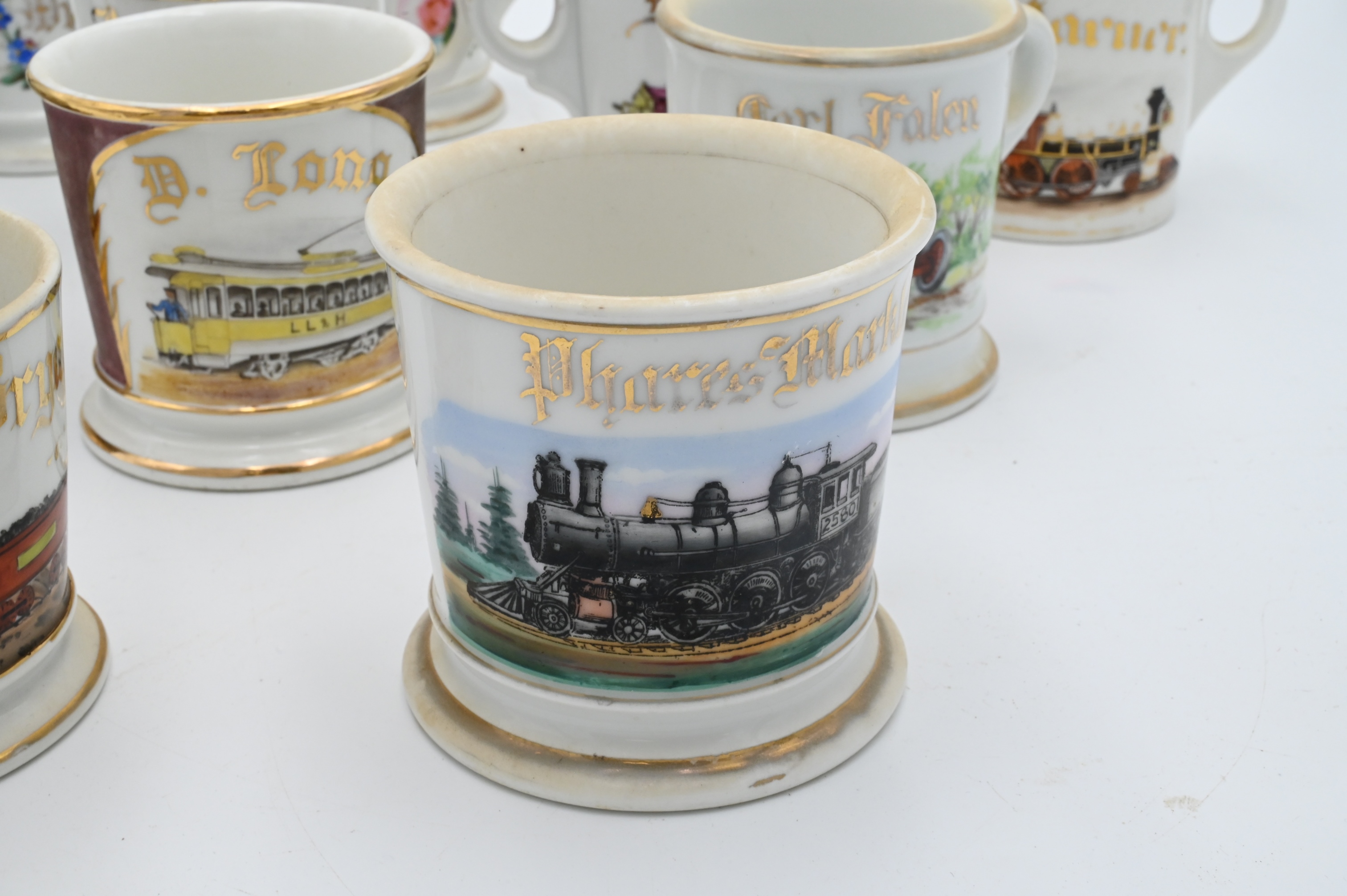 Seven Piece Group of Automobile and Locomotive Occupational Shaving Mugs, having various markings to include, T&V Limoge, Frank Doehler Rochester NY, Felda China Germany, tallest height 4 inches, diameter 3 1/2 inches, Provenance: Estate of Donald K. Huber