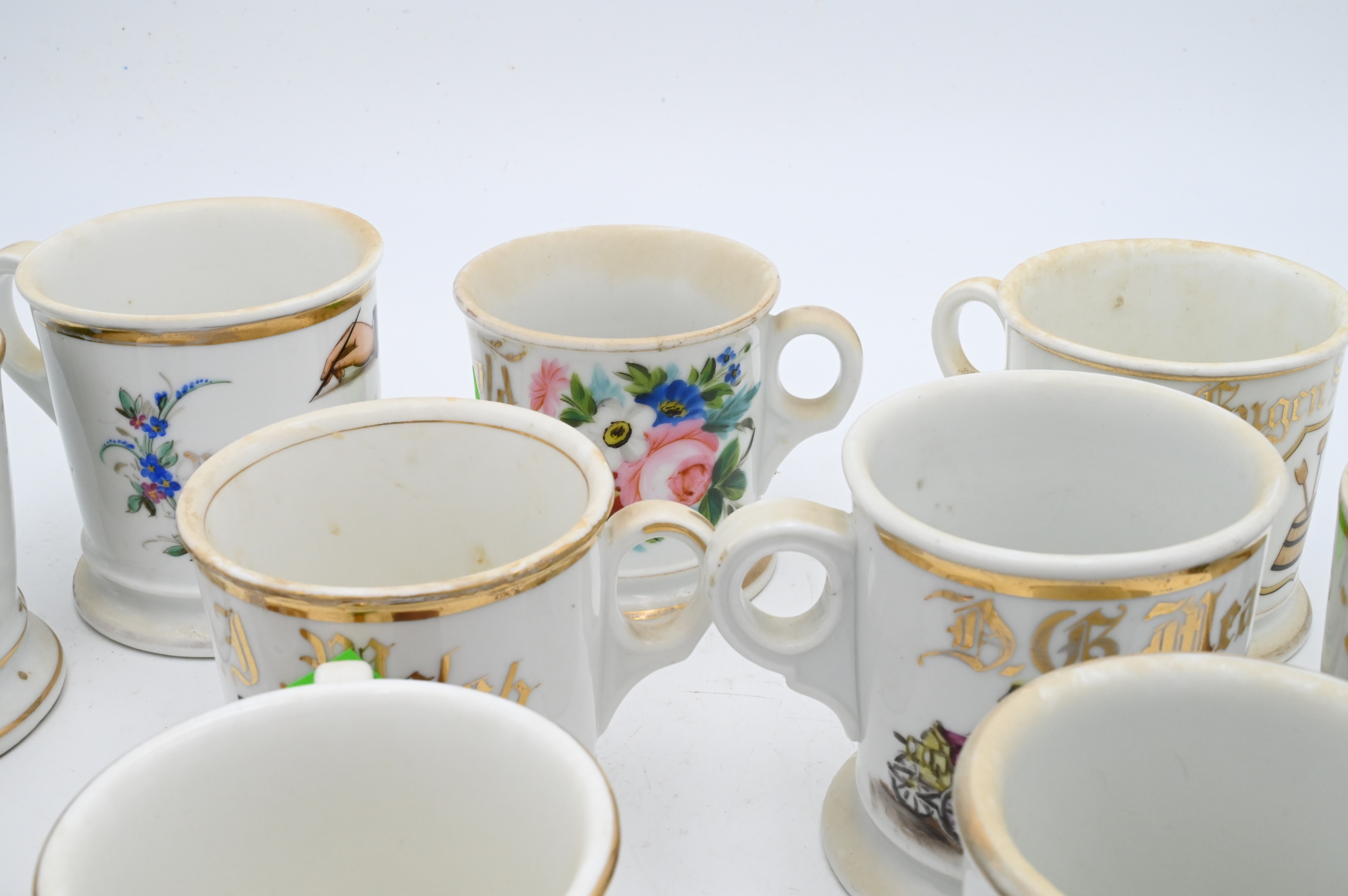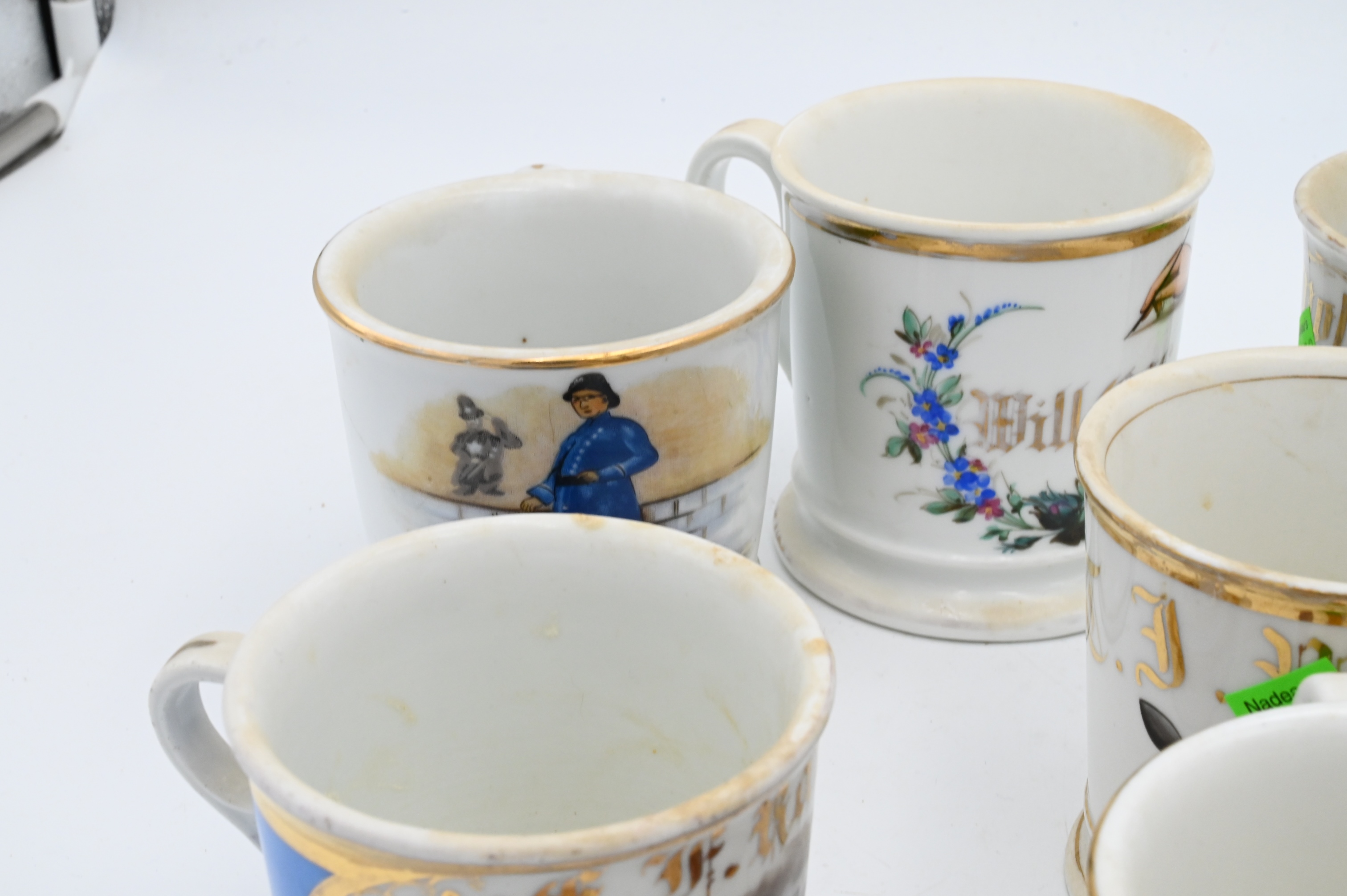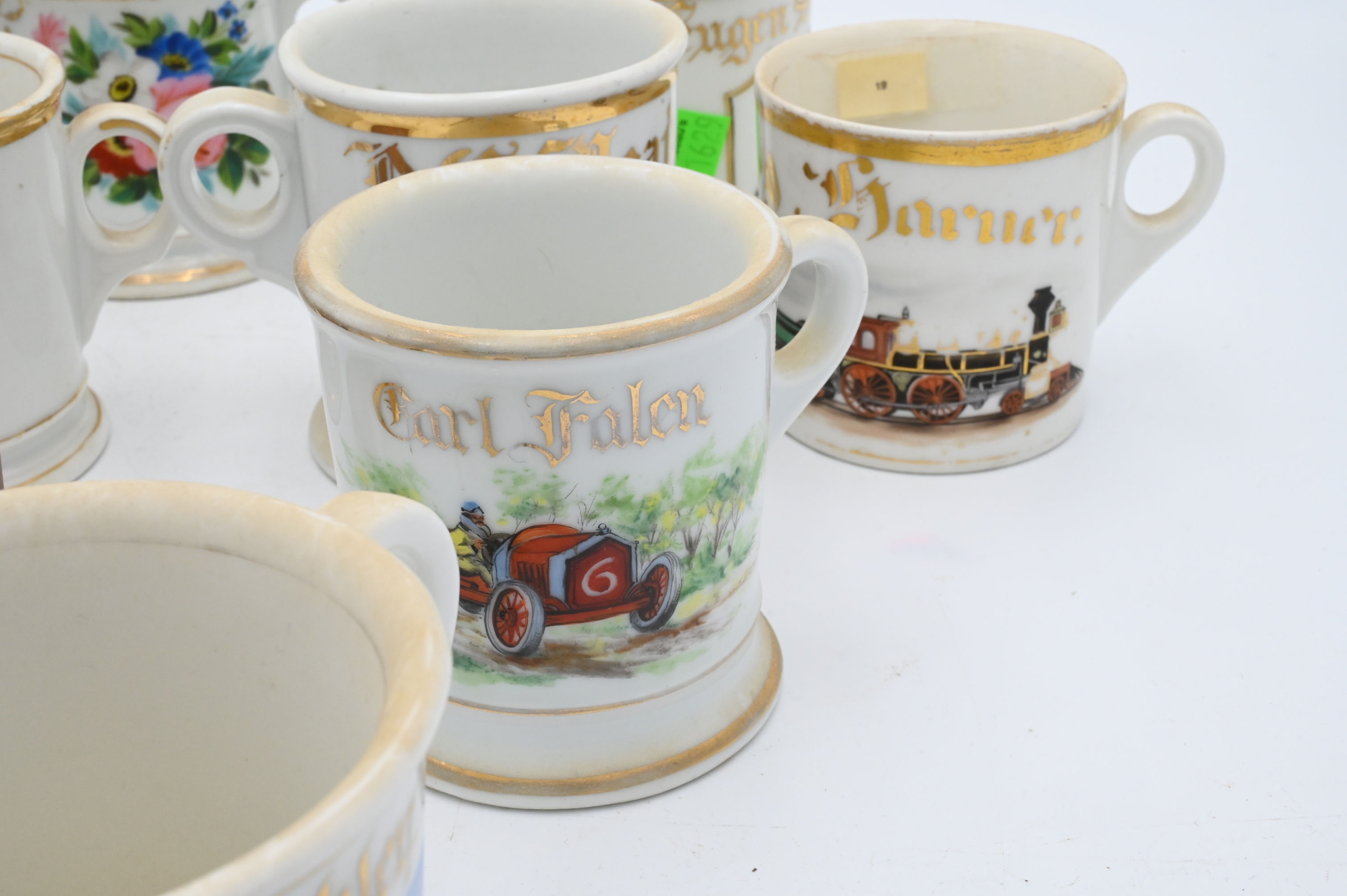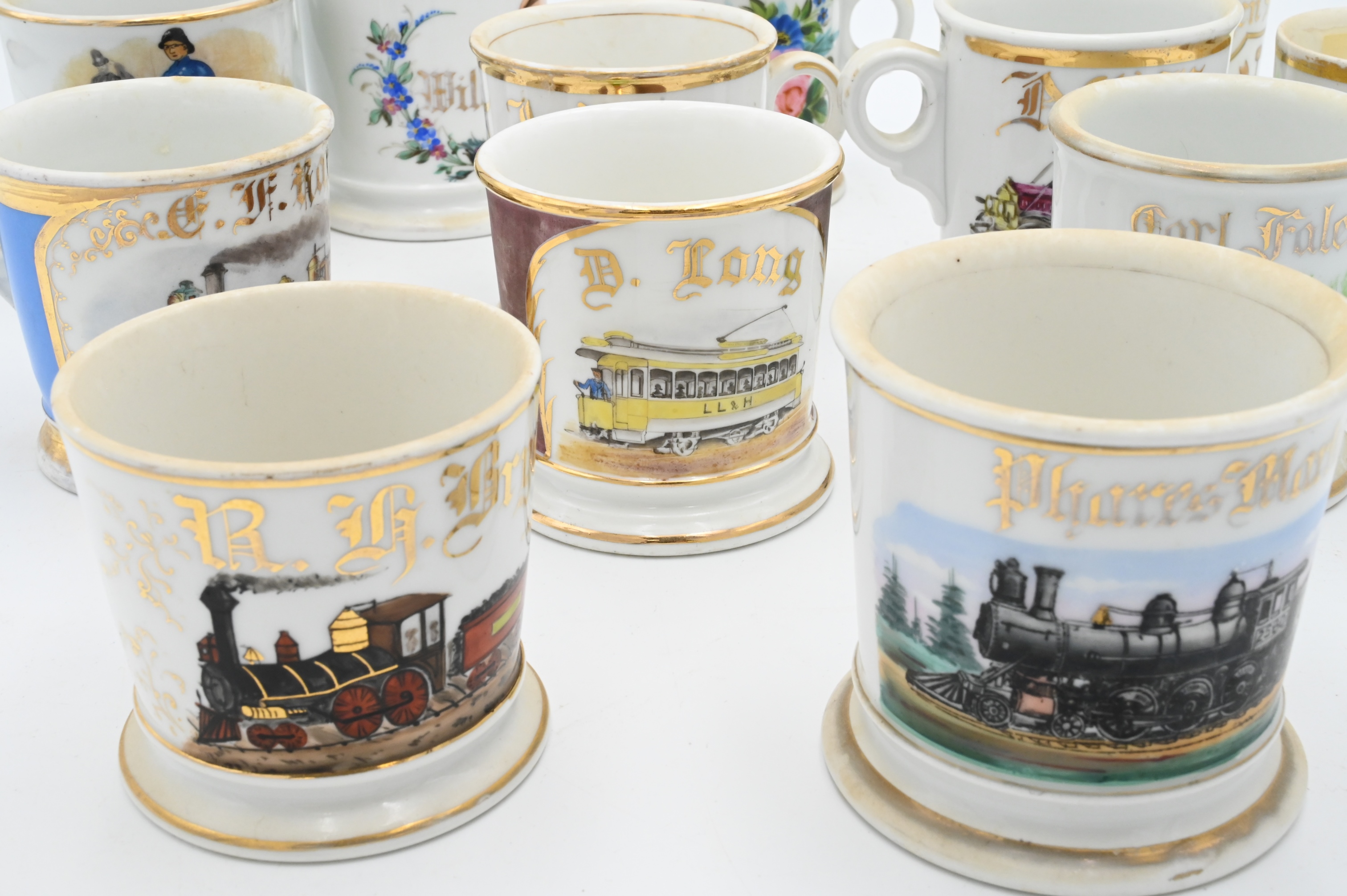 Seven Piece Group of Automobile and Locomotive Occupational Shaving Mugs, having various markings to include, T&V Limoge, Frank Doehler Rochester NY, Felda China Germany, tallest height 4 inches, diameter 3 1/2 inches, Provenance: Estate of Donald K. Huber