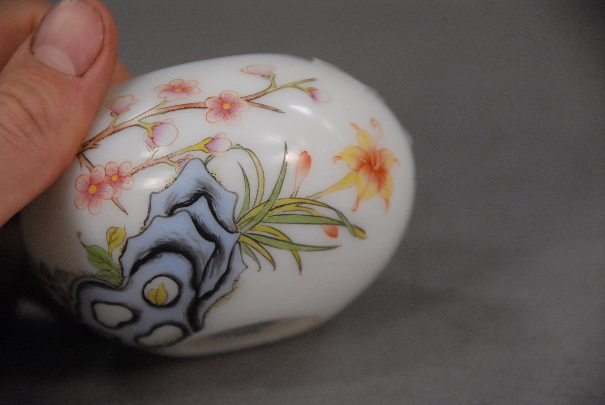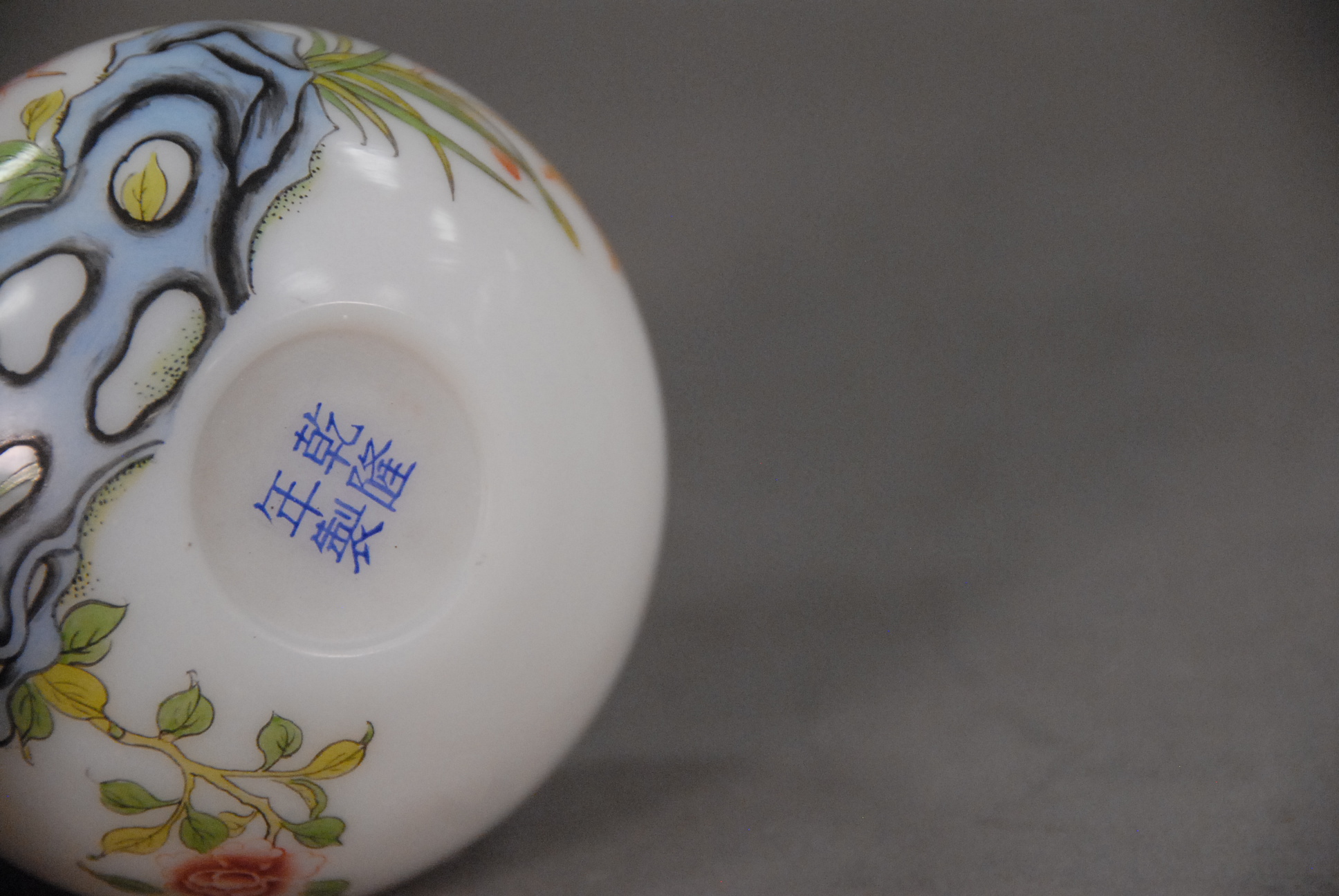 Small crystal glass bowl with painted landscape and scrolling tree.