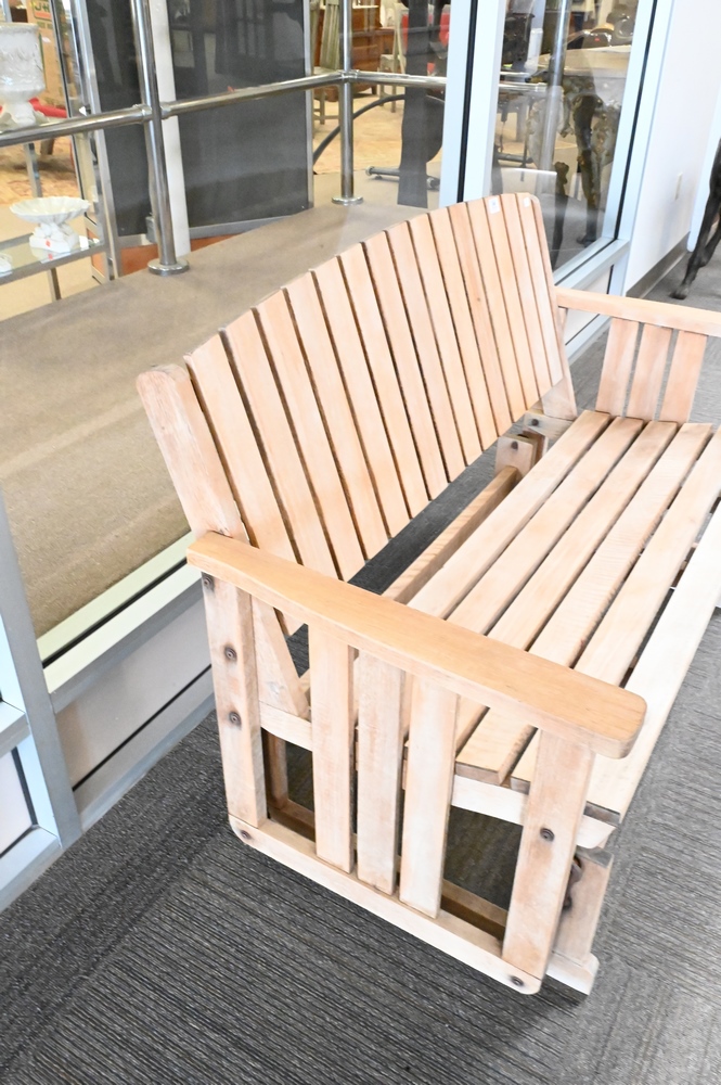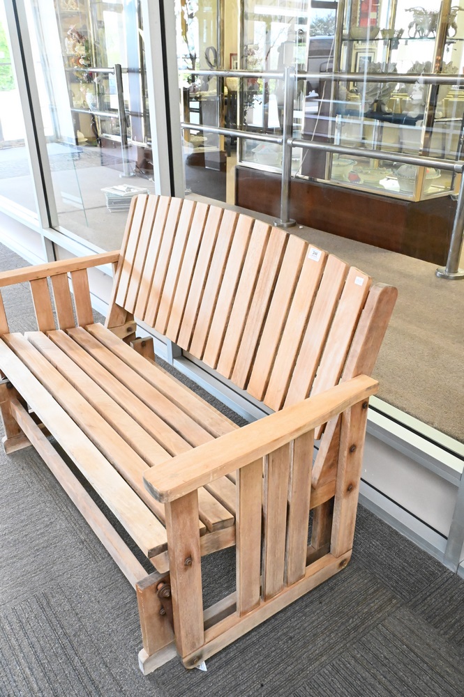 Teak Outdoor Glider Bench, height 34 inches, width 51 1/2 inches.