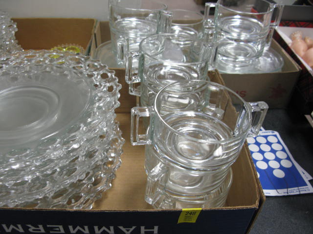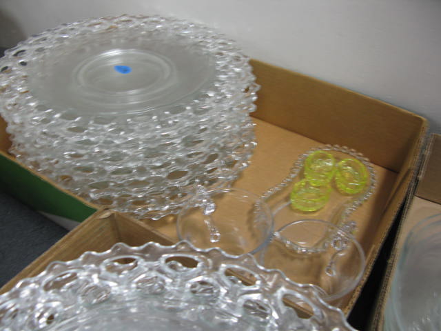 Three boxes of glassware to include glass plates, reticulated borders, soup bowls and under plates, etc