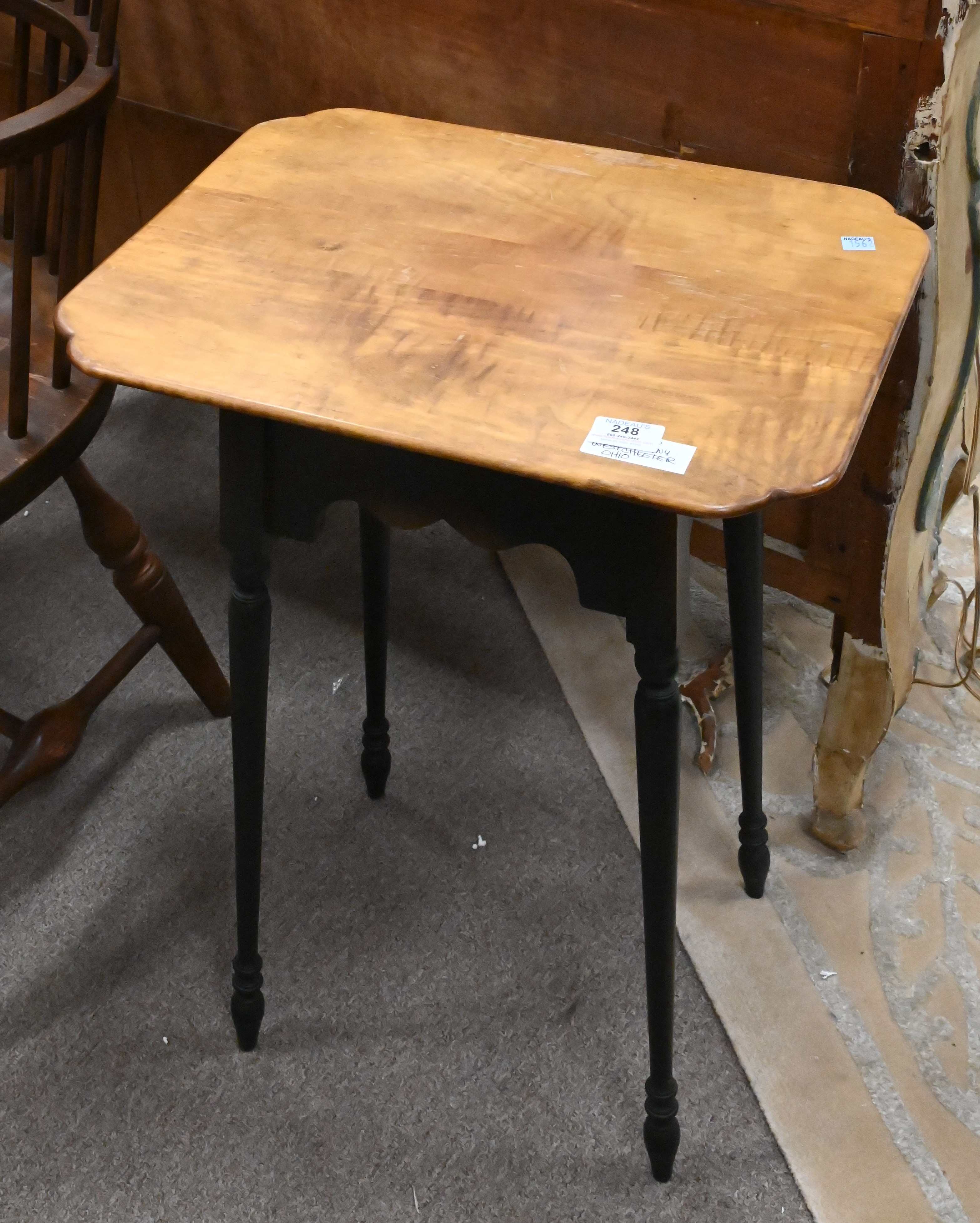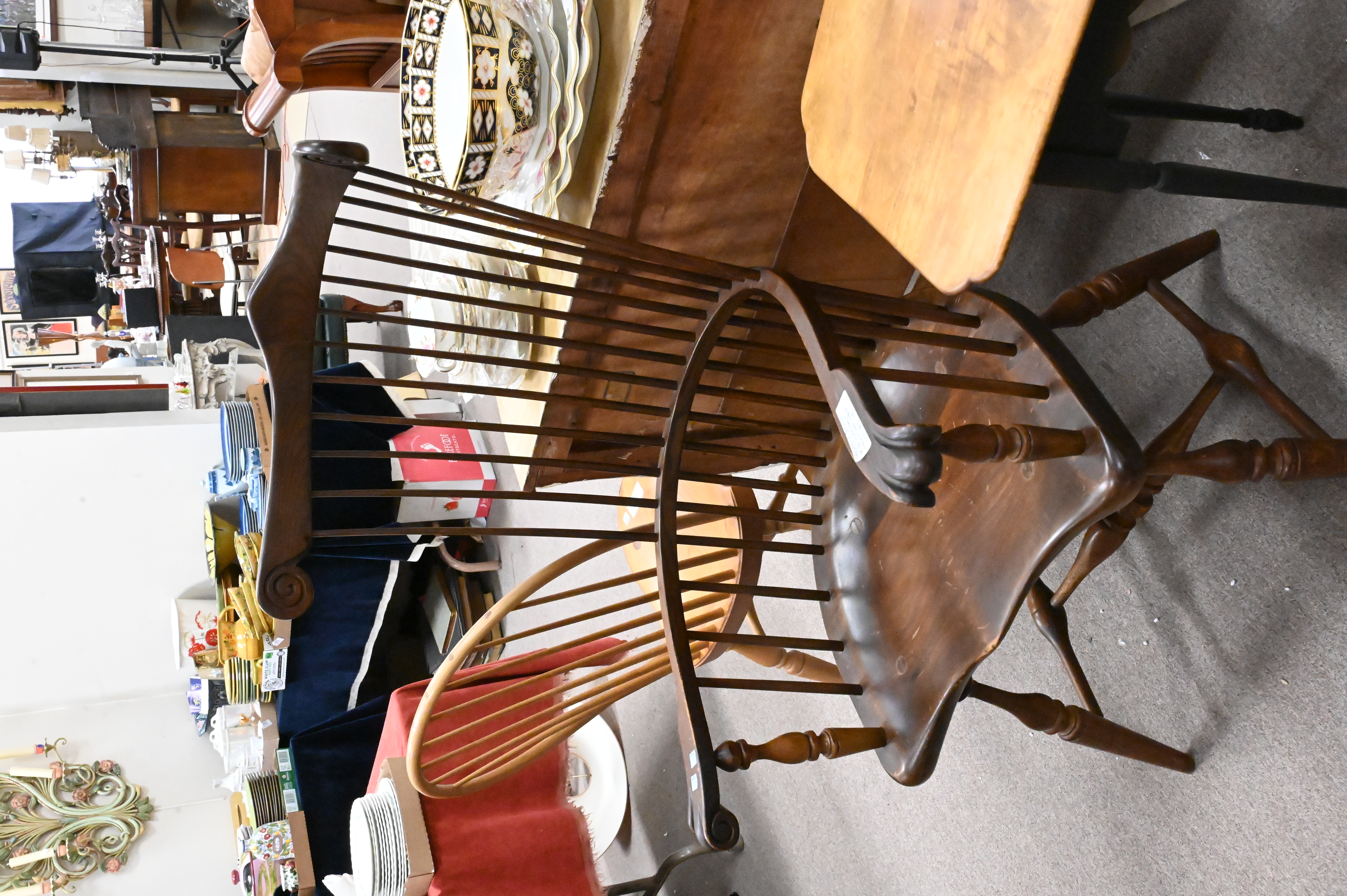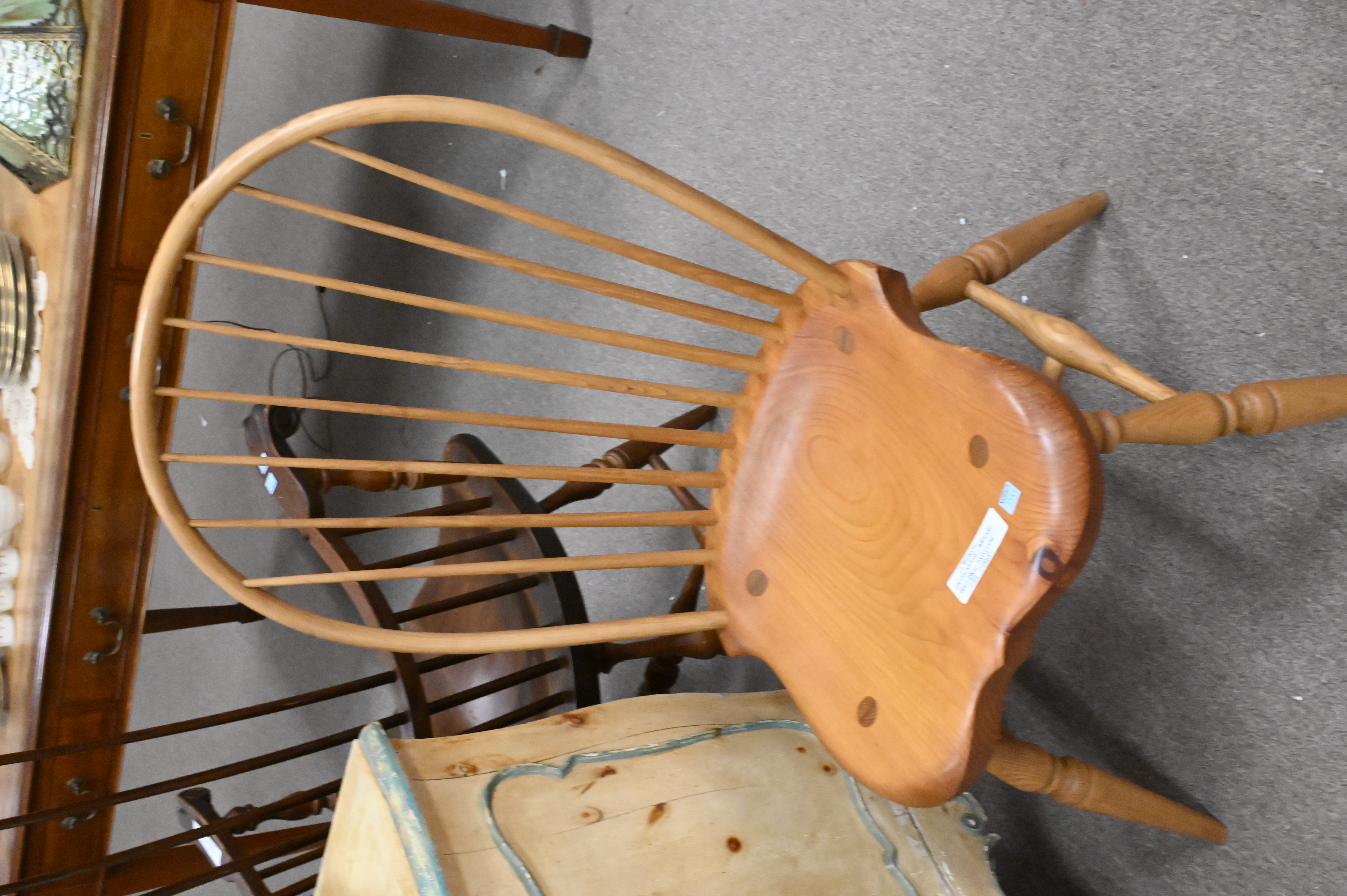 Three Piece Custom Lot, to include two Windsor chairs, one armchair signed Frederick Duckloe, a side chair signed J. Brown, Lincolnville, ME, along with a Riverbend candle stand, tallest 46 inches.