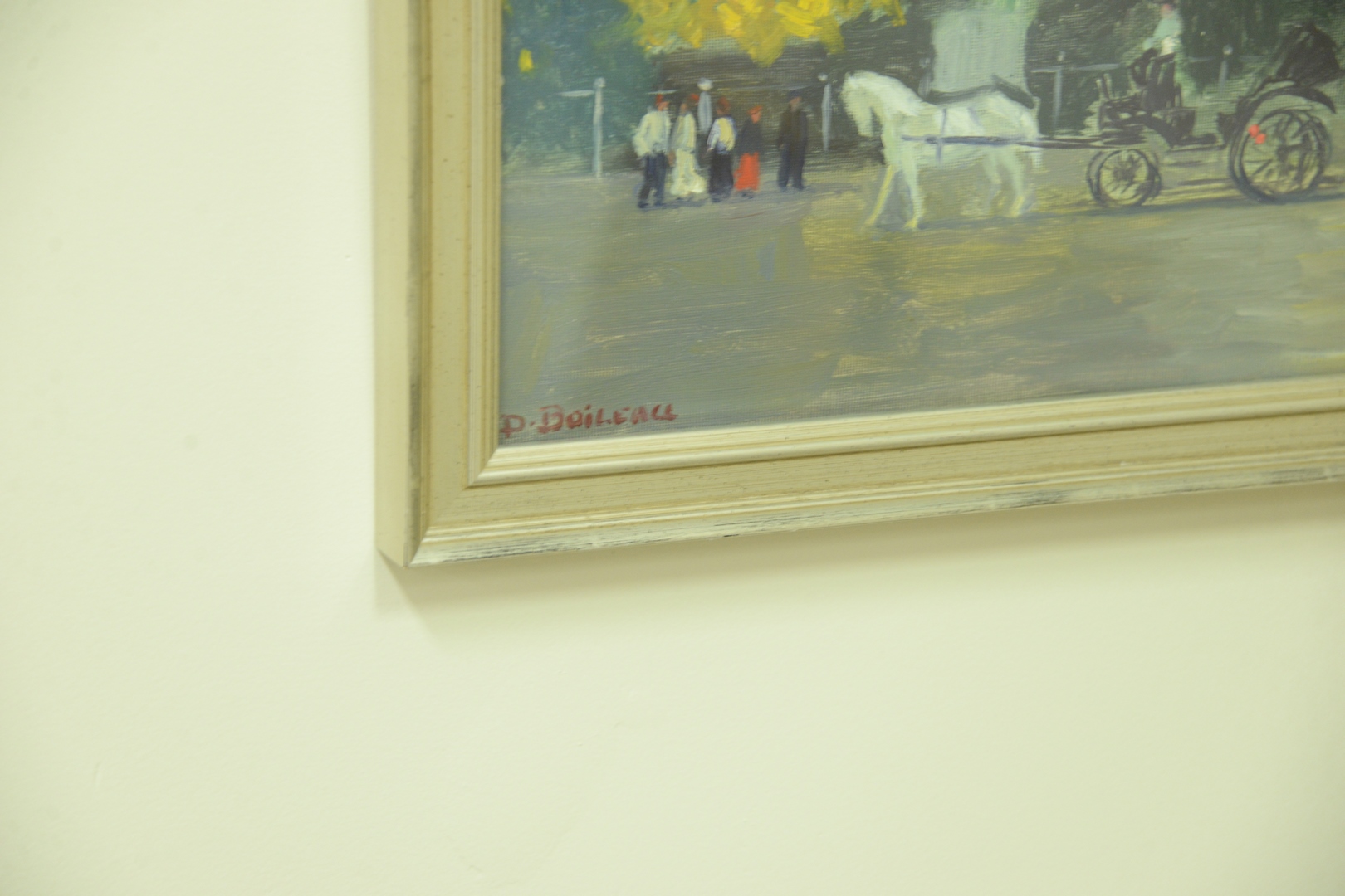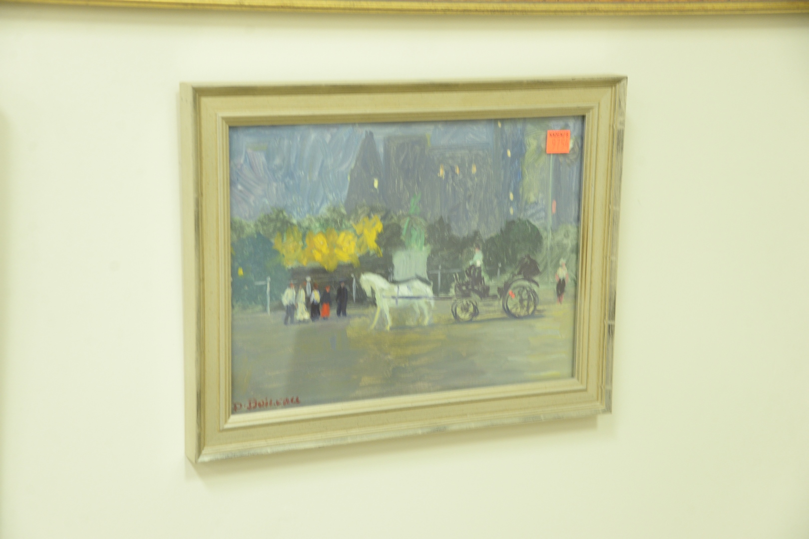 Three Piece Painting Group, to include George Marinko 1908 – 1989, village scene with building and figures, watercolor, signed lower right, 11 x 14 1/4 Dennis Boileau carriage in Central Park, oil on board along with a Japanese watercolor, Mt. Fuji, signed lower left ‘Goto’.
