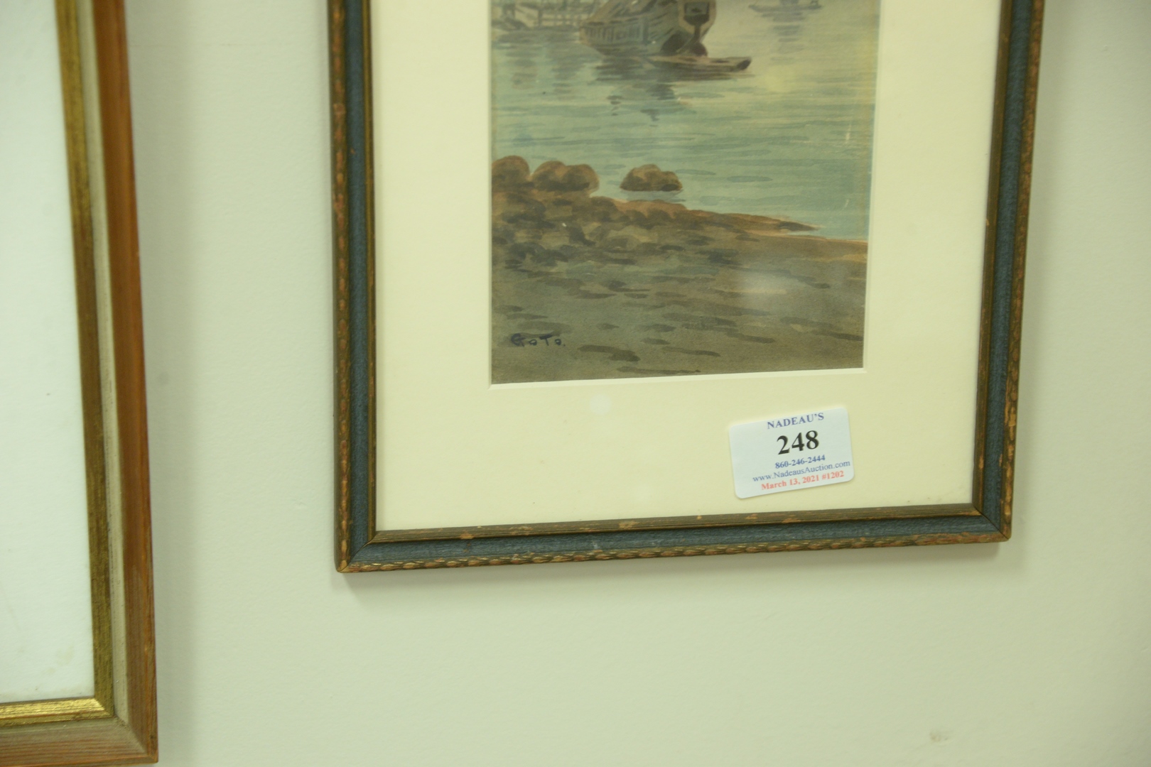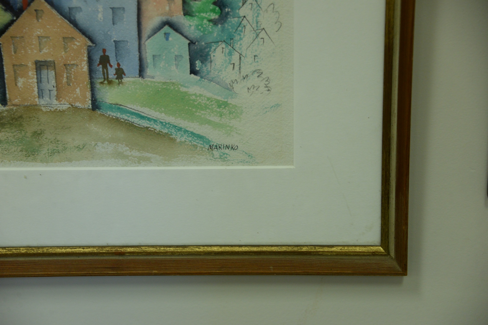 Lot 248: Three Piece Painting Group, to include George Marinko 1908 – 1989, village scene with building and figures, watercolor, signed low…