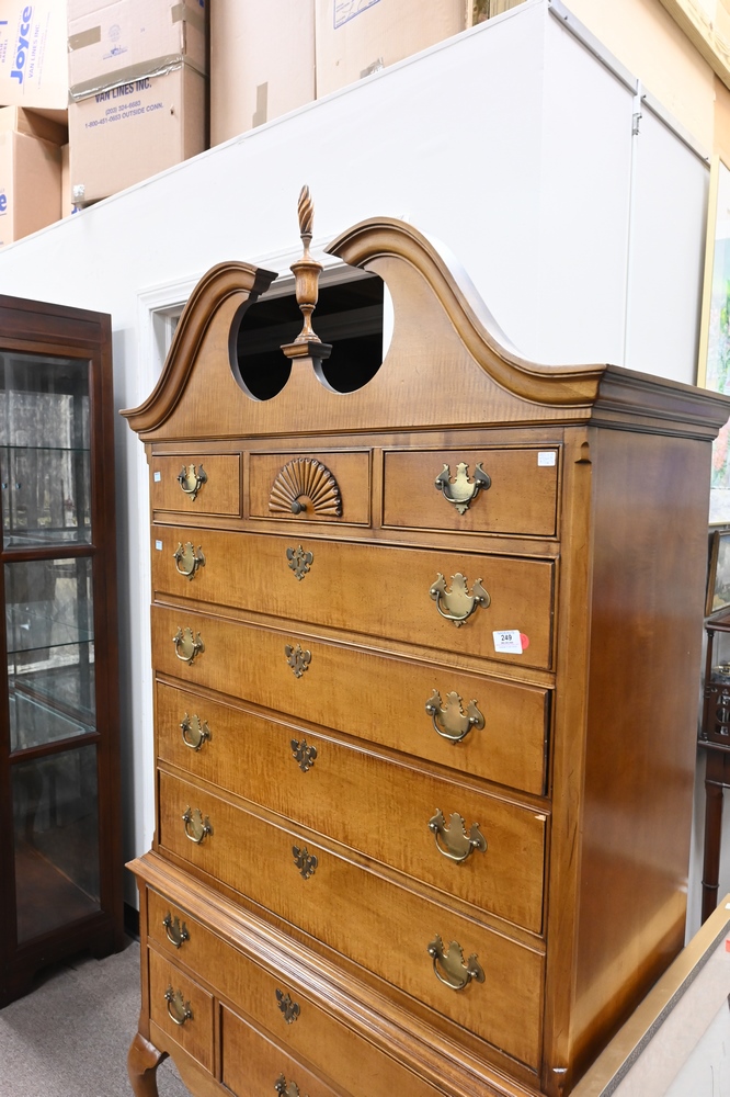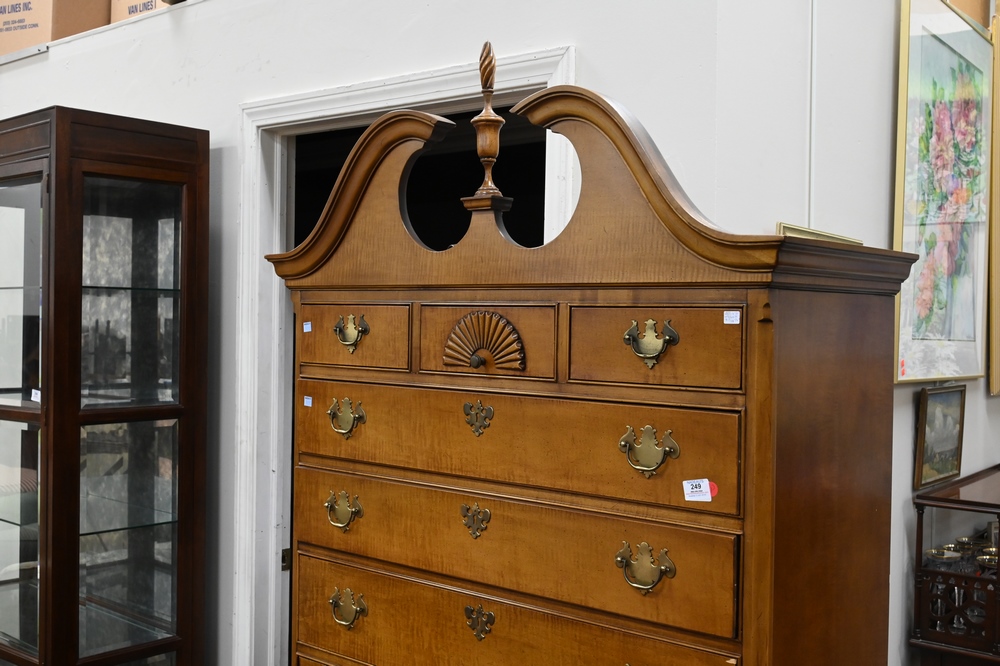 Lot 249: Chippendale Style Tiger Maple Highboy, height 75 inches, width 40 1/2 inches.