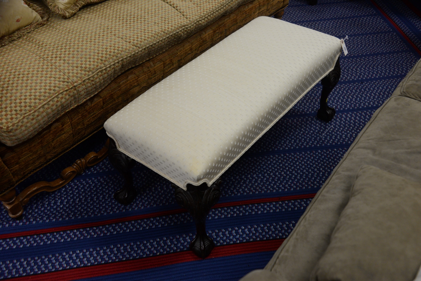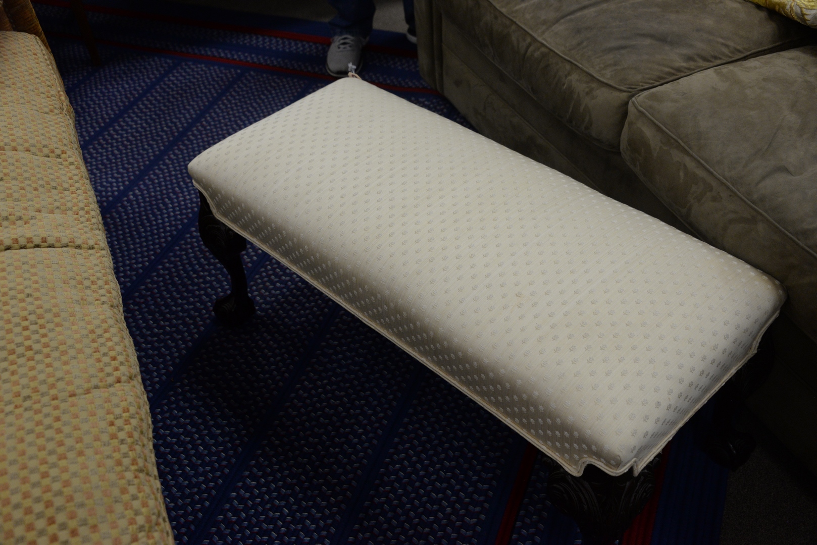 Lot 249: Chippendale Style Upholstered Bench, having ball and claw feet, height 16 inches, top 17″ x 39″.