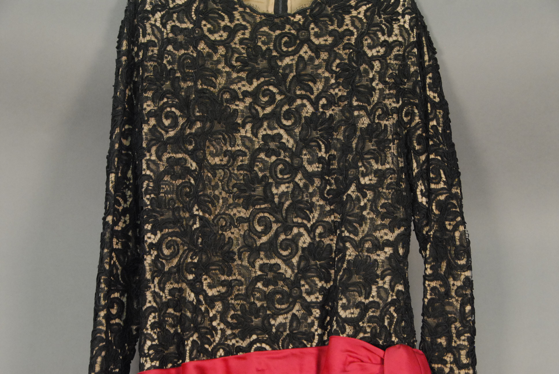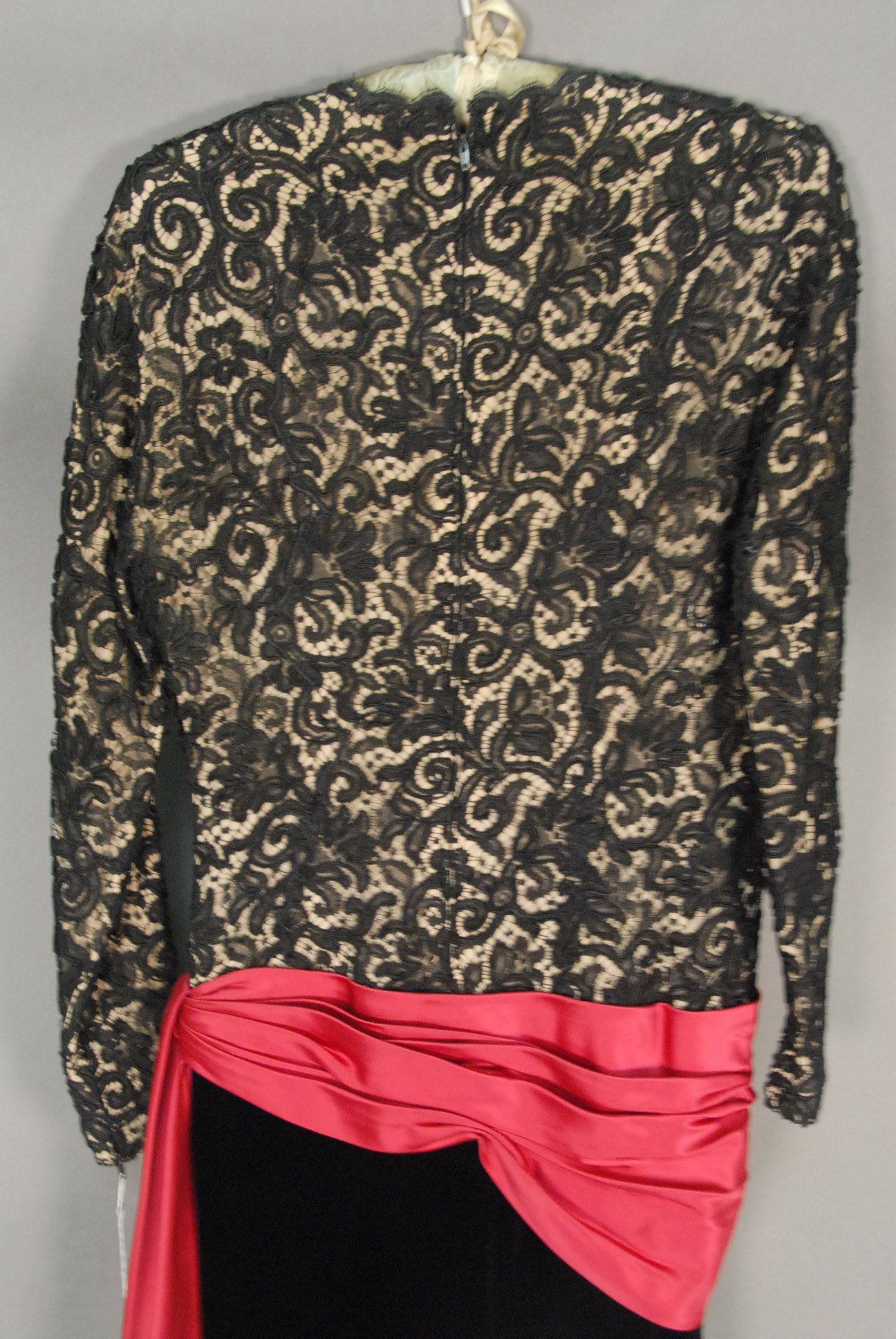 Custom evening gown having laced top and velvet and silk black and red bottom.
