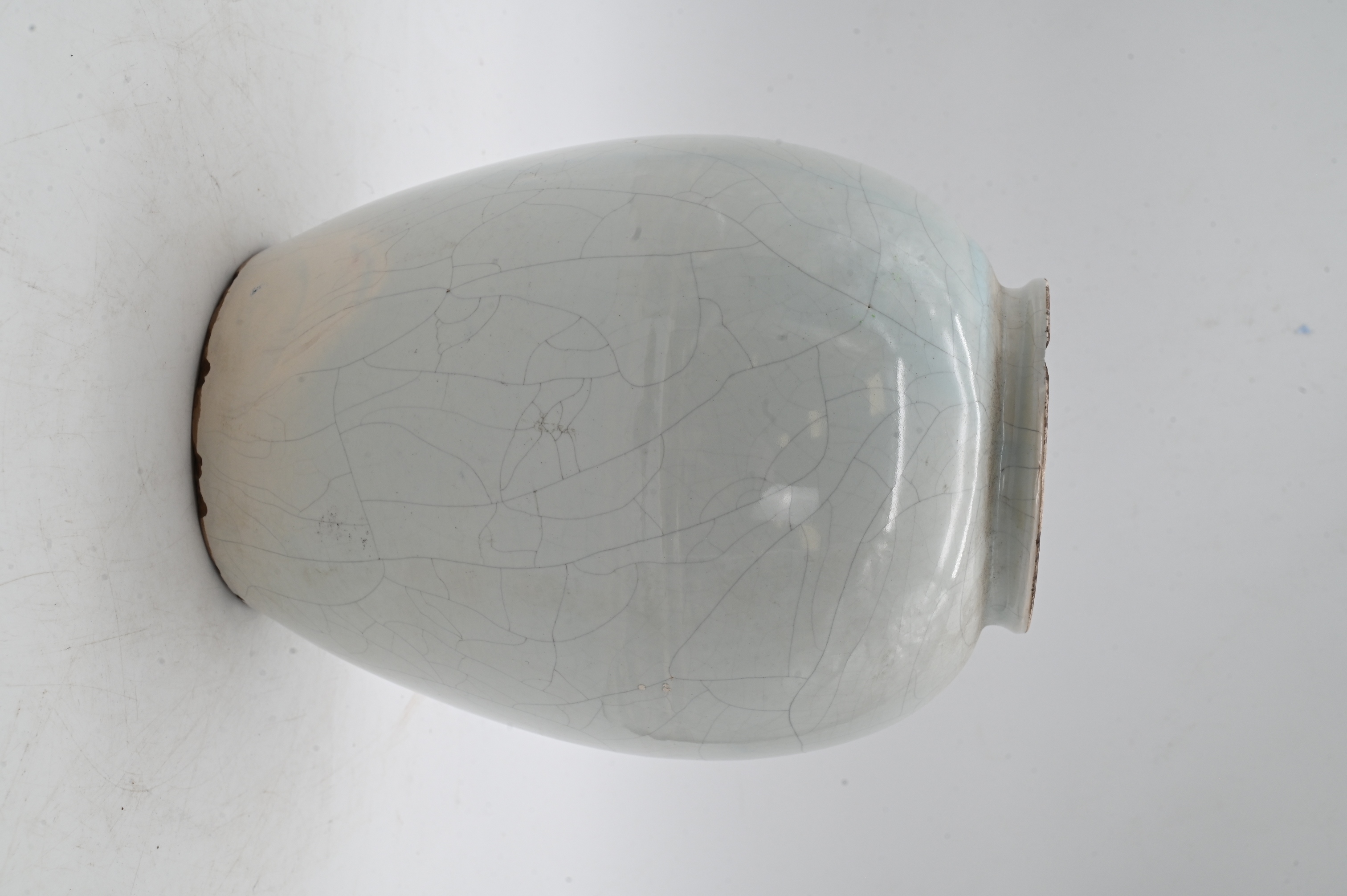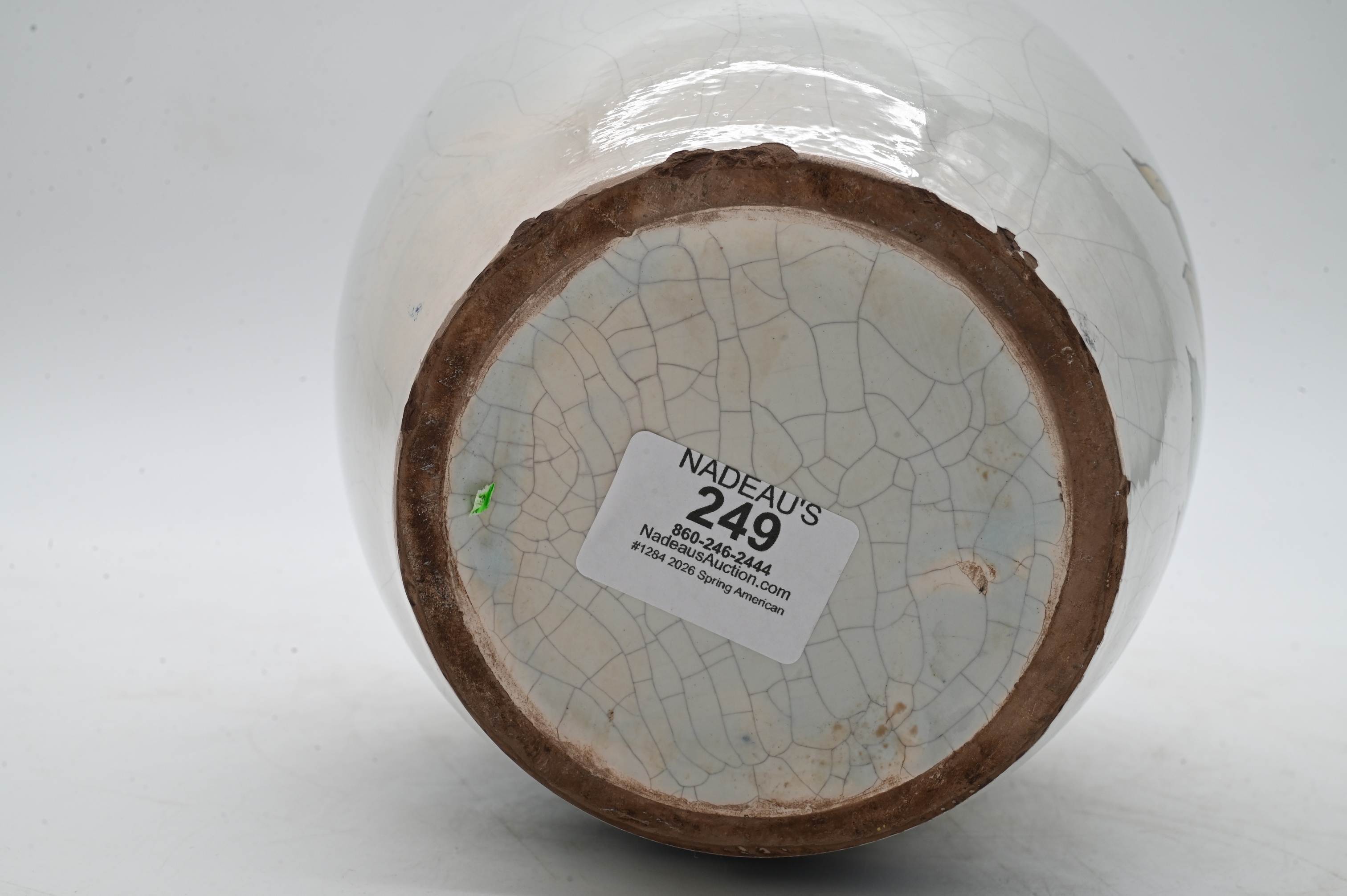 of ovoid form with everted rim and crackle glazed surface, hand-painted depicting Native figures engaged in smoking tobacco and tobacco cultivation within a landscape, labeled “Breziel,” decorated in tones of blue, green, ochre
