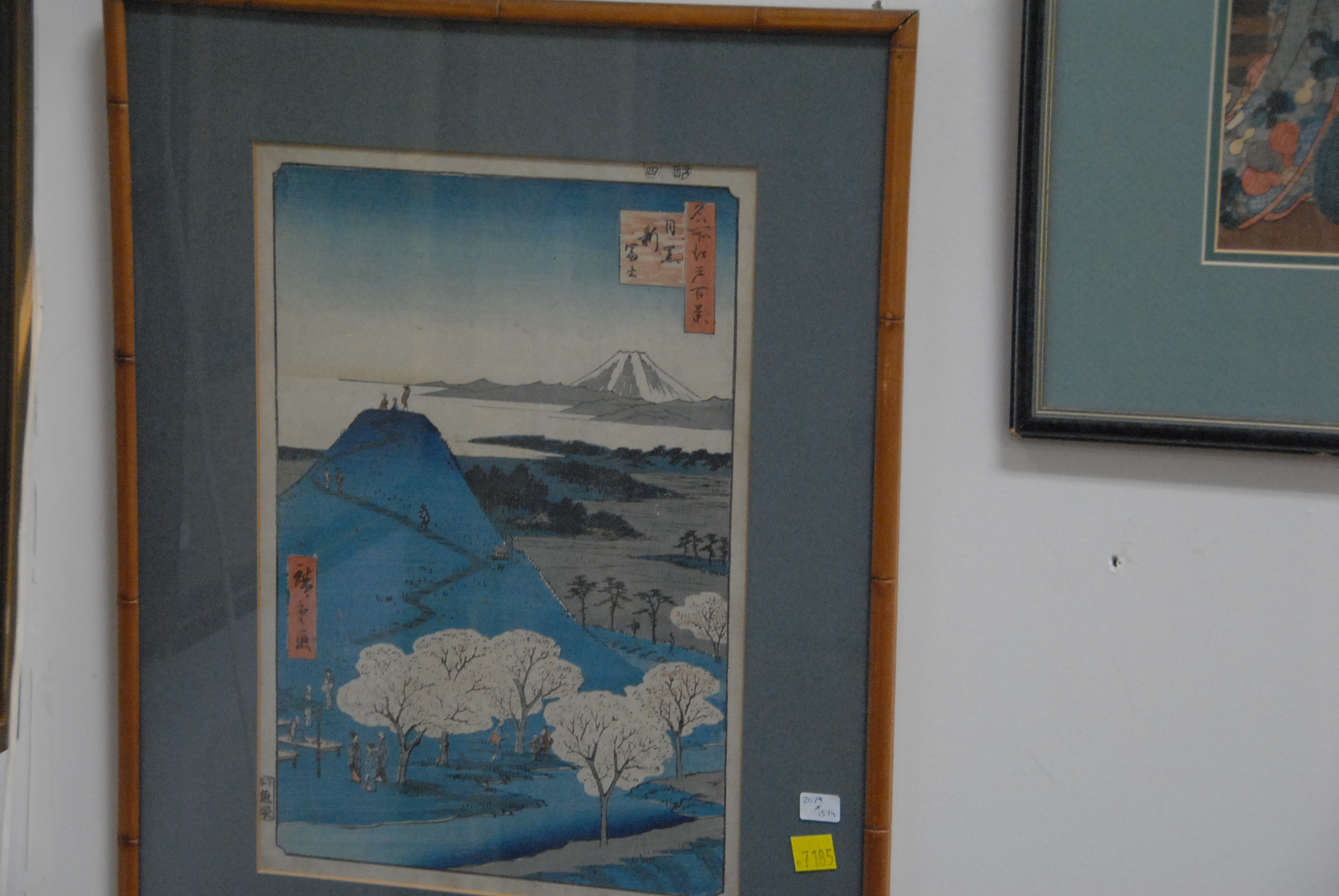 Five piece lot to include Chinese paintings on cloth and three Japanese woodblocks.