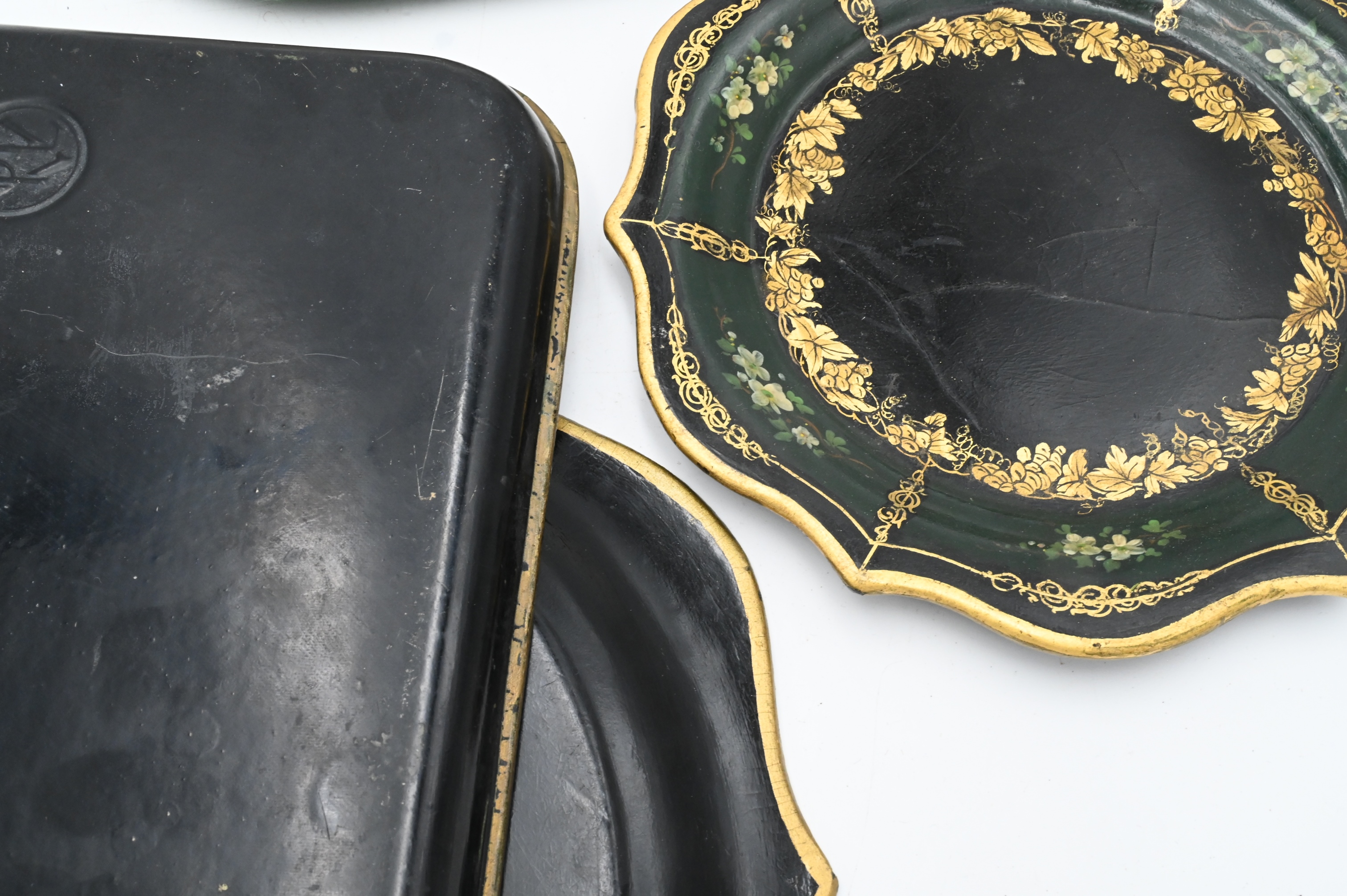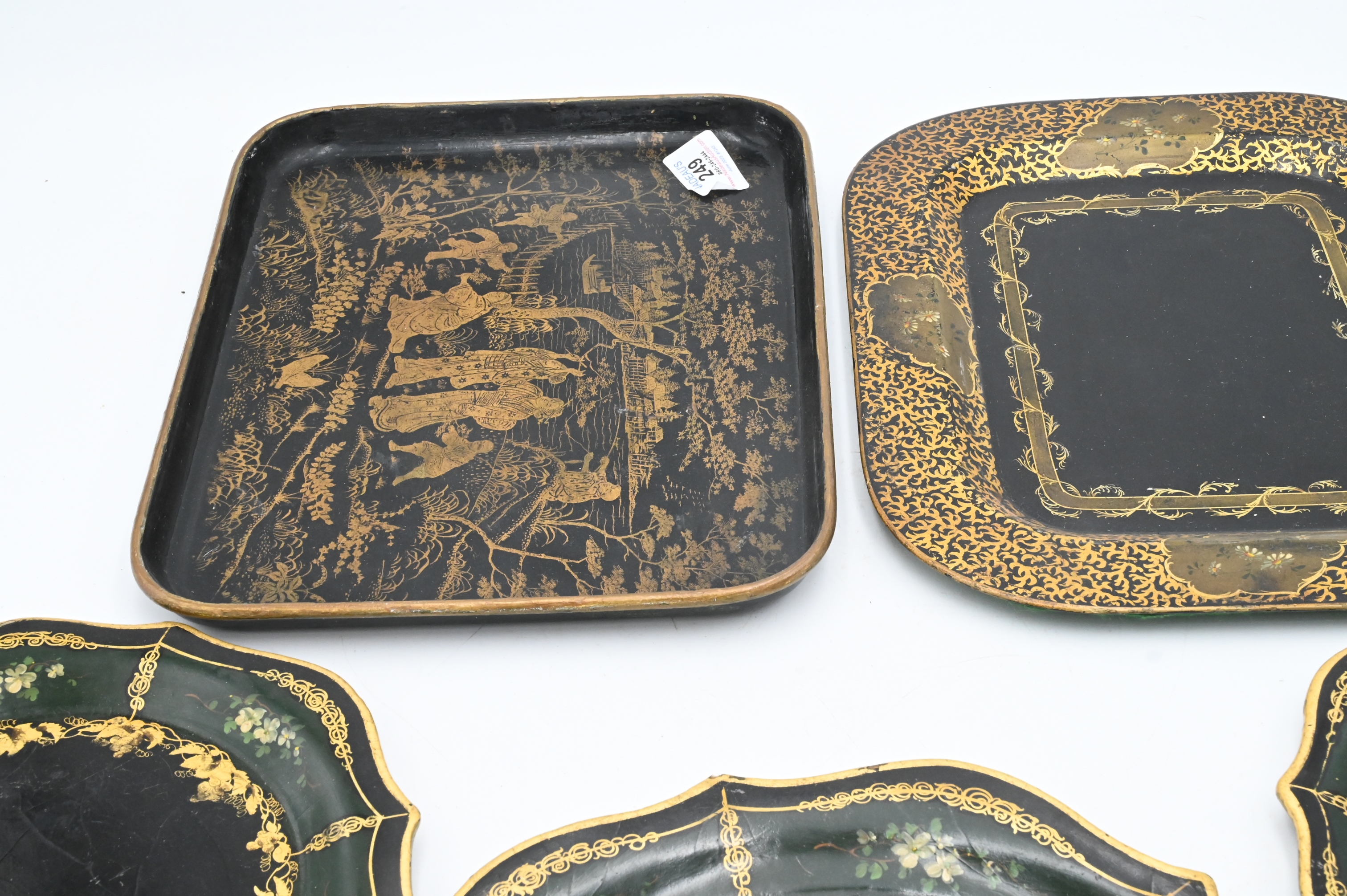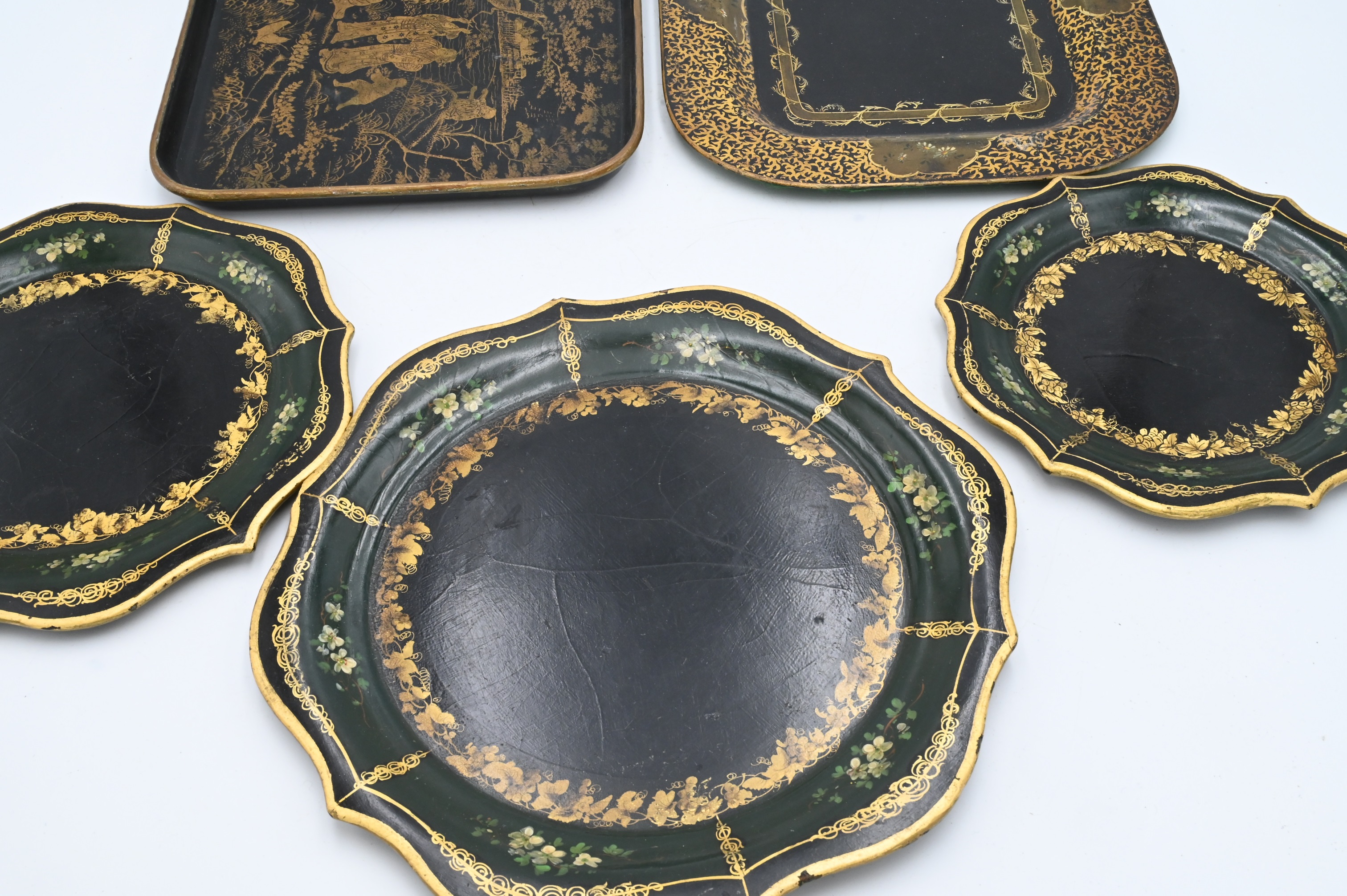 Five Piece Tray Group, to include a set of three stacking paper mache trays, having painted flowers gilt decoration, chinoiserie decorated rectangular tray, and a rectangular tray, longest 12 inches.