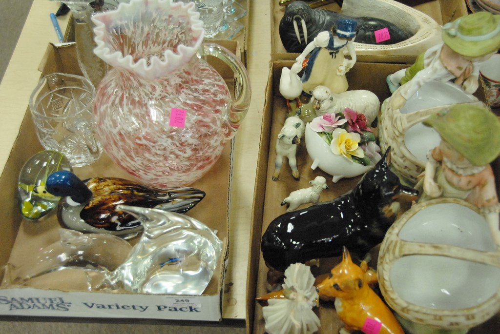 Lot 249: Four boxes of glass and china to include figures, glass animals, vases, pitchers, eskimo, seal, lion, etc.