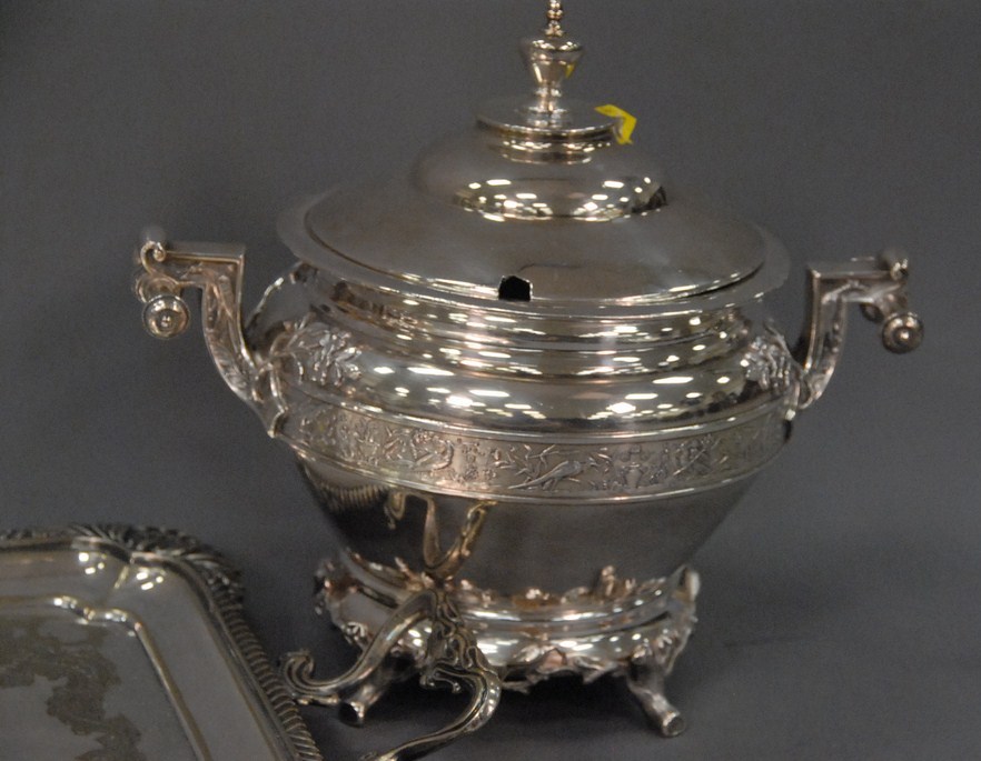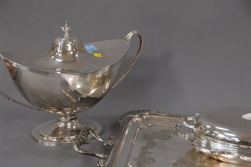 Lot 249: Four piece lot of silverplate two covered tureens, covered vegetable dish, and large tray