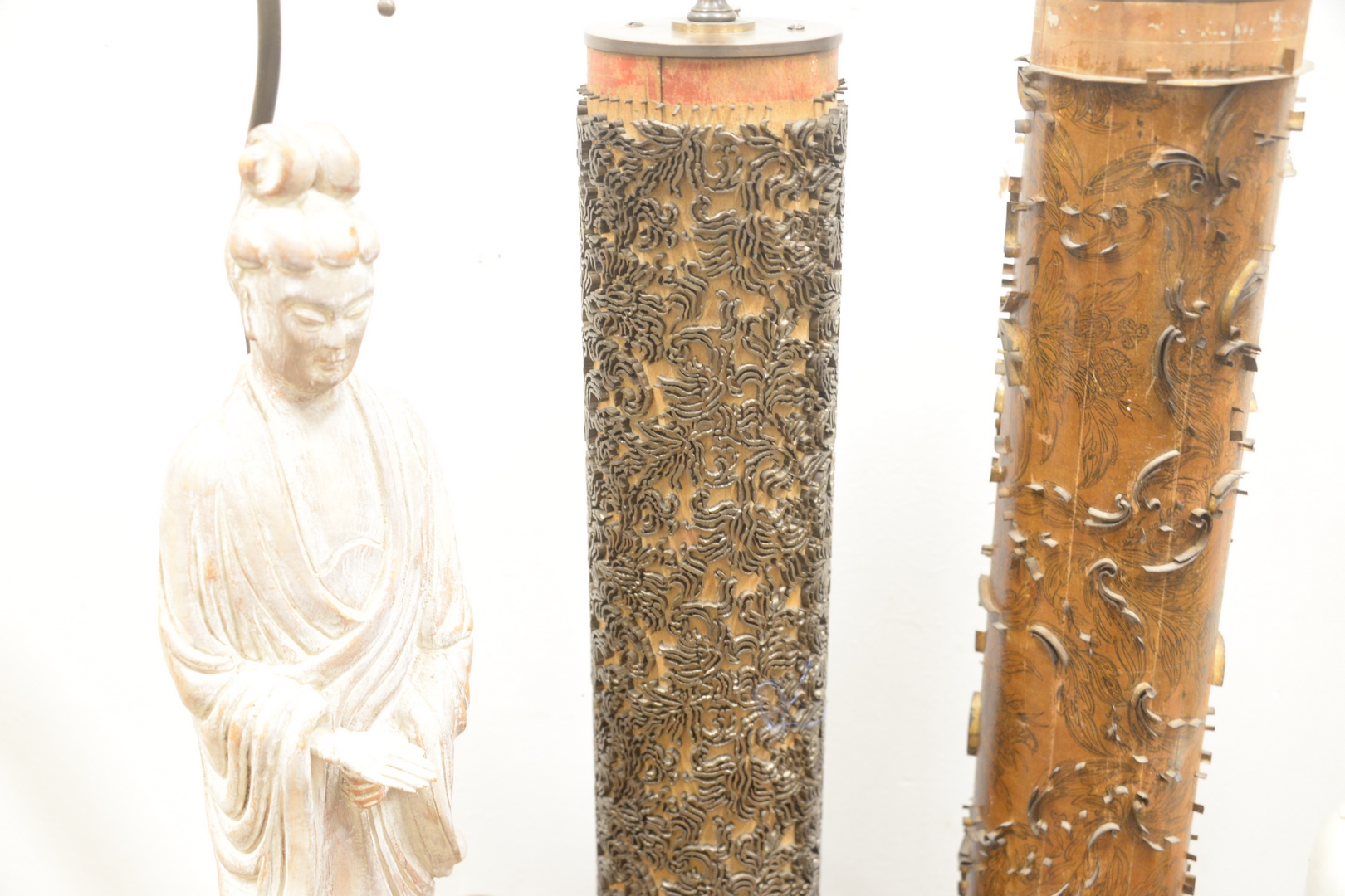 Lot 249: Group of Five Table Lamps, to include one in the form of a pagoda one whitewashed wood geisha form one vase form with female figure and beetles along with two cylindrical forms with raised metal details, height 36 1/2 inches.
