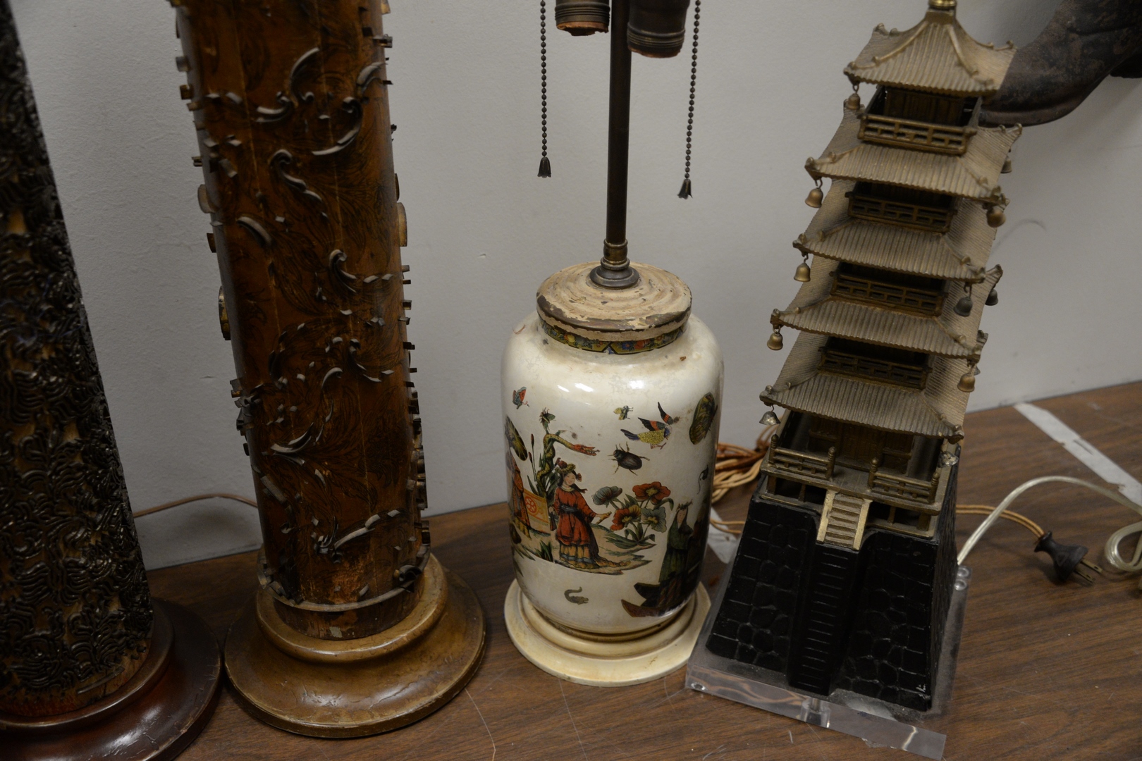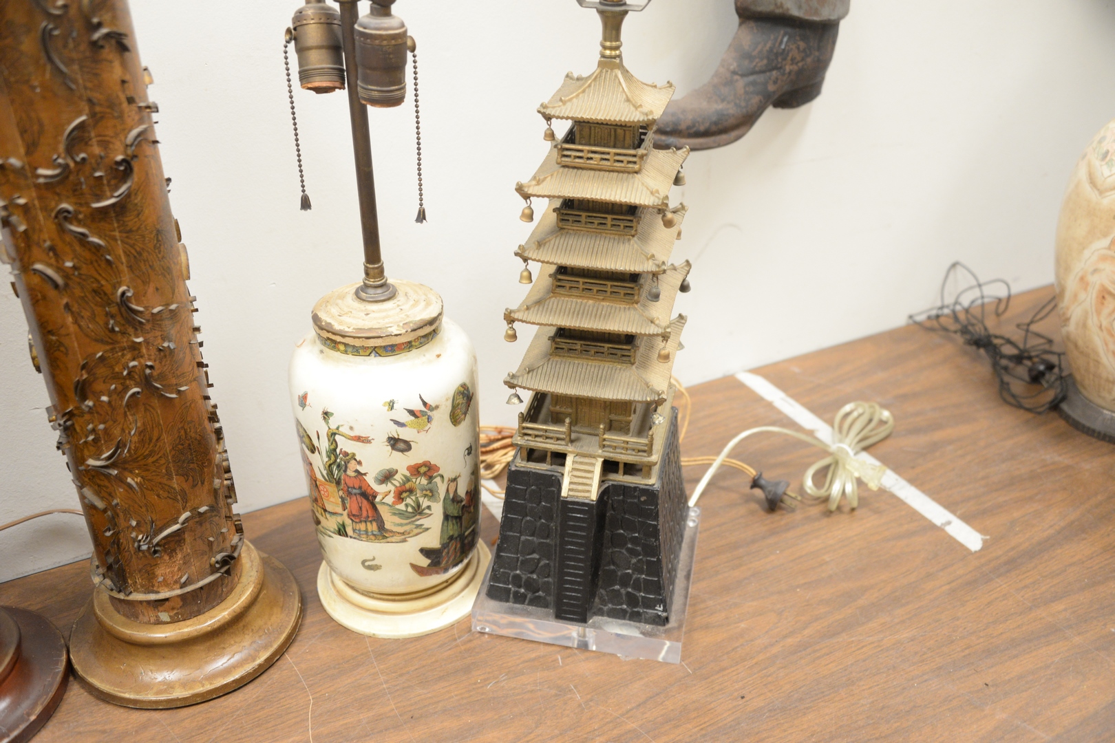 Group of Five Table Lamps, to include one in the form of a pagoda one whitewashed wood geisha form one vase form with female figure and beetles along with two cylindrical forms with raised metal details, height 36 1/2 inches.