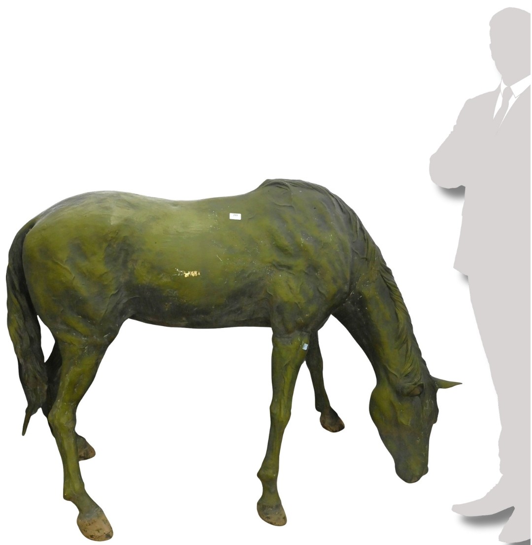 in green verdigris patina standing in grazing position, bent neck, long mane and tail, signed on leg Jim Davidson
