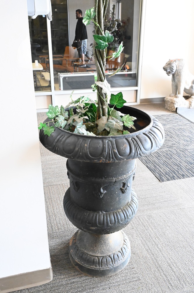 Pair of Iron Urns on Round Bases, height 35 inches, inside diameter 18 1/2 inches.