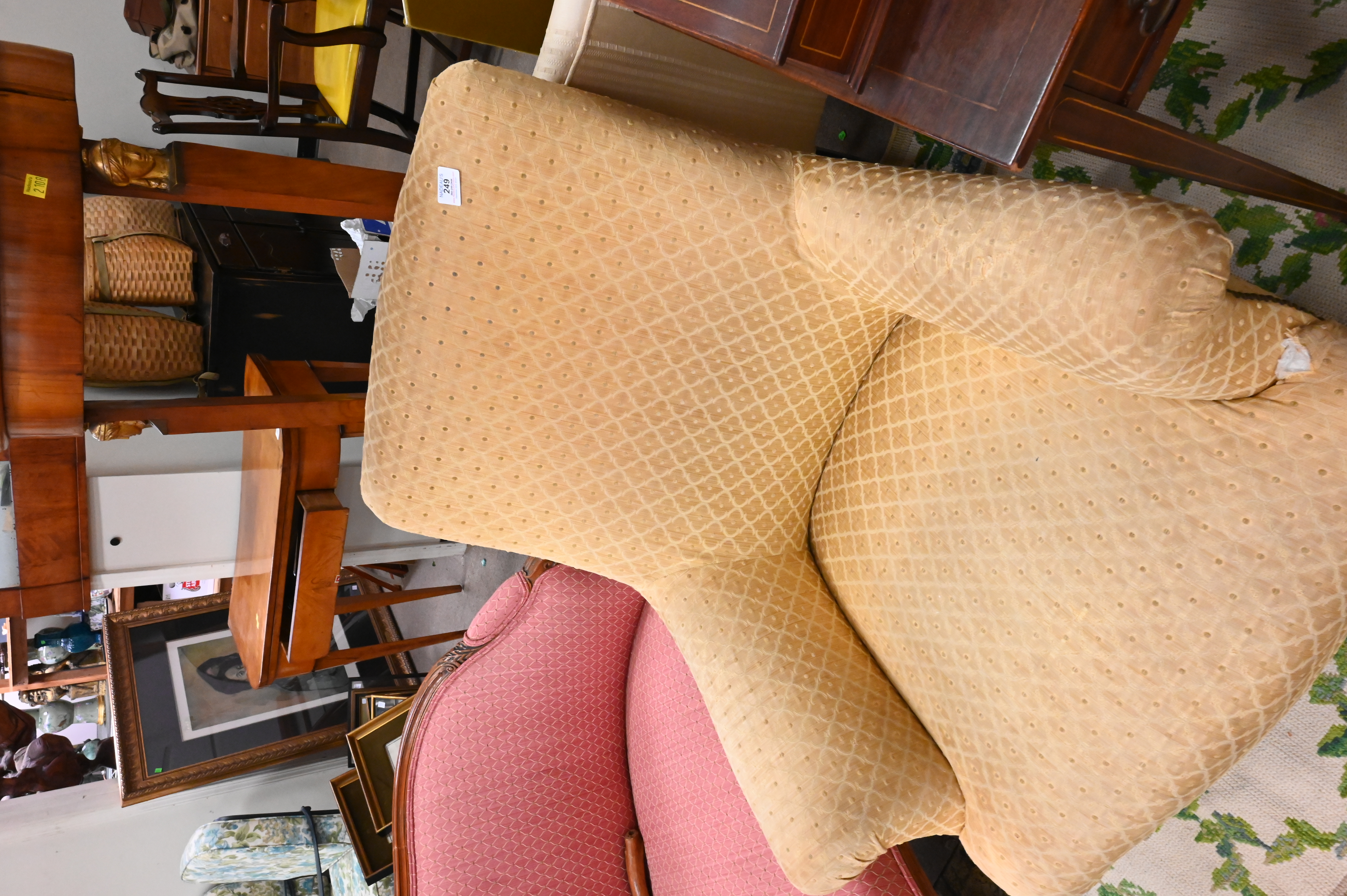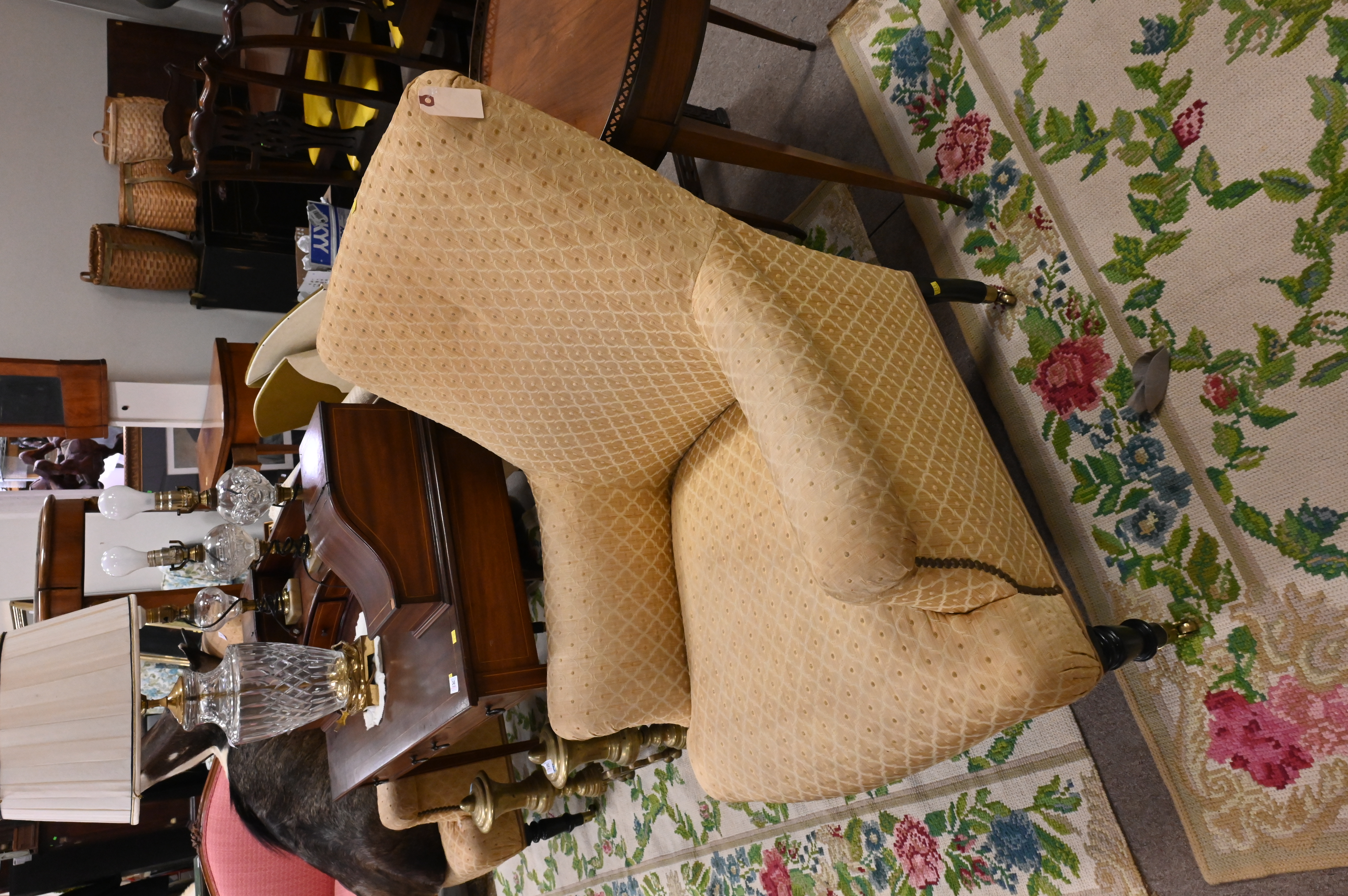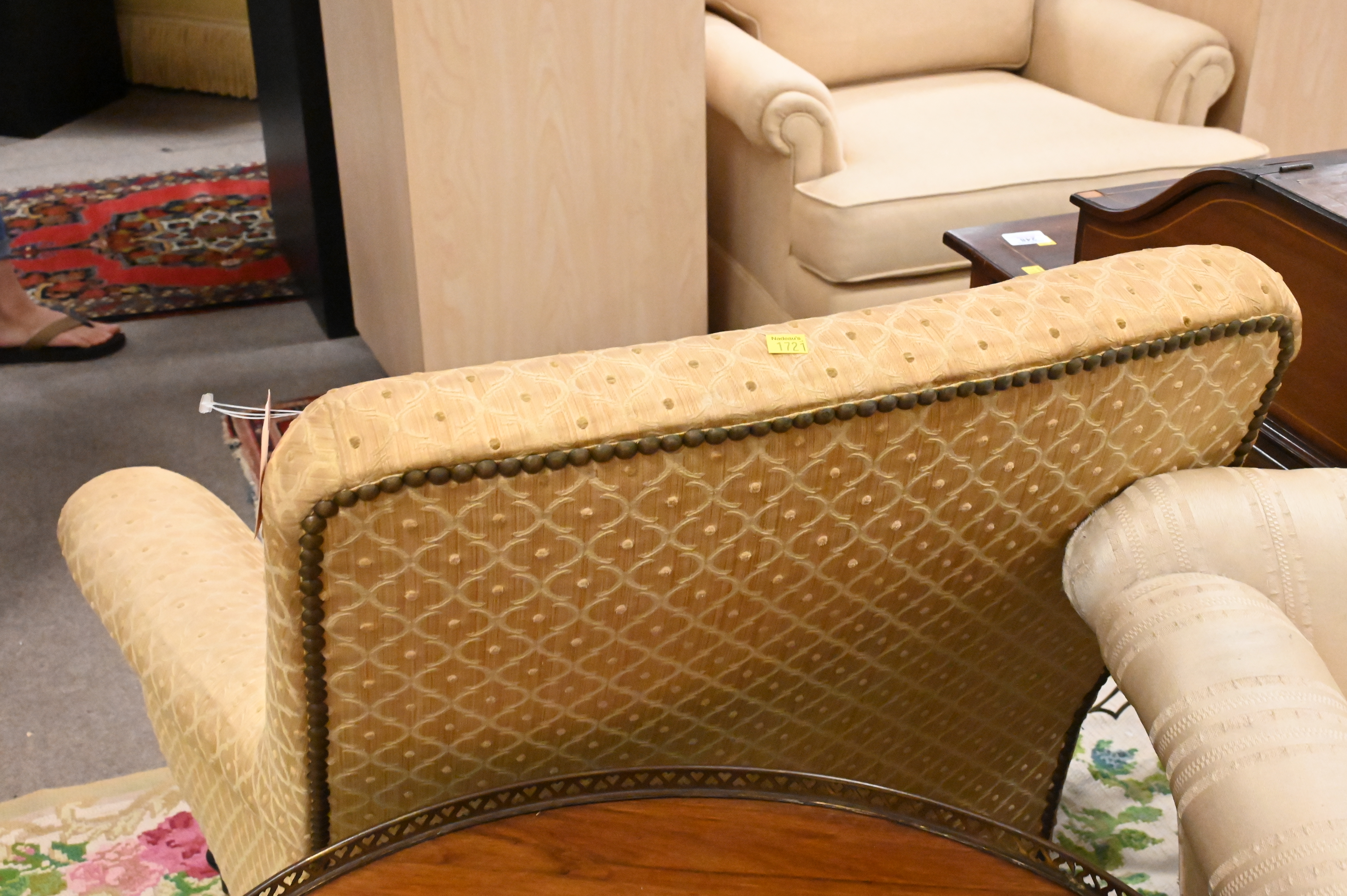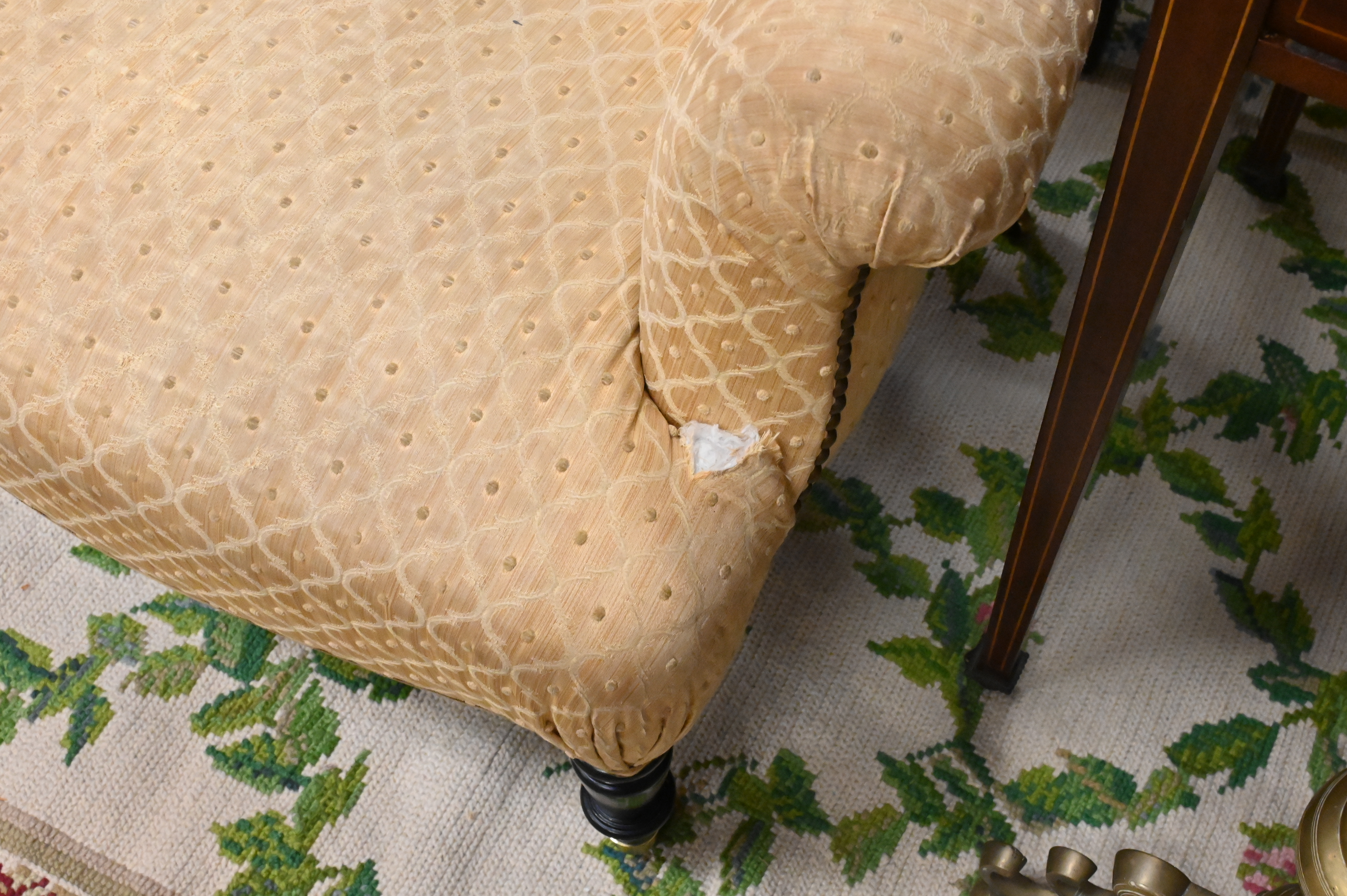 Pair of Upholstered Arm Chairs, on turned legs with brass casters, height 38 inches, width 33 inches.