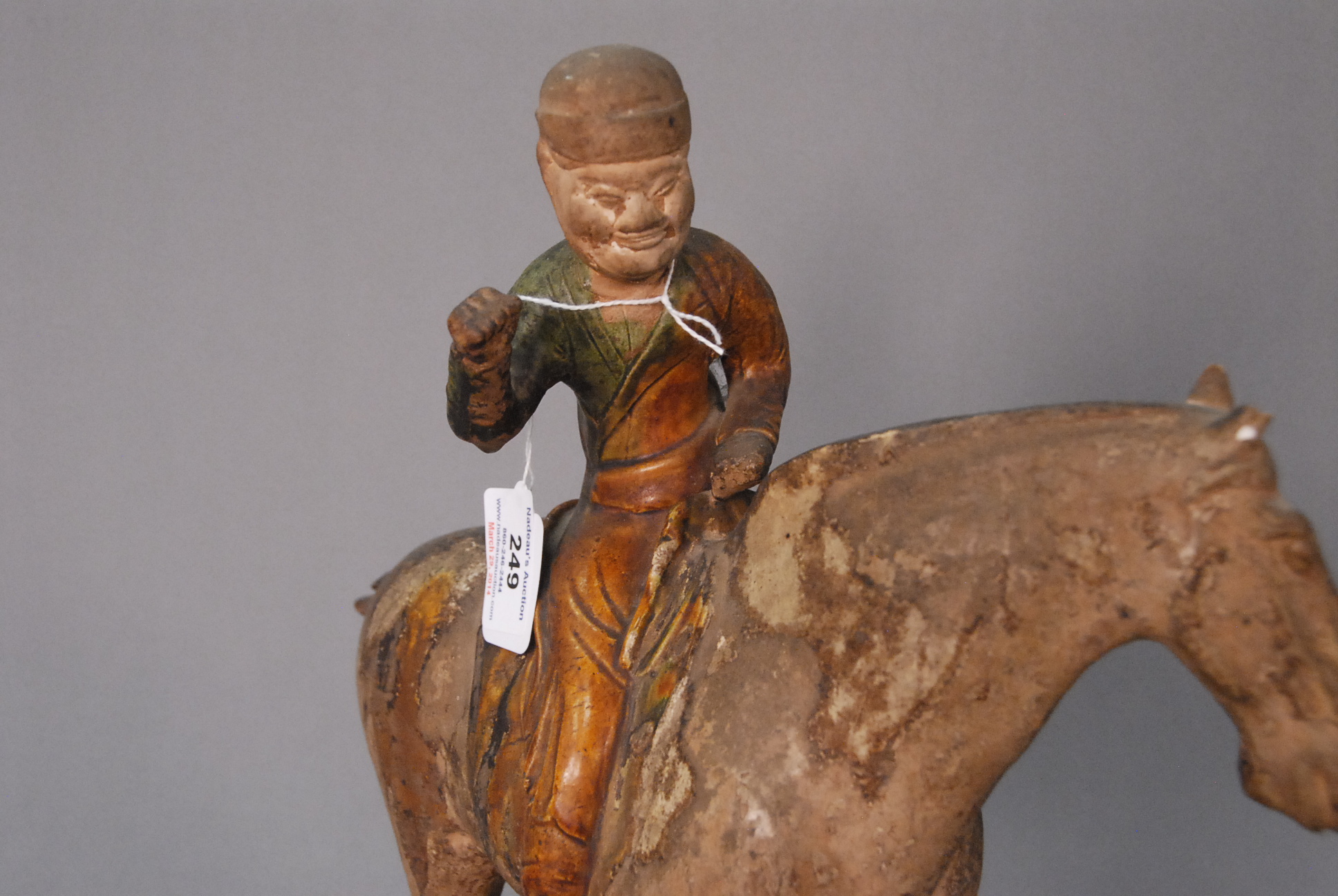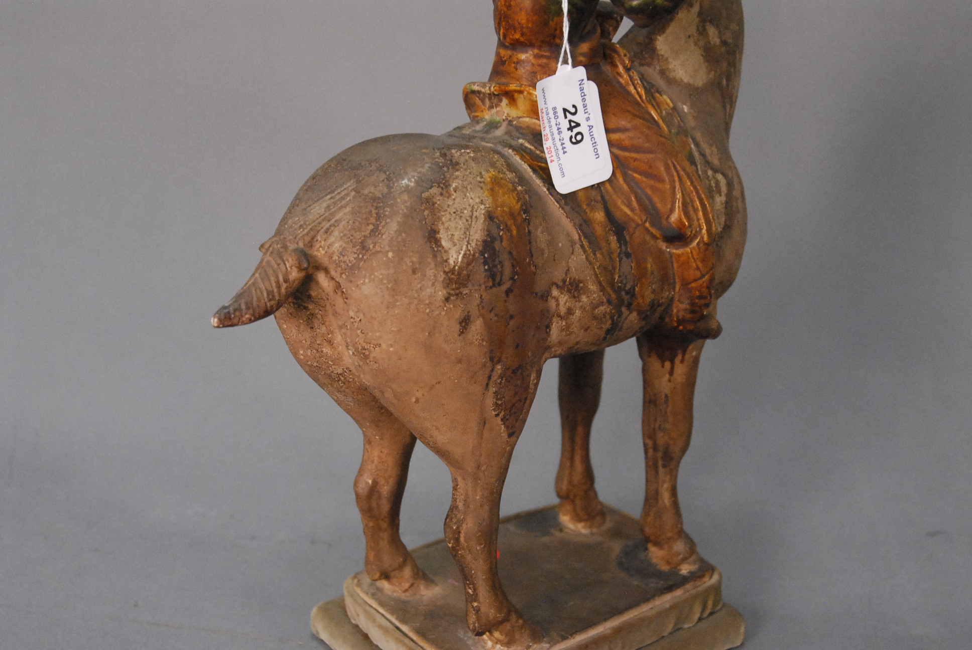 Lot 249: Pottery horse and rider in Tang-style with sancai glaze, China, 19th century. ht. 15in.