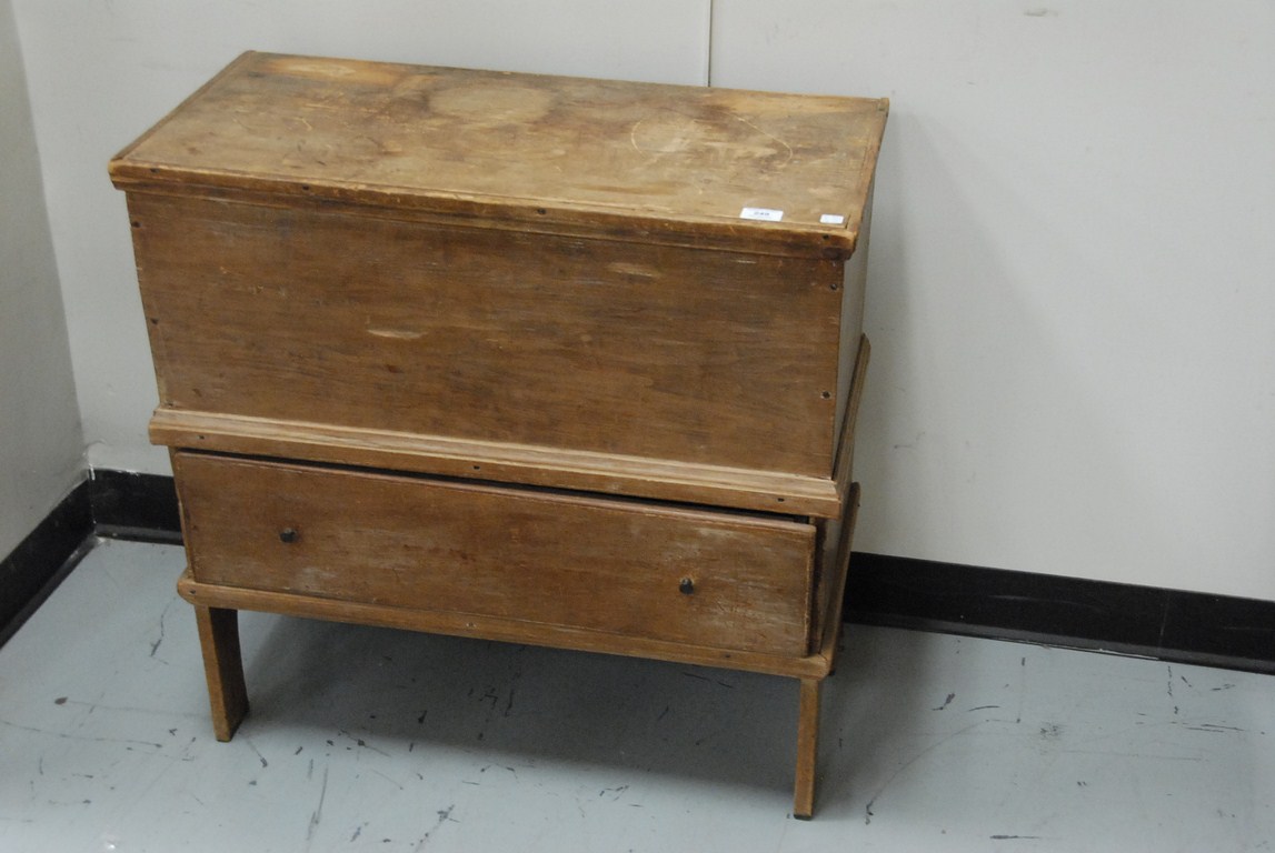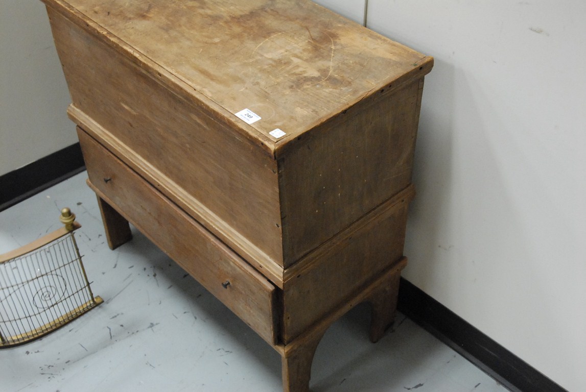 Lot 249: Primitive diminutive blanket chest with lift top and one drawer on bootjack ends.ht. 29in. wd. 30in. dp. 15in.