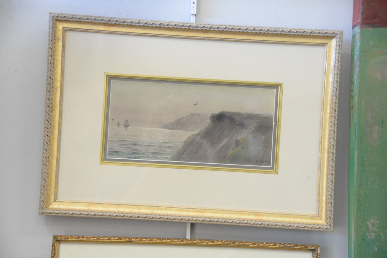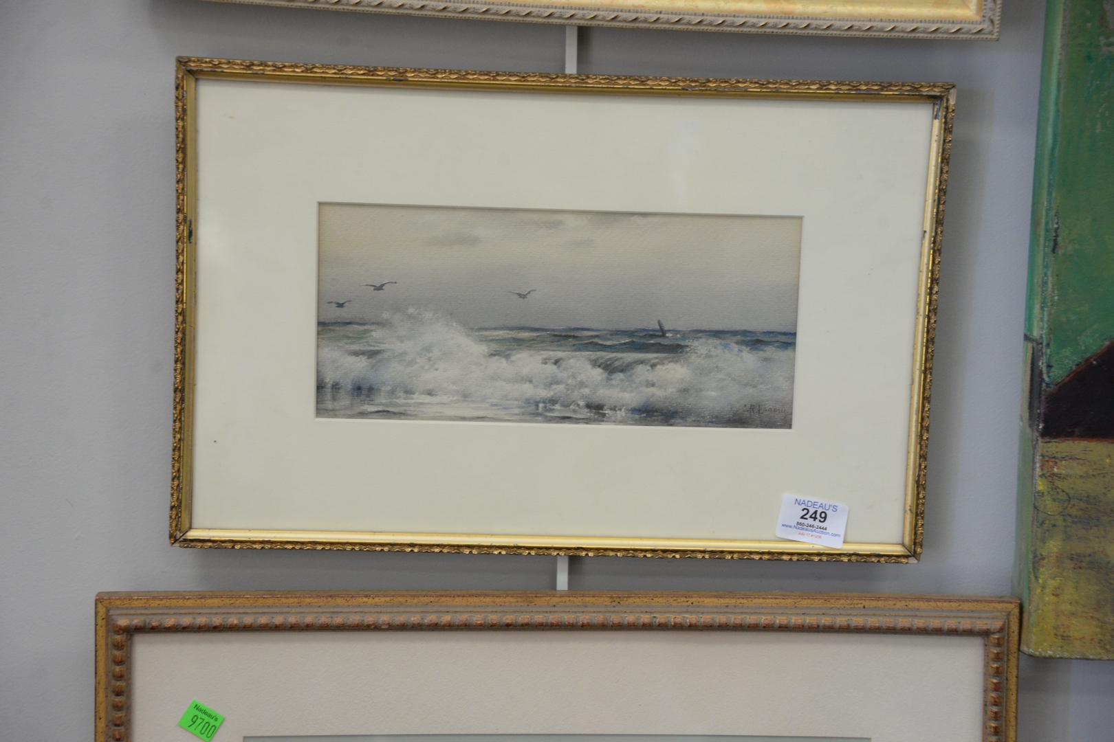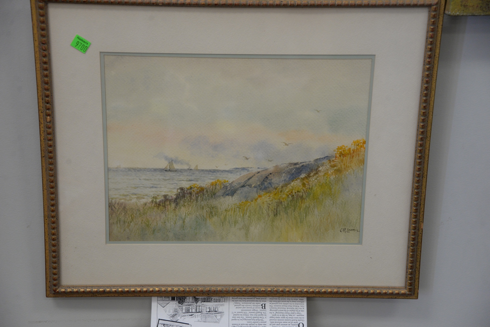 Lot 249: Three Charles Russell Loomis (American, 1857 – 1936), each watercolor on paper, each depicting coastal scenes with flying shore birds, each signed lower right “C.R. Loomis”, sight size of largest 10 1/4″ x 13 1/4″. Provenance: Estate of James Wadhams.