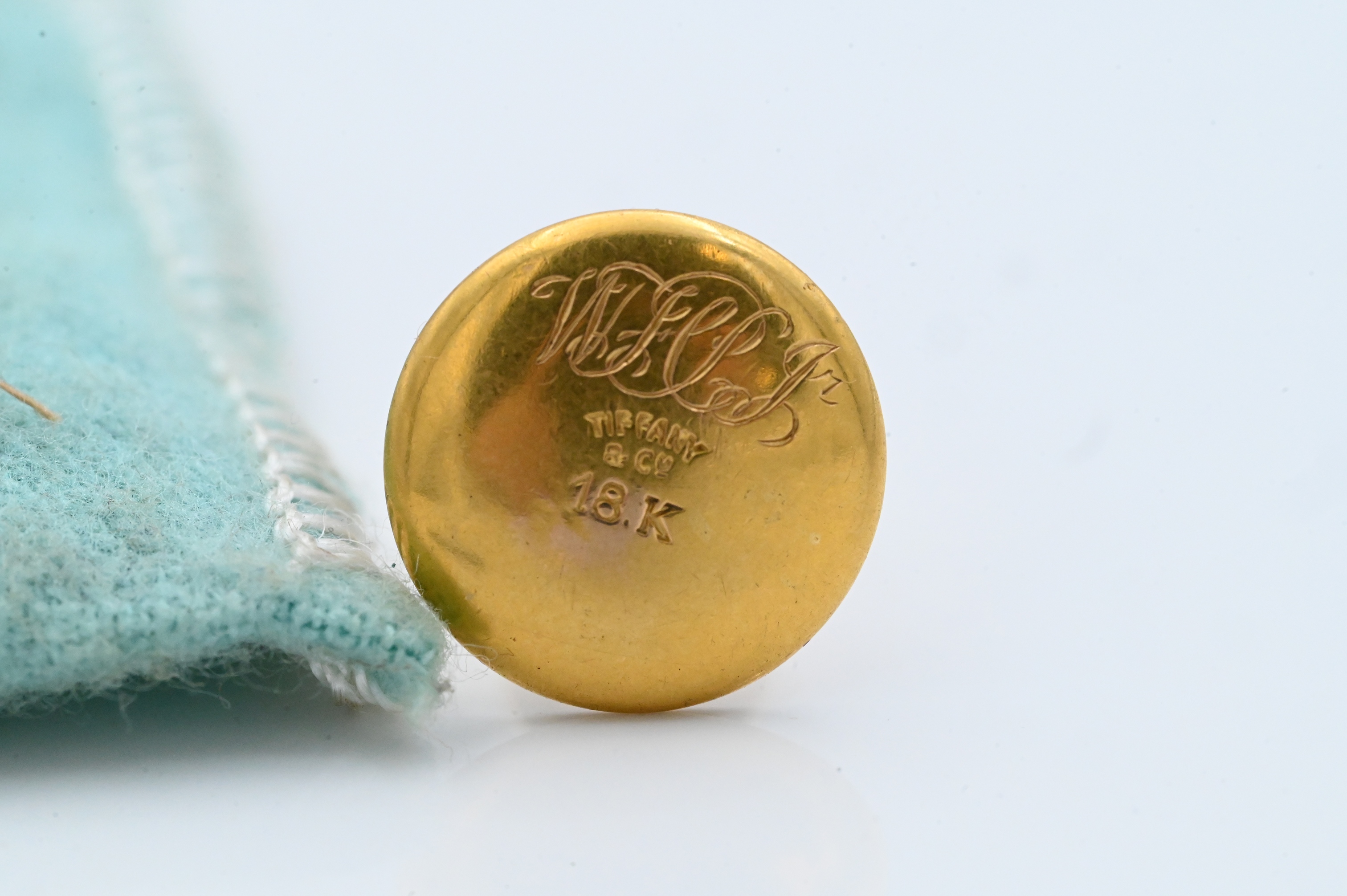Circular domed form centering a star-set round diamond, marked Tiffany & Co. 18K and engraved monogram on verso; housed in original Tiffany & Co. blue felt pouch.