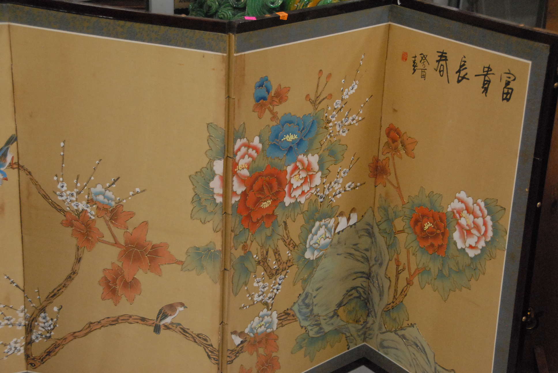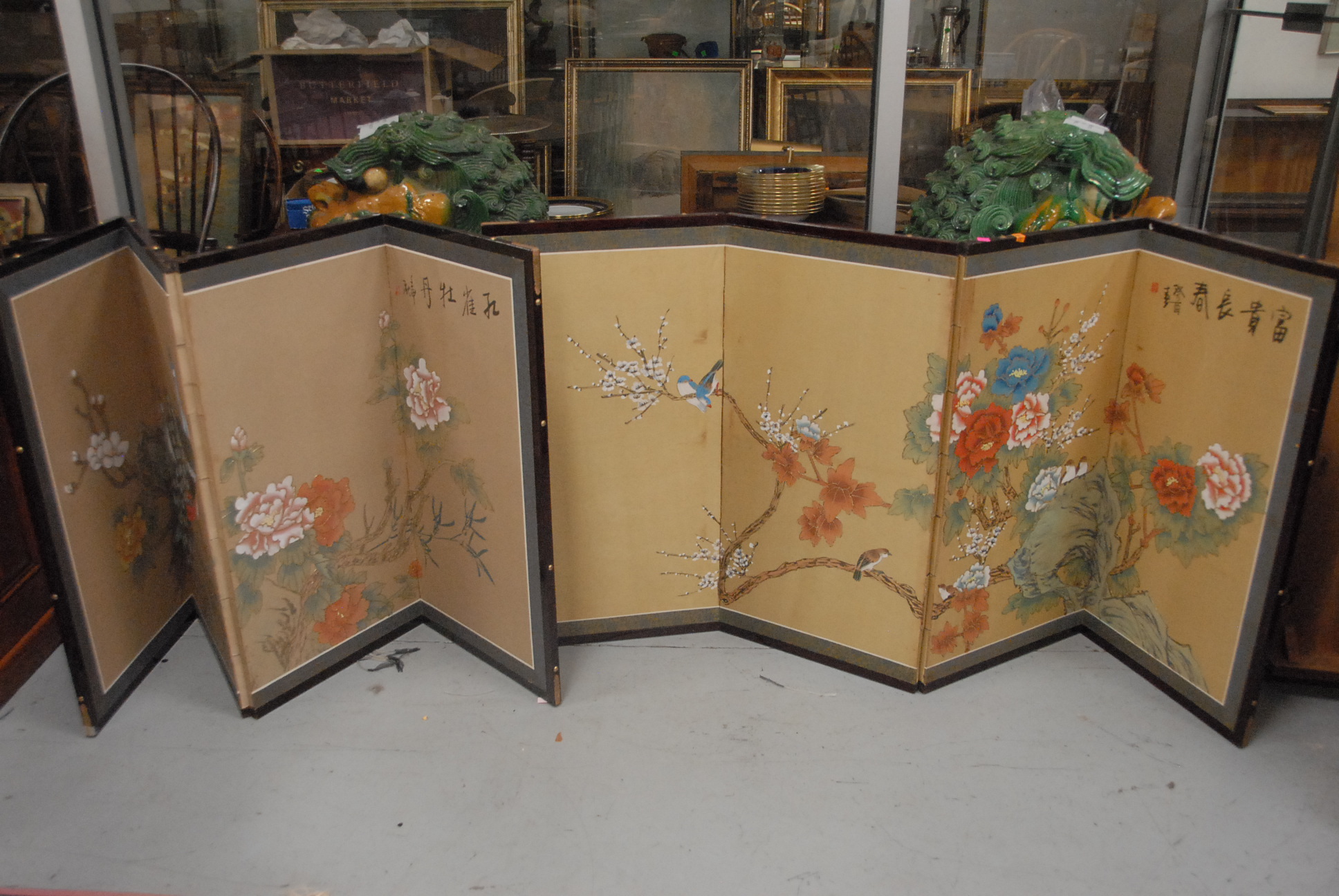 Two 4-fold screens with hand painted scenes and group of seven prints and watercolors including A. M. Comstock, A. Matthews, etc.