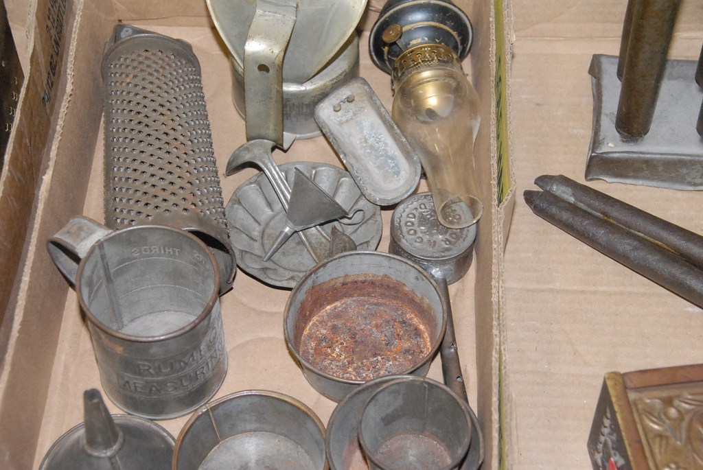 Two box lots of toleware candle molds, candlesticks, small cups etc.