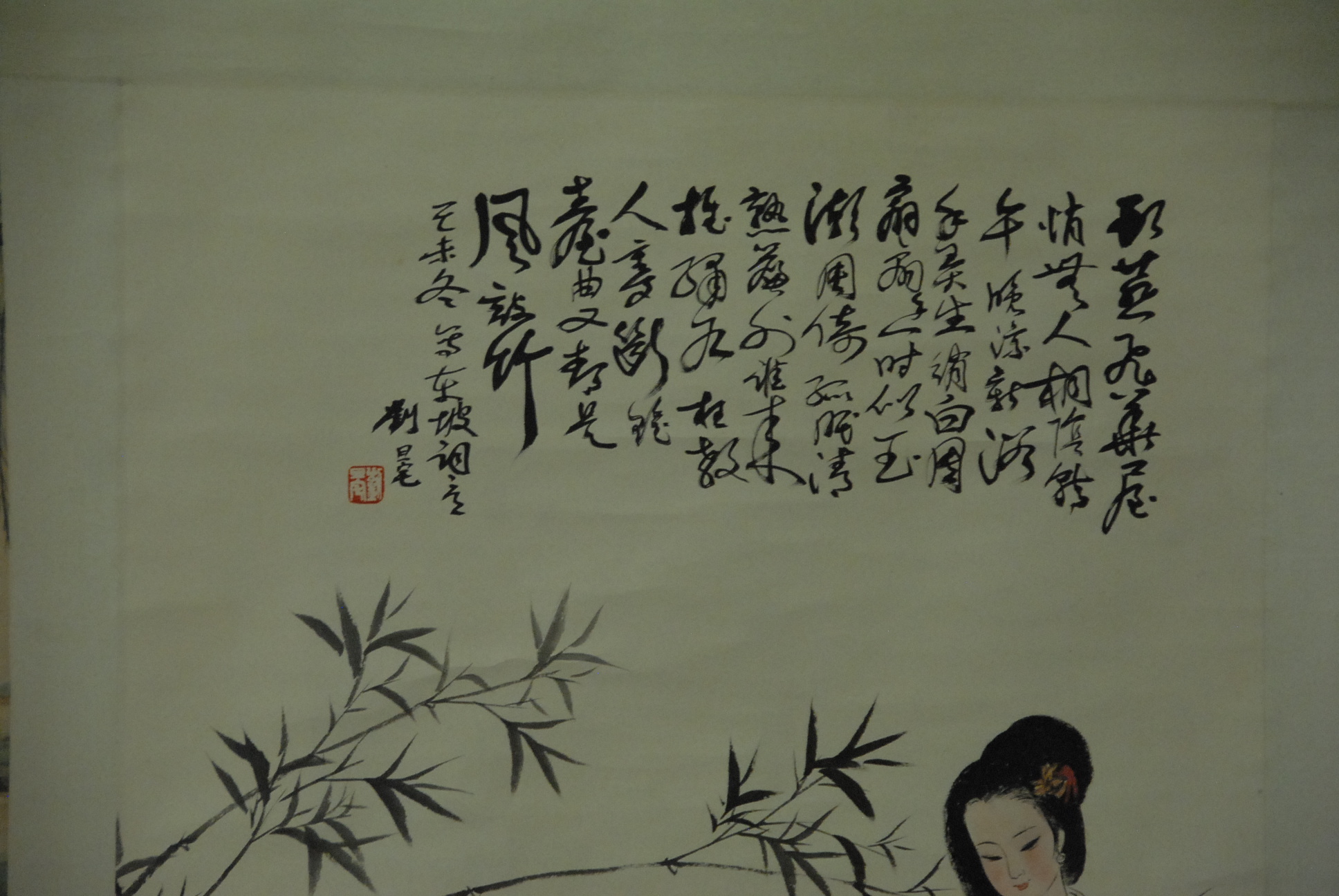 Two Oriental scrolls watercolor seated Guanyin 49 x 26 and watercolor Guanyin standing by trees 37 x 18.