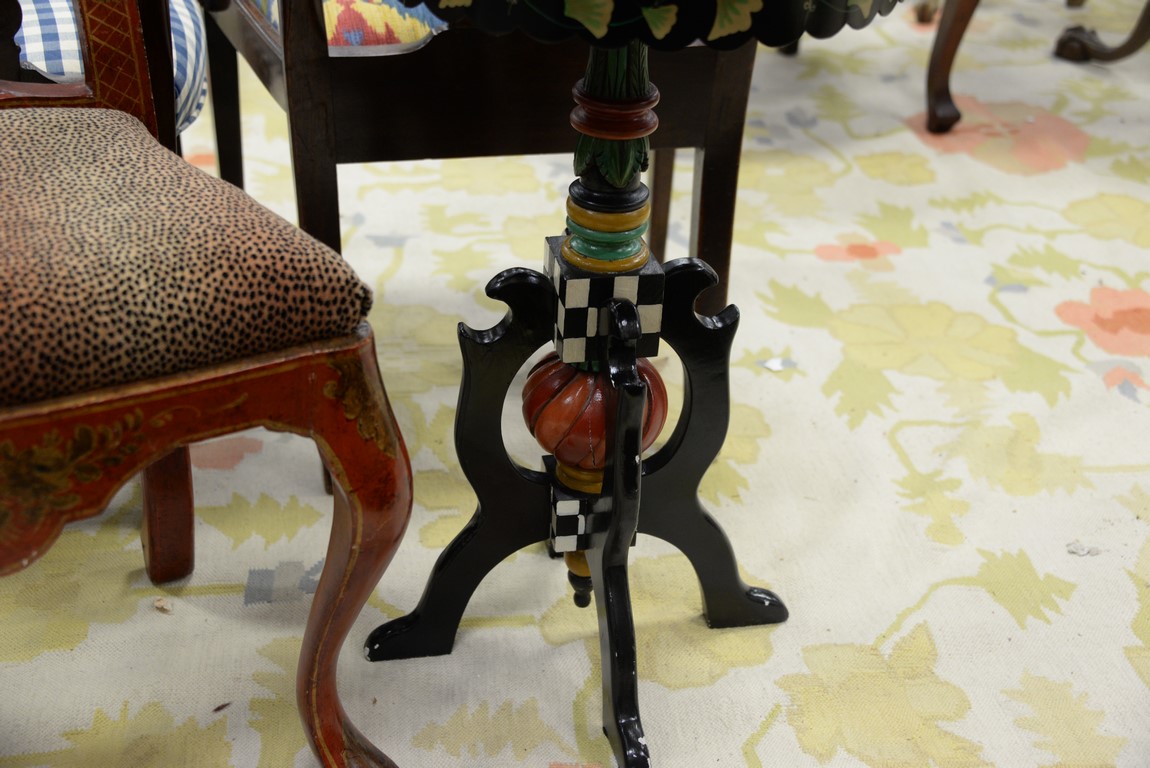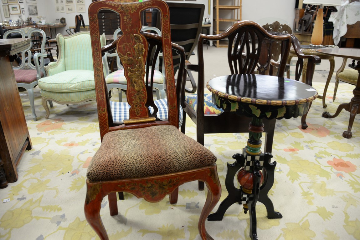 Lot 249: Two piece lot including paint decorated Queen Anne style chair and paint decorated round occasional table. table: ht. 28 in. dia. 1…