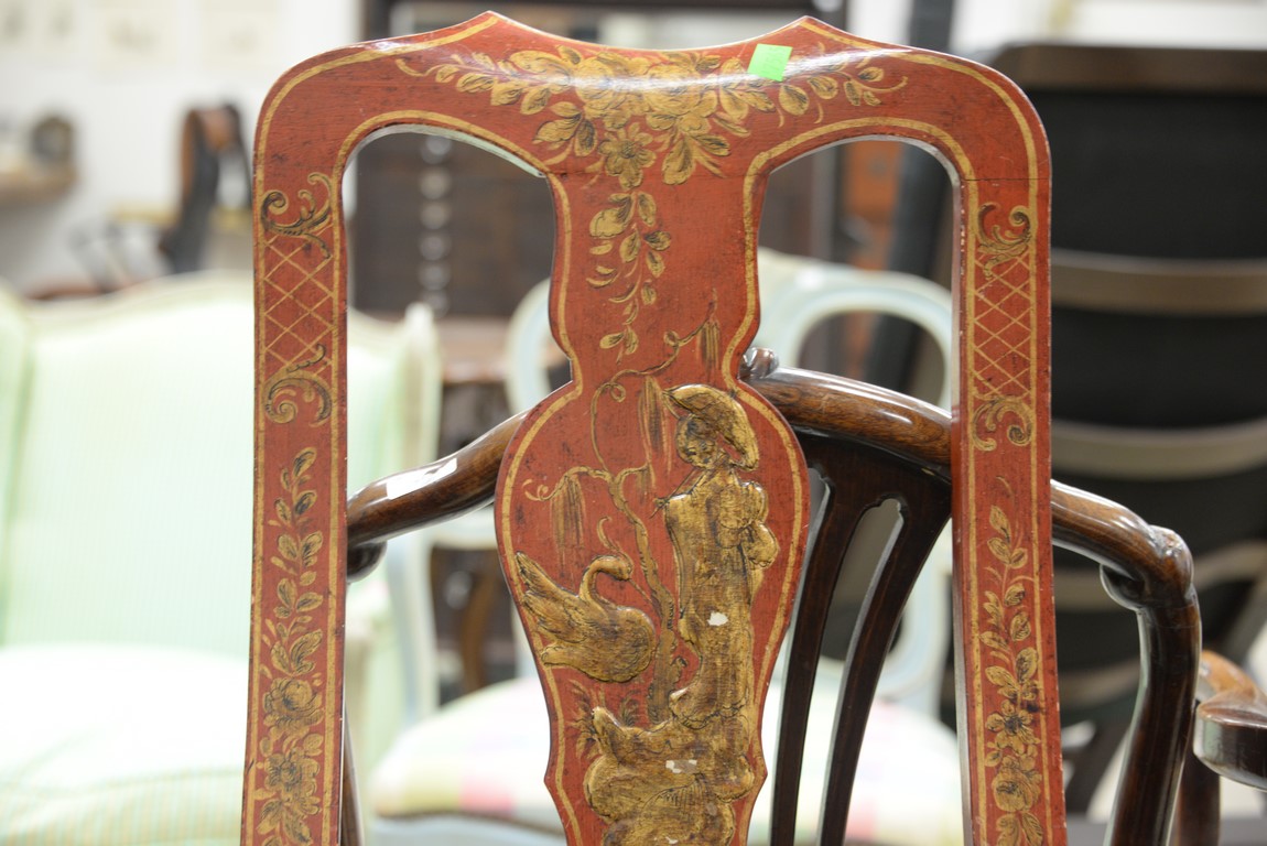 Two piece lot including paint decorated Queen Anne style chair and paint decorated round occasional table. table: ht. 28 in. dia. 18 1/2 in.