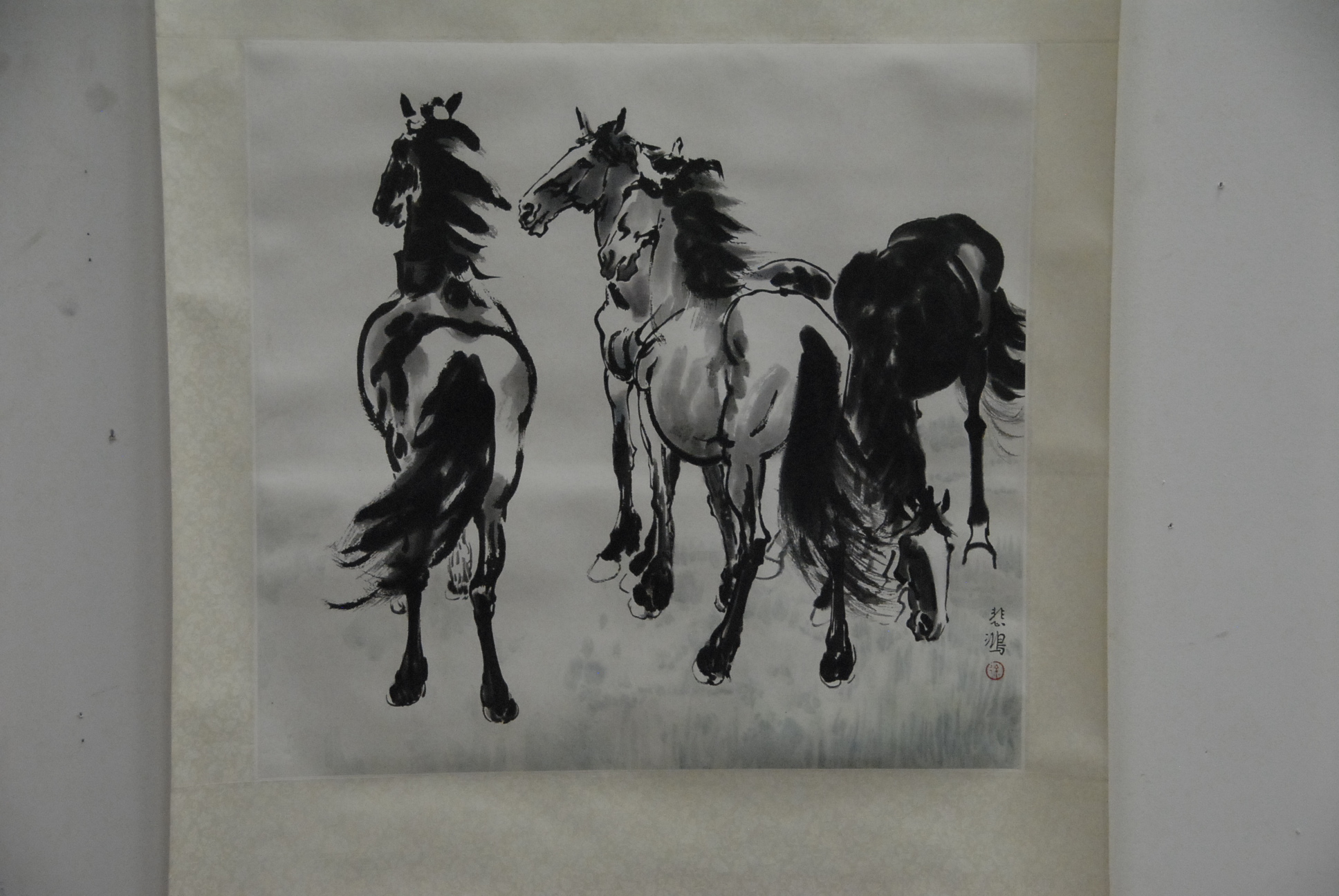 Two piece lot to include a scroll with horses, along with five oriental figures in a shadow box frame.