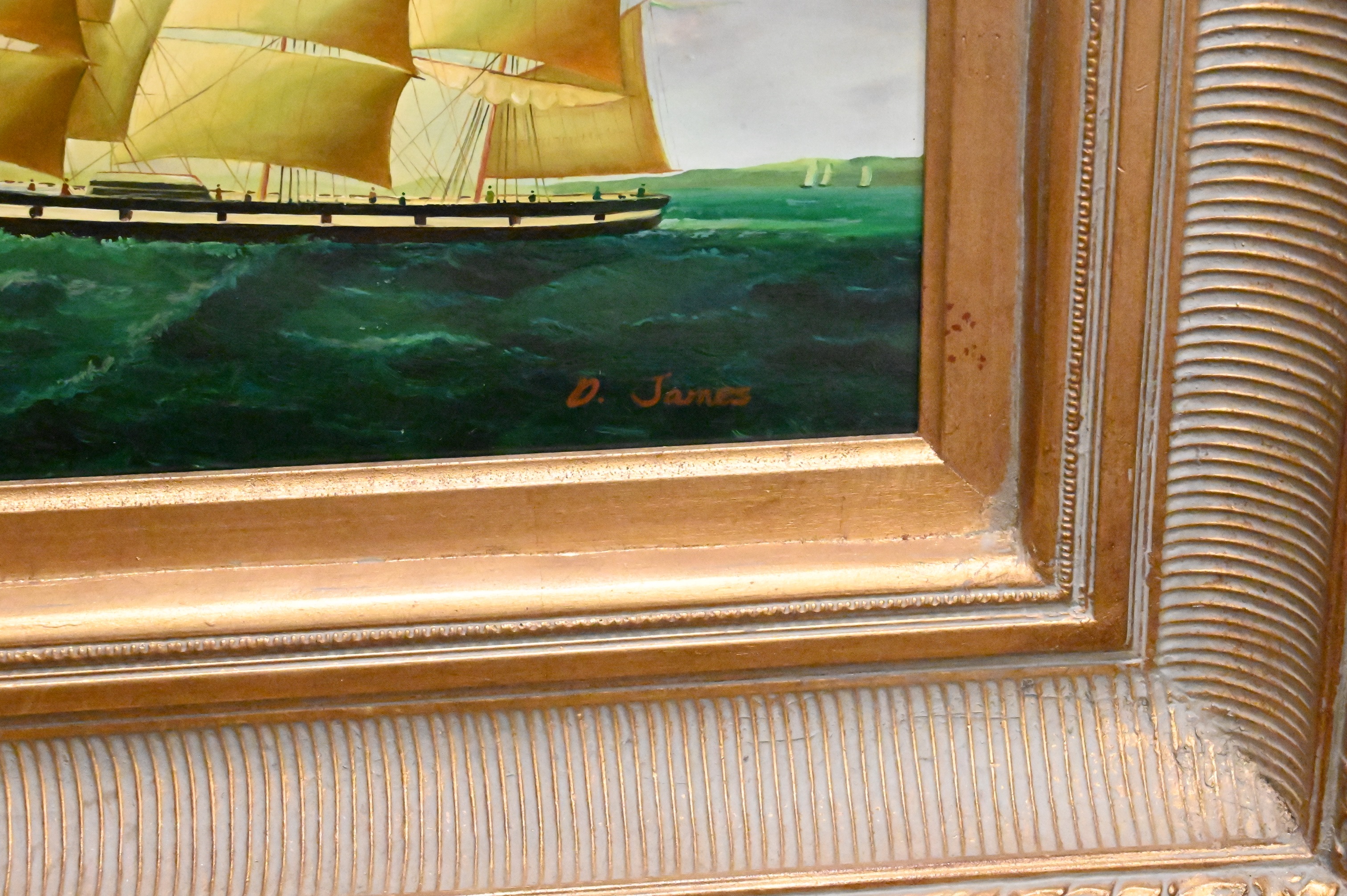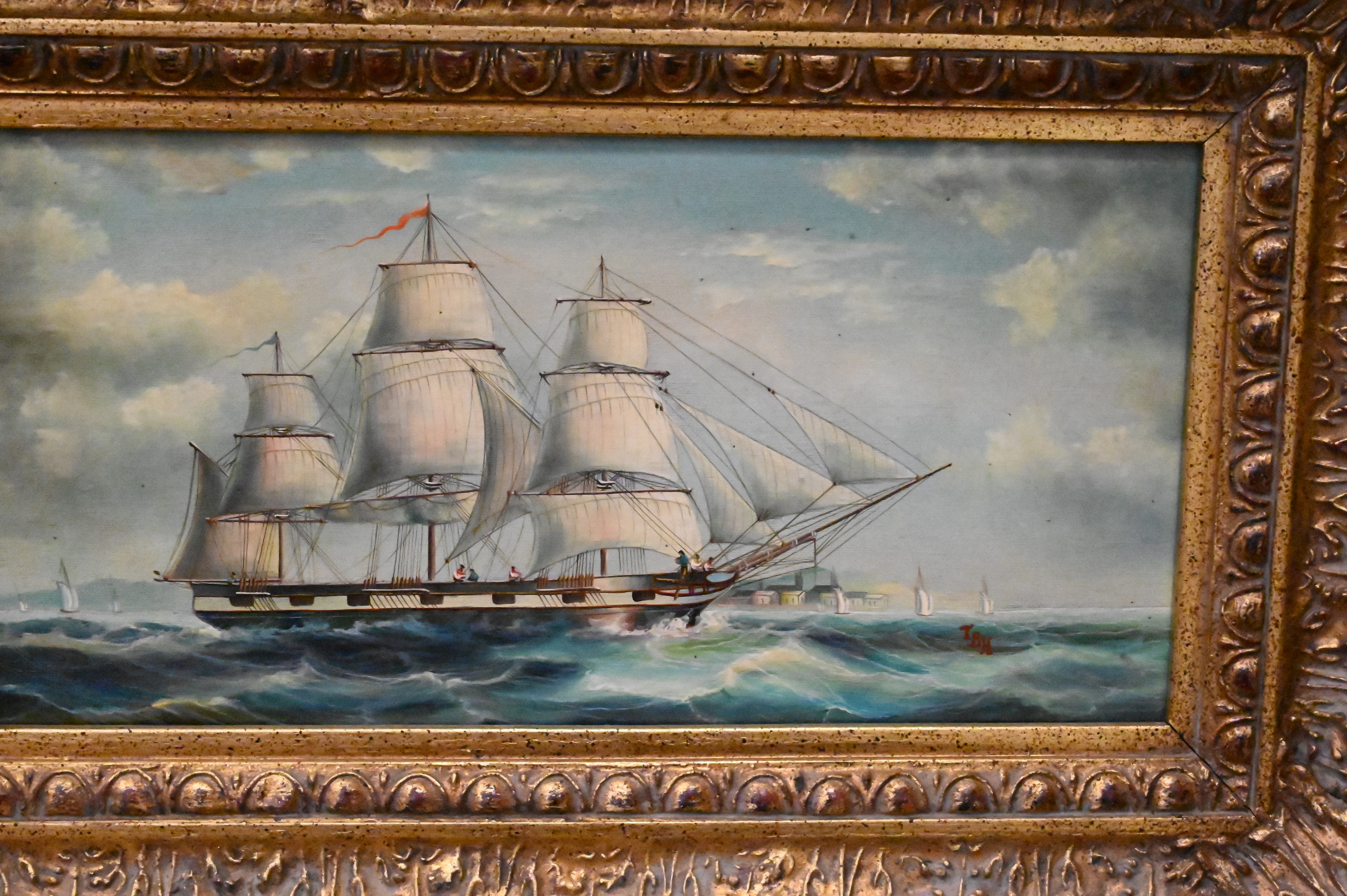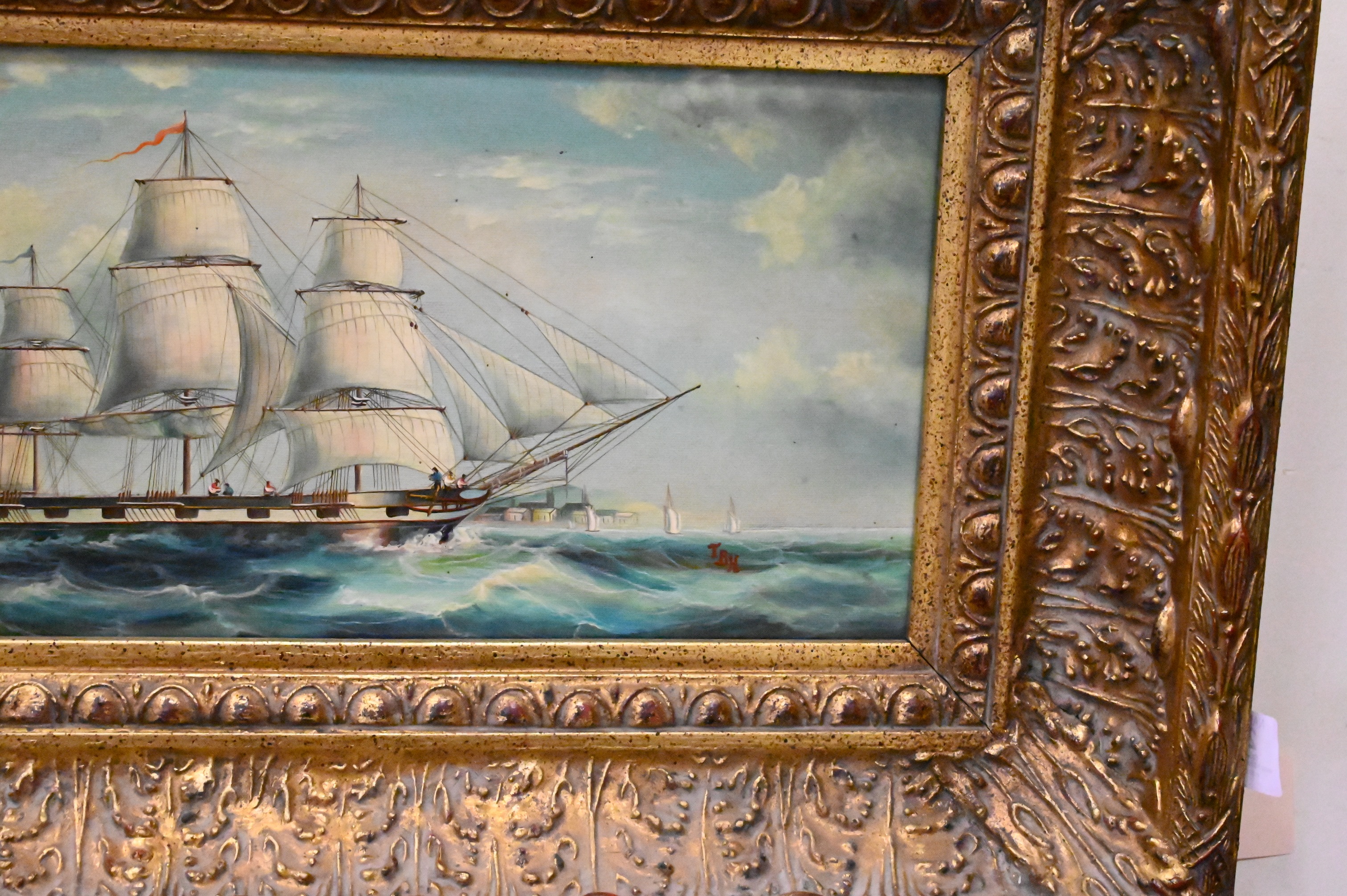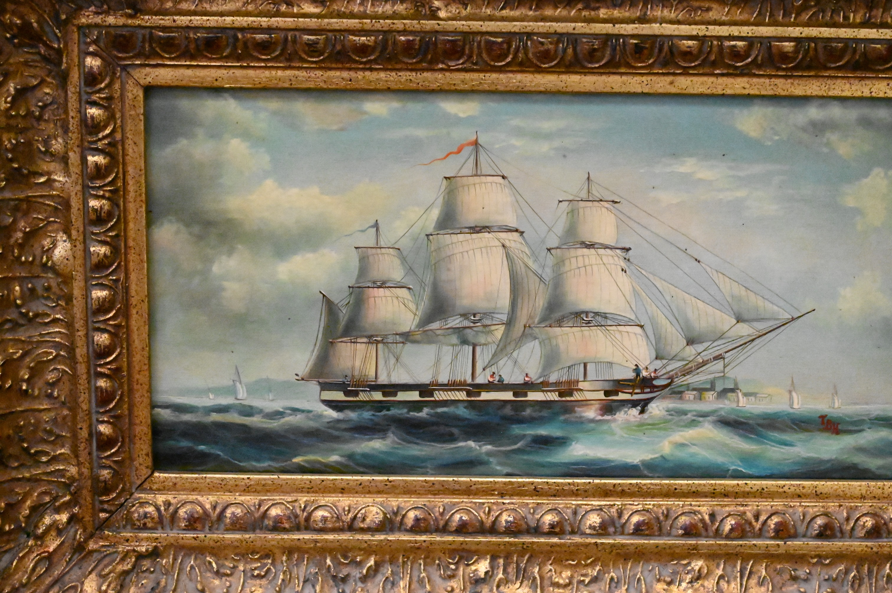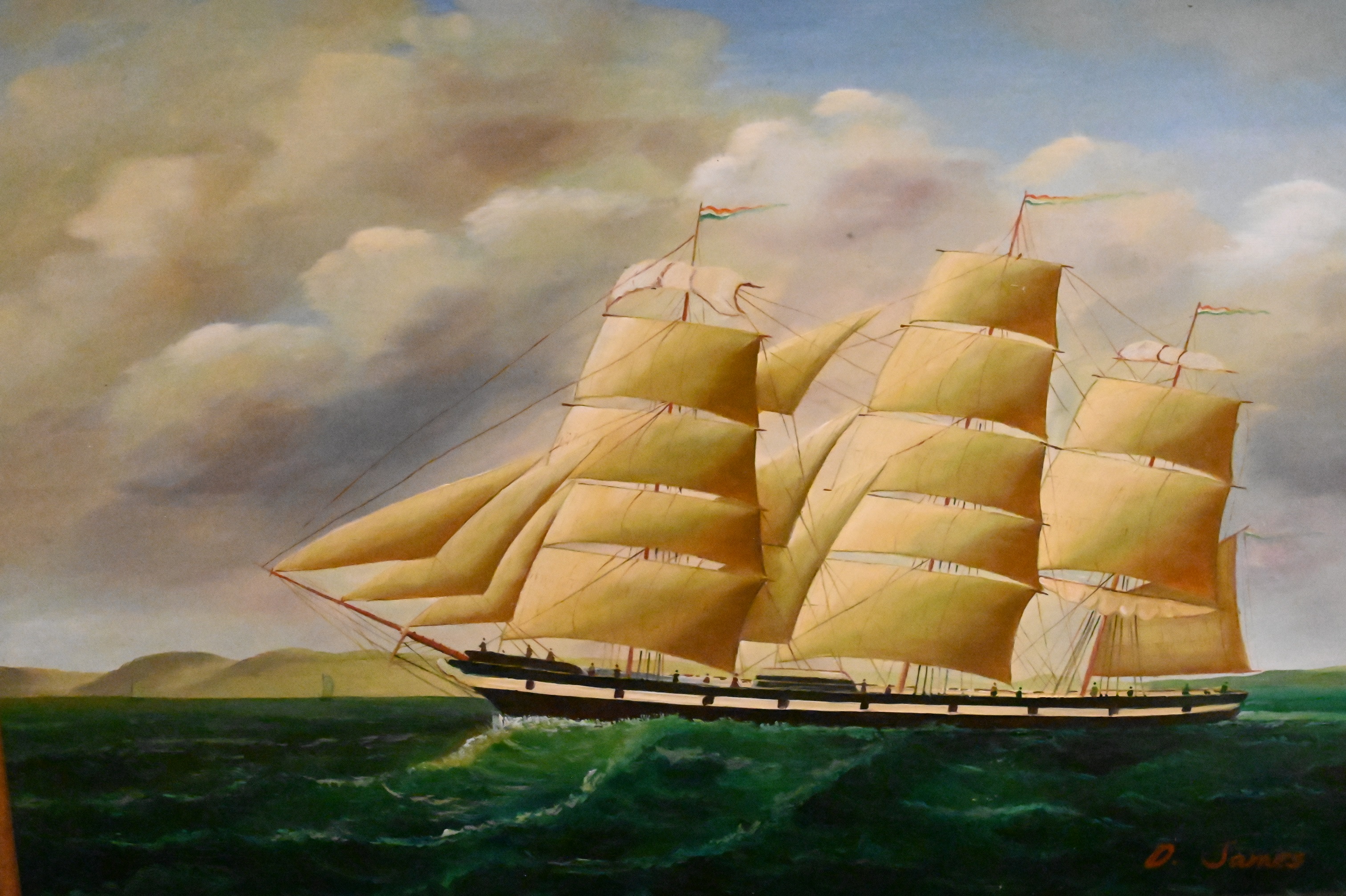 Three Masted Ship flying a green, white, and red flag on the open ocean