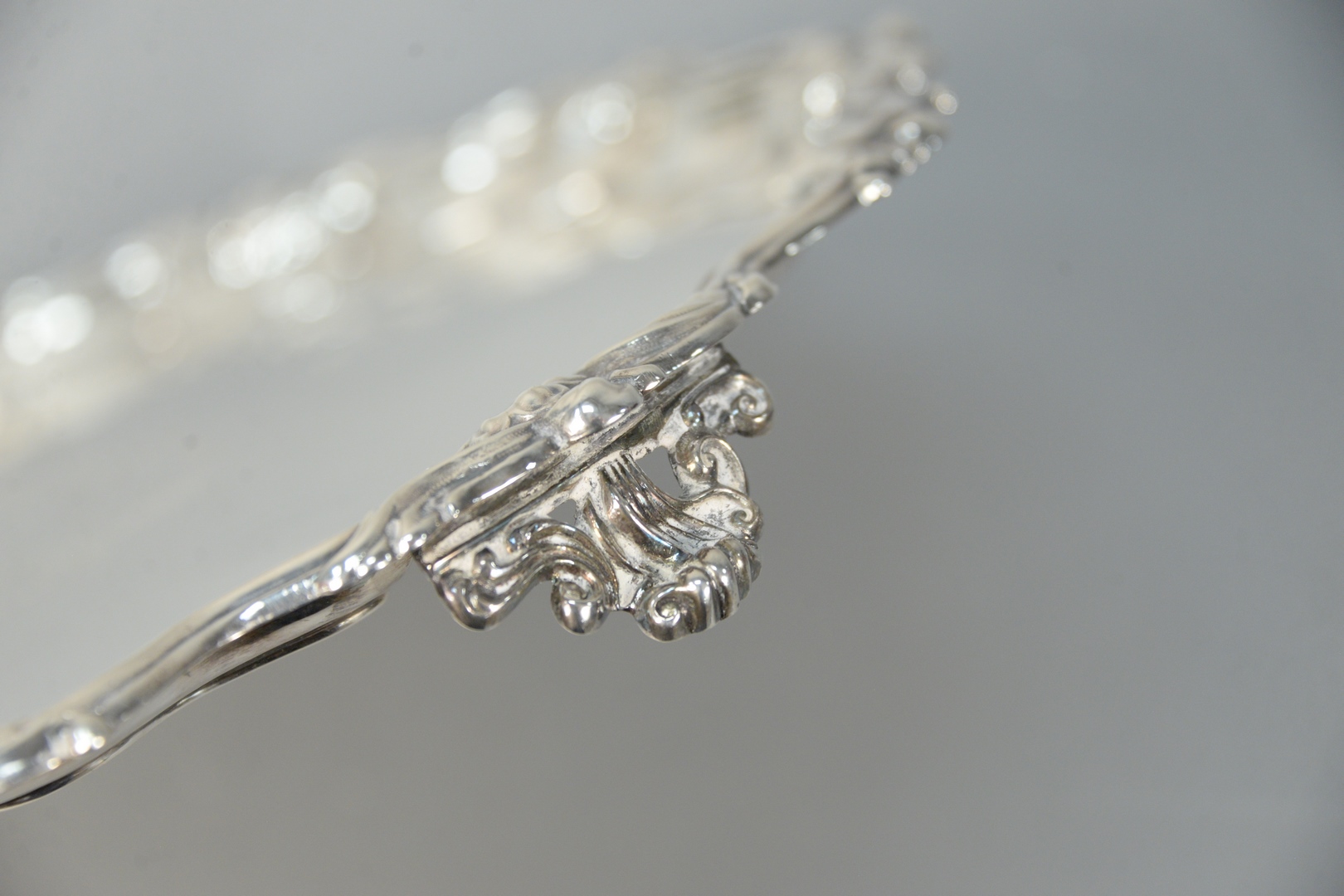 having wavy edge with flowers, set on scrolled feet, marked Walker & Hall, Sheffield, England on bottom