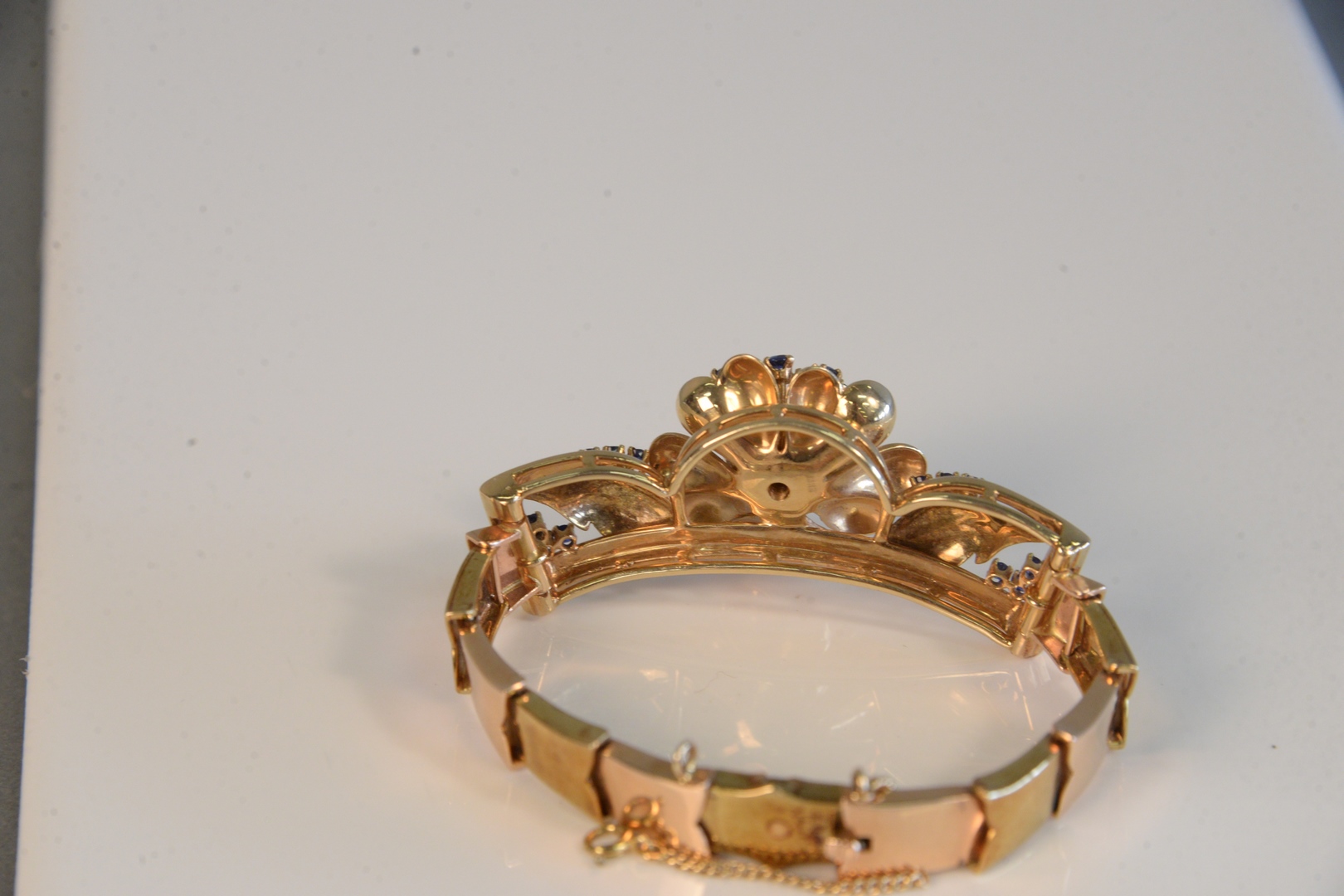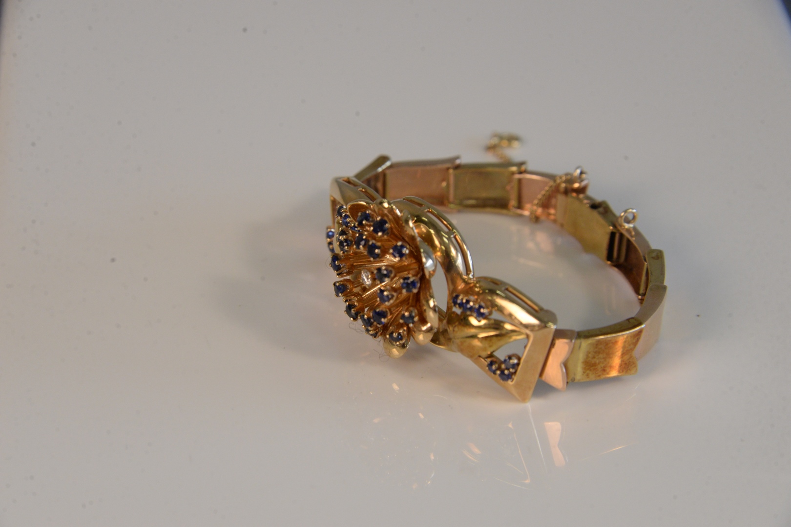 Lot 25: 14 Karat Gold Bracelet having three dimensional flower with blue sapphires and diamond center with sectioned band length 6 1/2 inche…