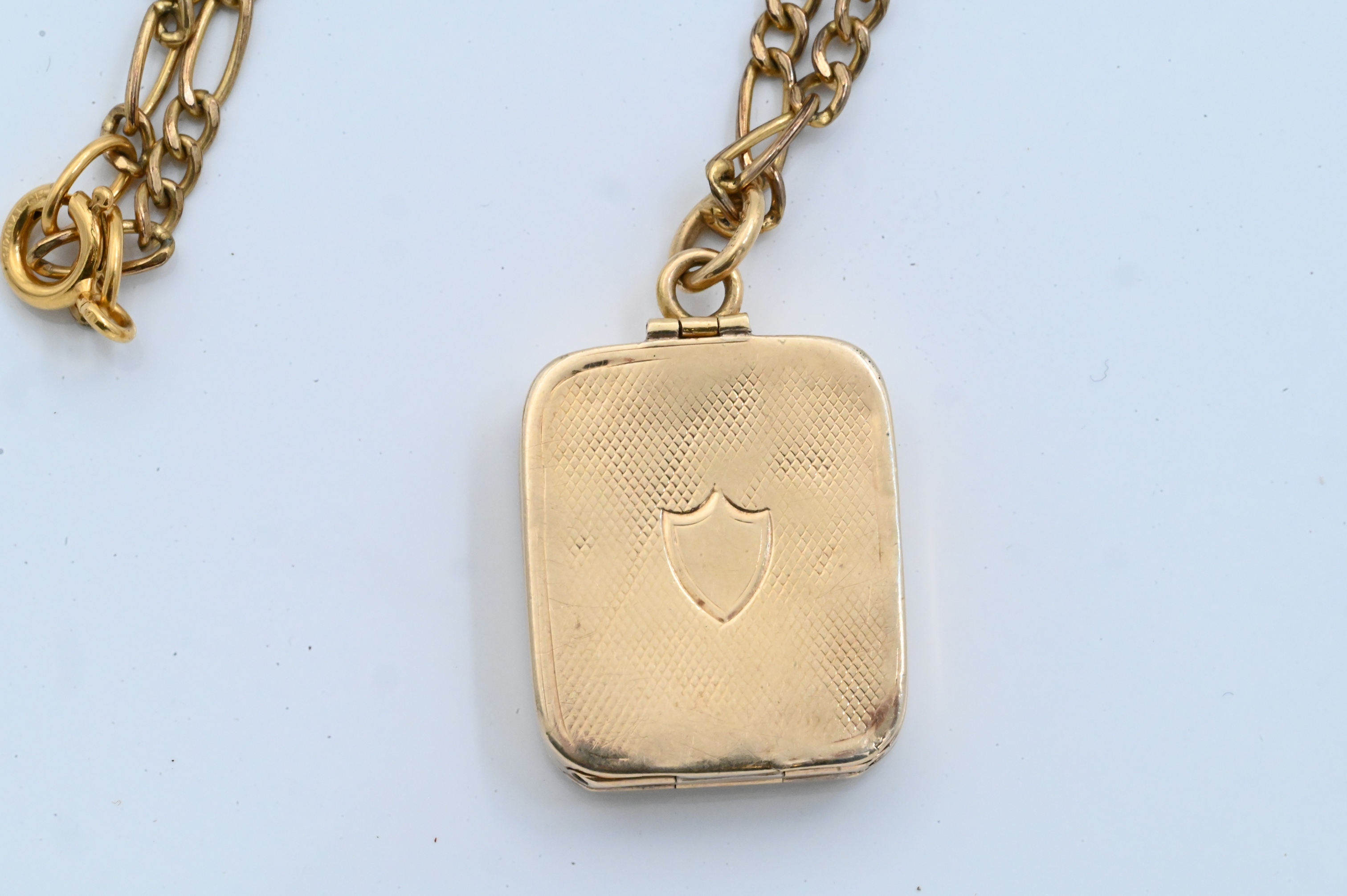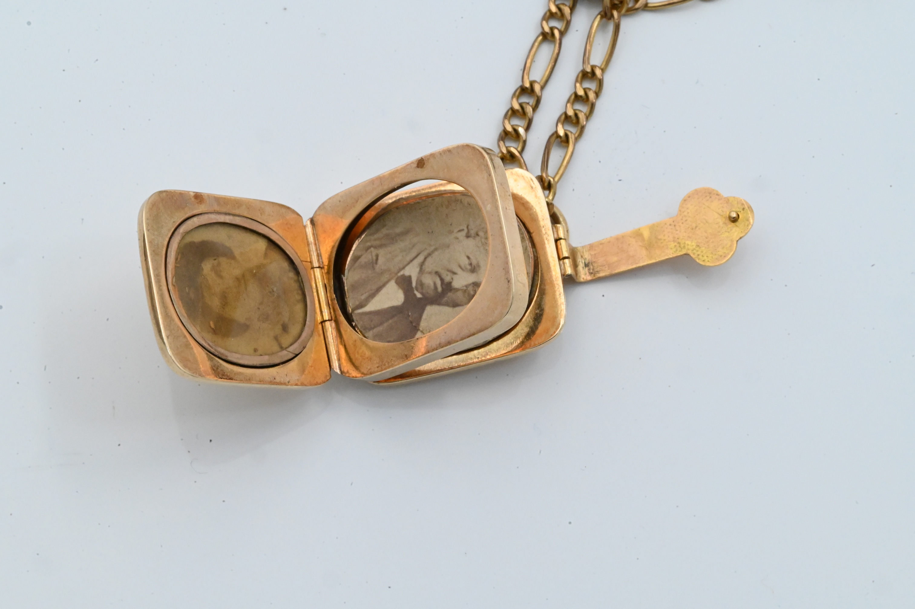 rectangular locket with engraved foliate and starburst design, opening to reveal interior portrait compartments with two vintage photo inserts, suspended from a gold-filled link chain