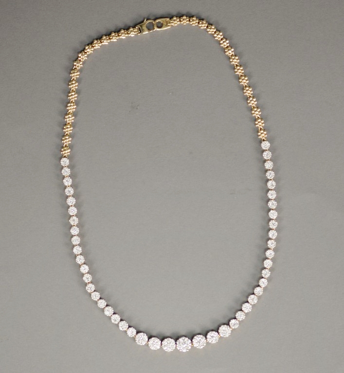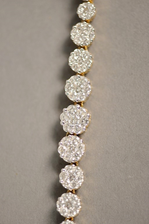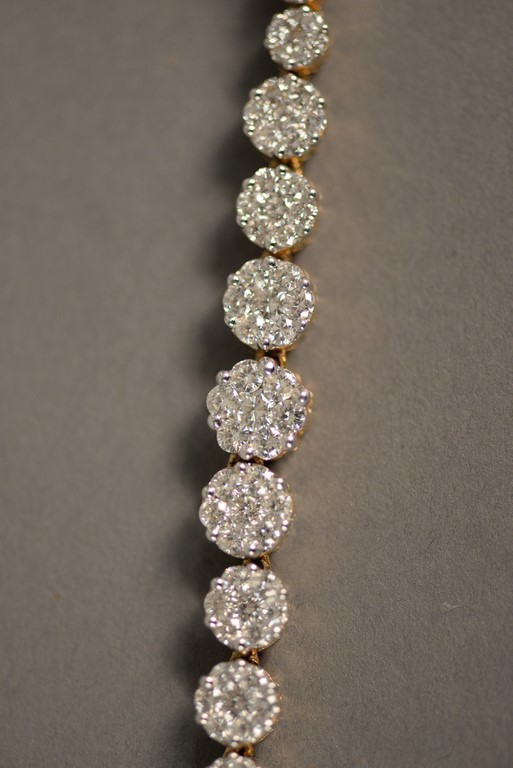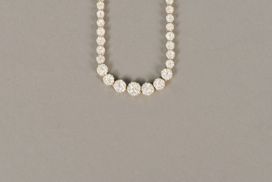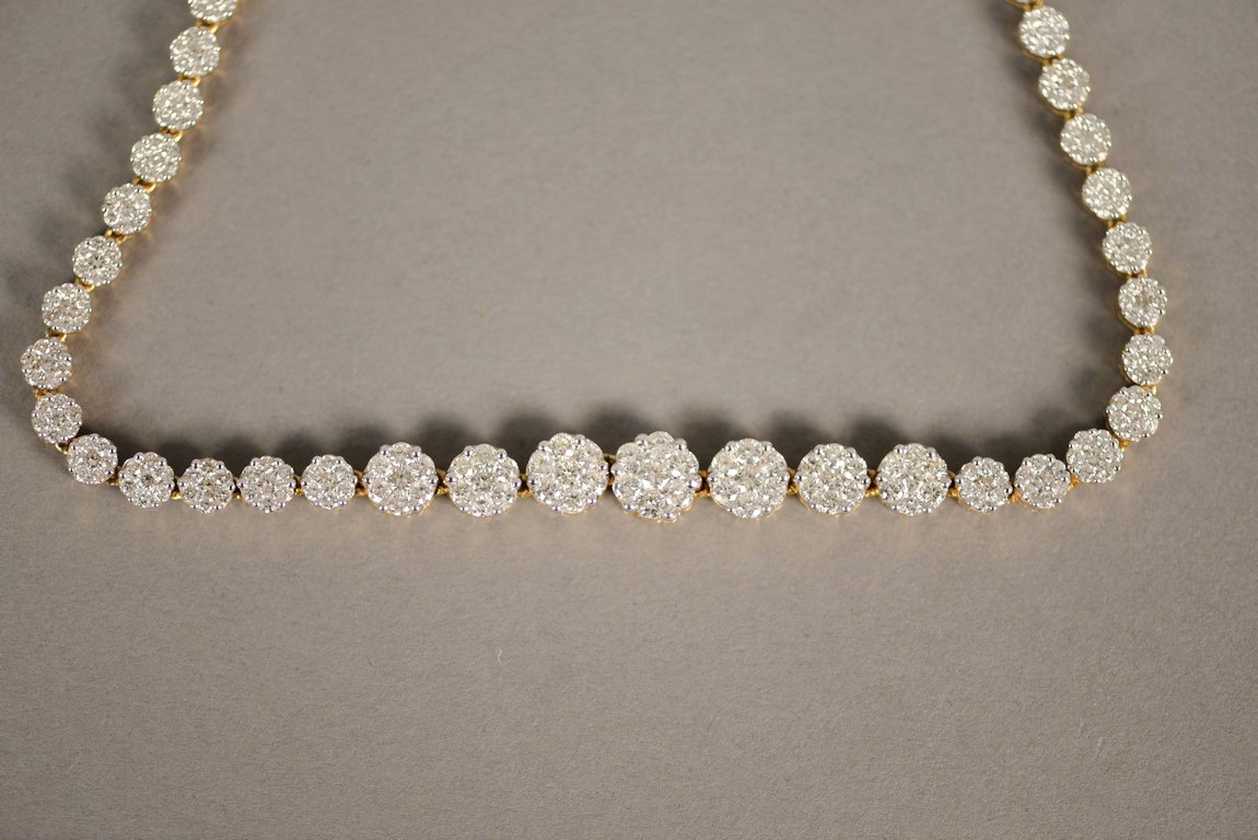 14K gold and diamond necklace with forty-seven round sections each set with seven round cut diamonds, total 329 diamonds. 28 grams total weight including diamonds.