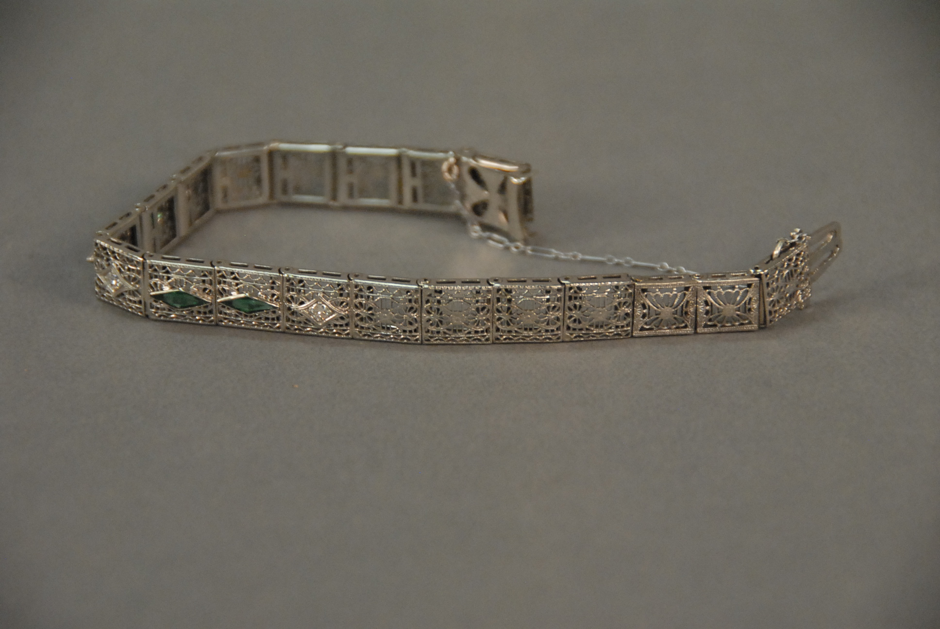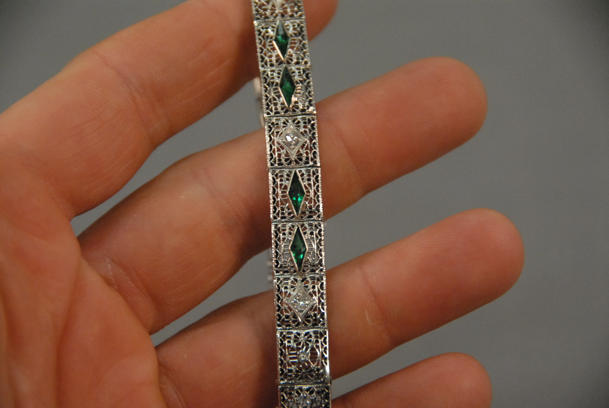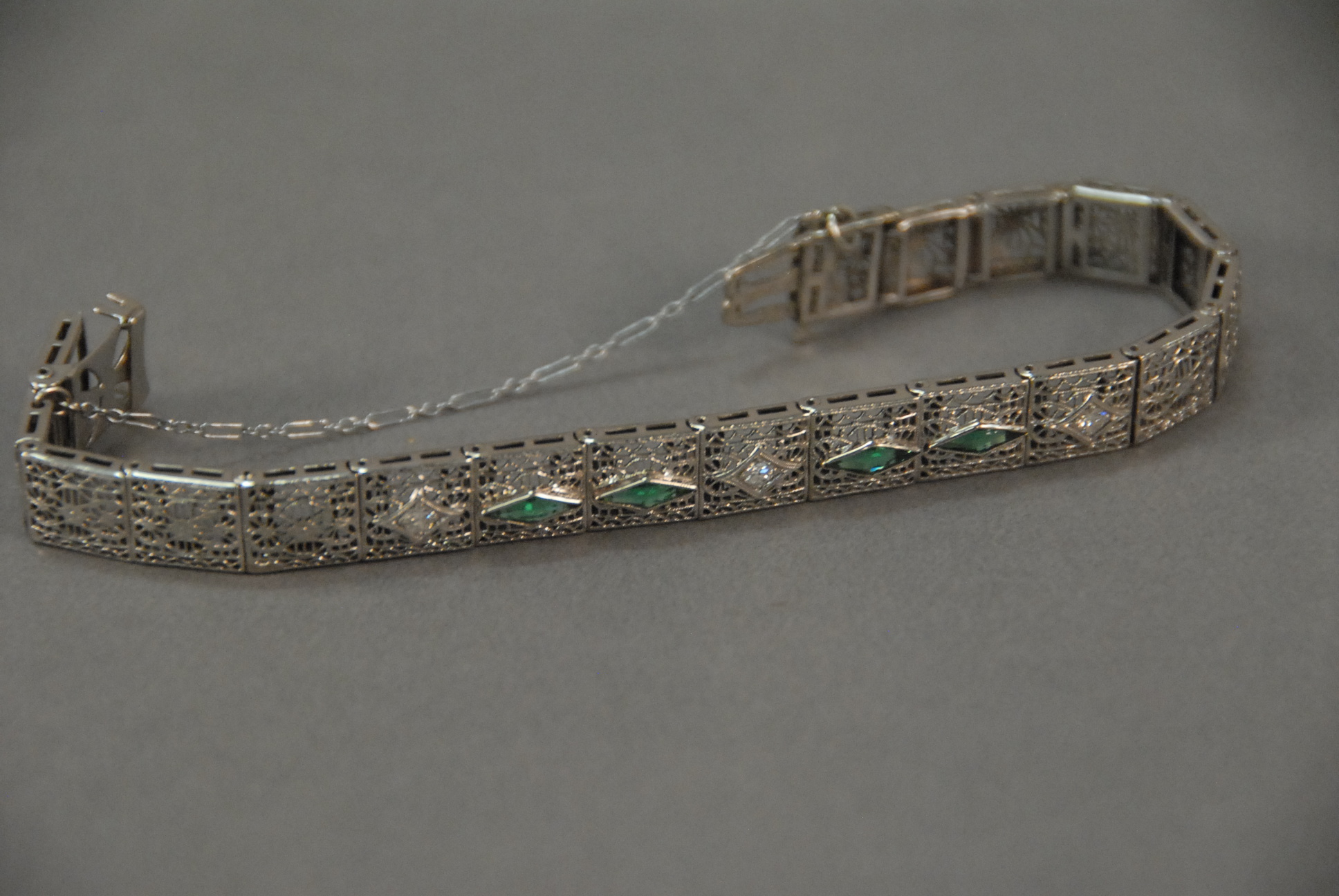 Lot 25: 14K white gold filigree bracelet set with four trillion shaped emeralds and three small diamonds. 16 grams