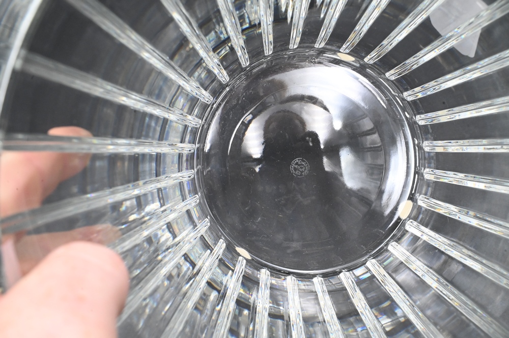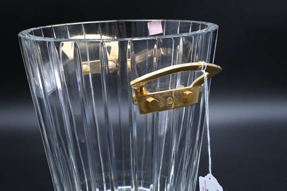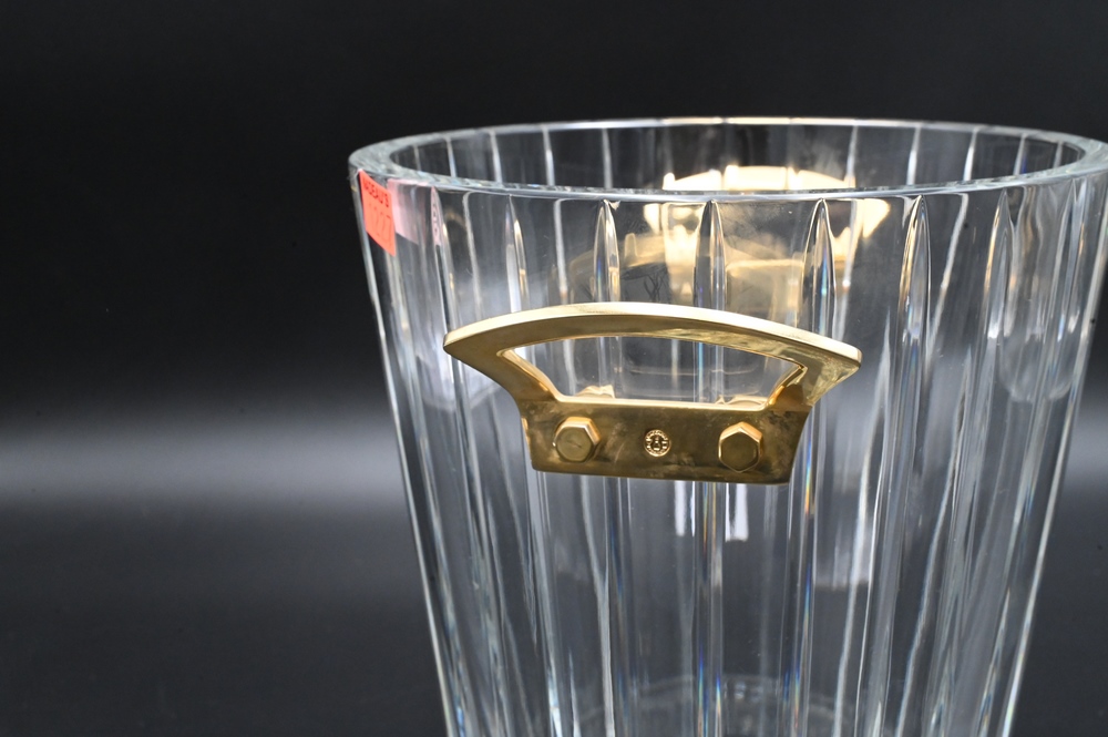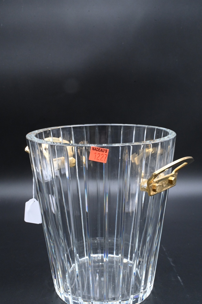 Baccarat Crystal Ice Bucket, having brass handles, height 9 inches, diameter 8 inches.