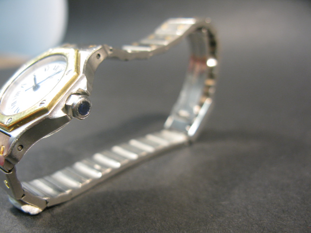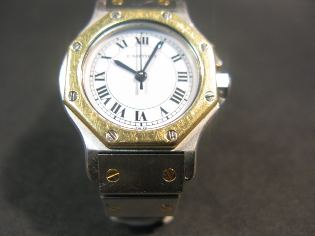 Cartier stainless ladies wristwatch trimmed in gold.