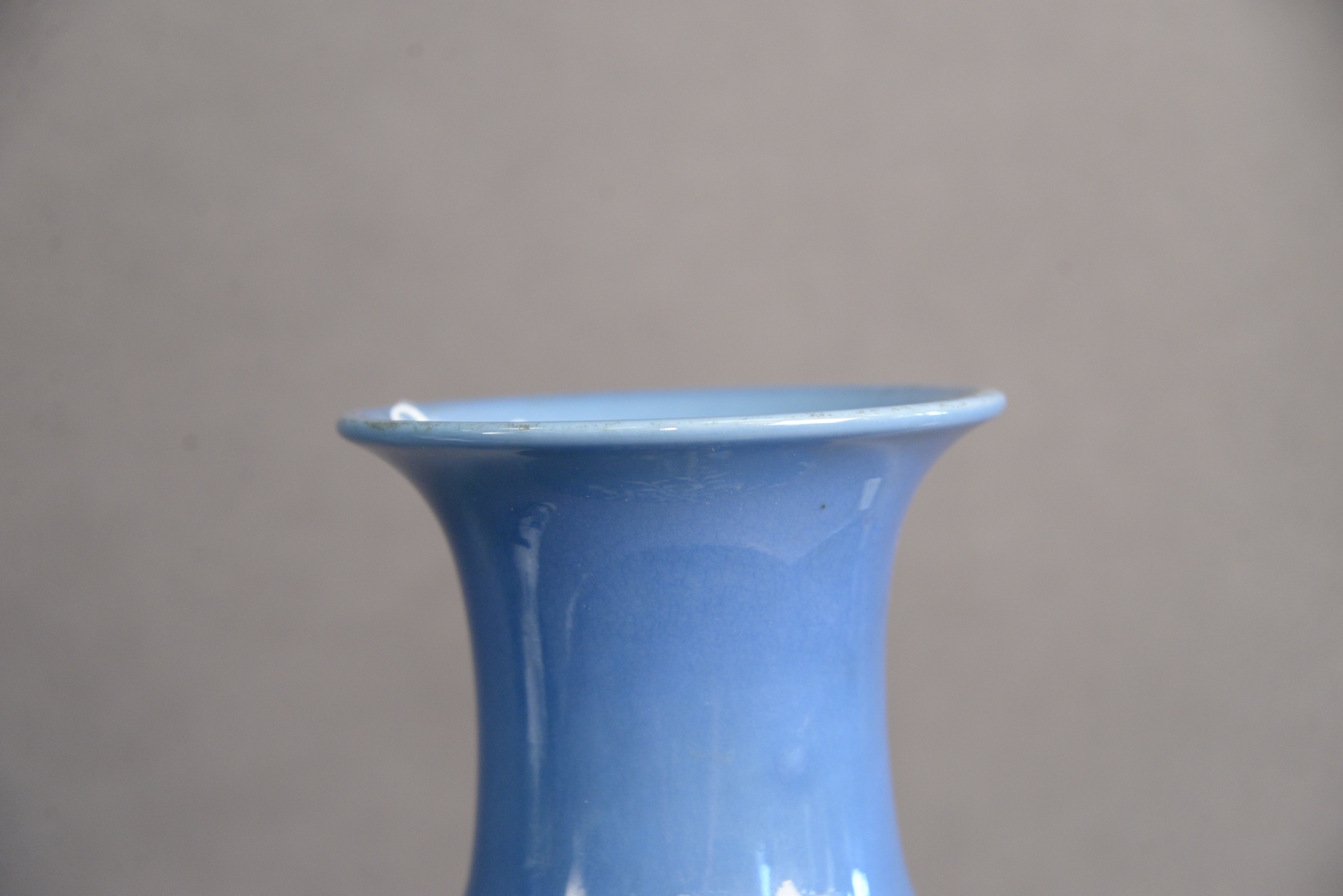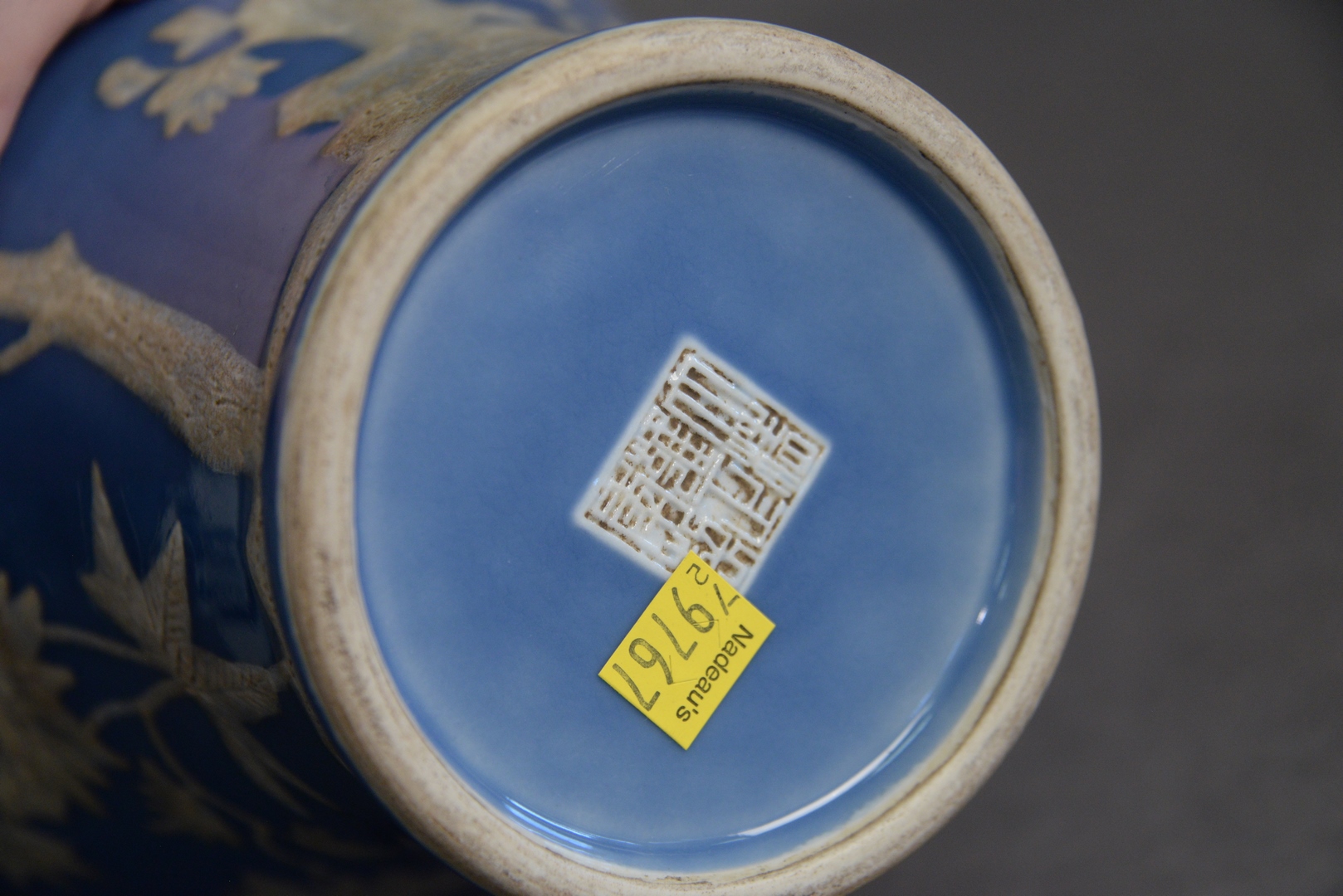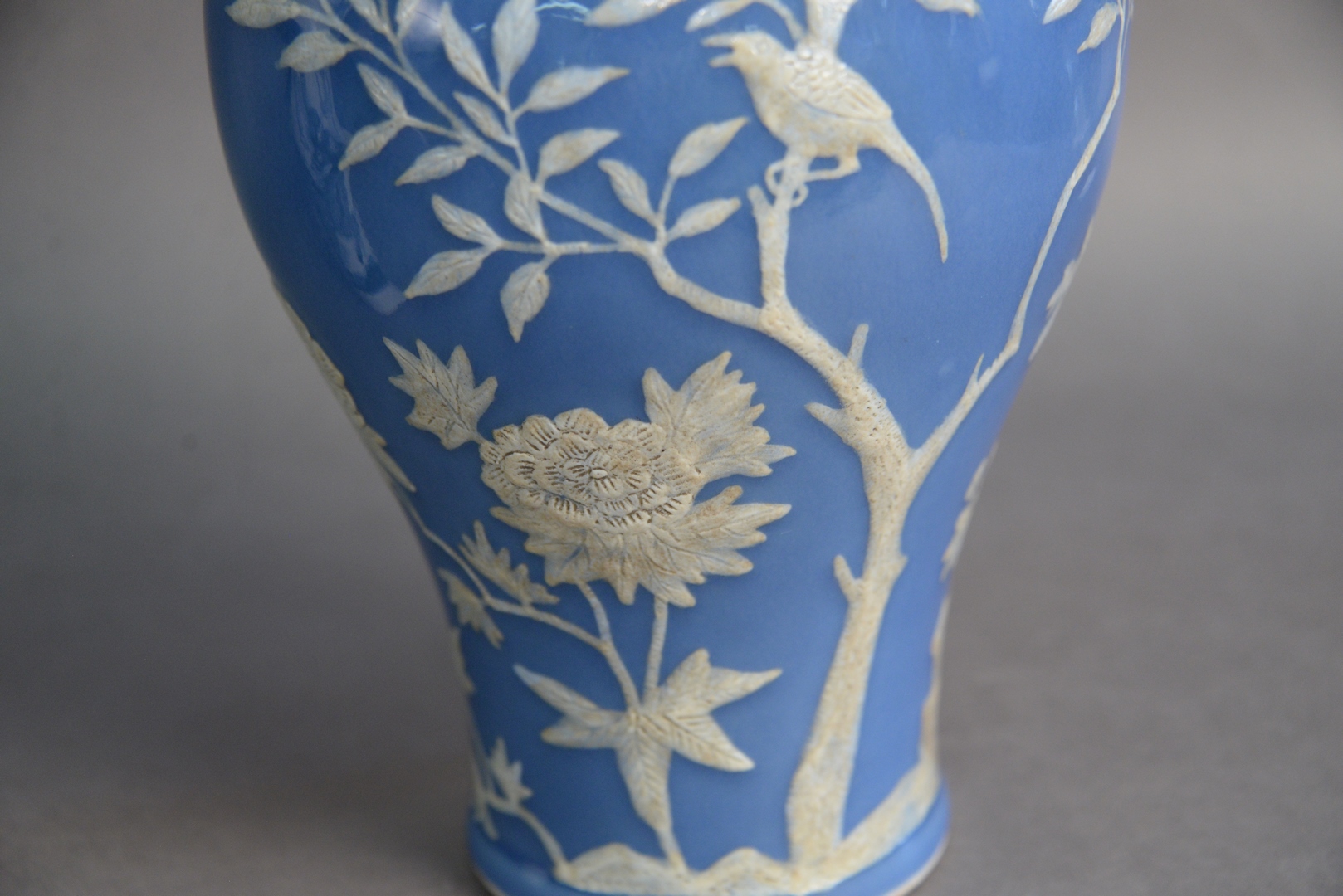 Chinese Blue Glazed Vase with white relief detailing of a bird in a tree, height 15 inches.