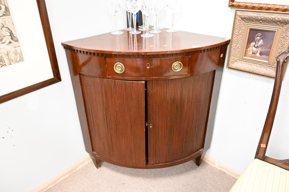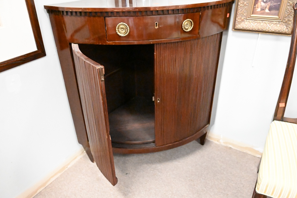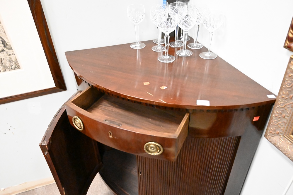 Lot 25: Continental Mahogany Corner Cabinet, having one drawer over two faux tambour doors, opening to interior shelving, height 36 1/2 inches, top 25″ x 35″.