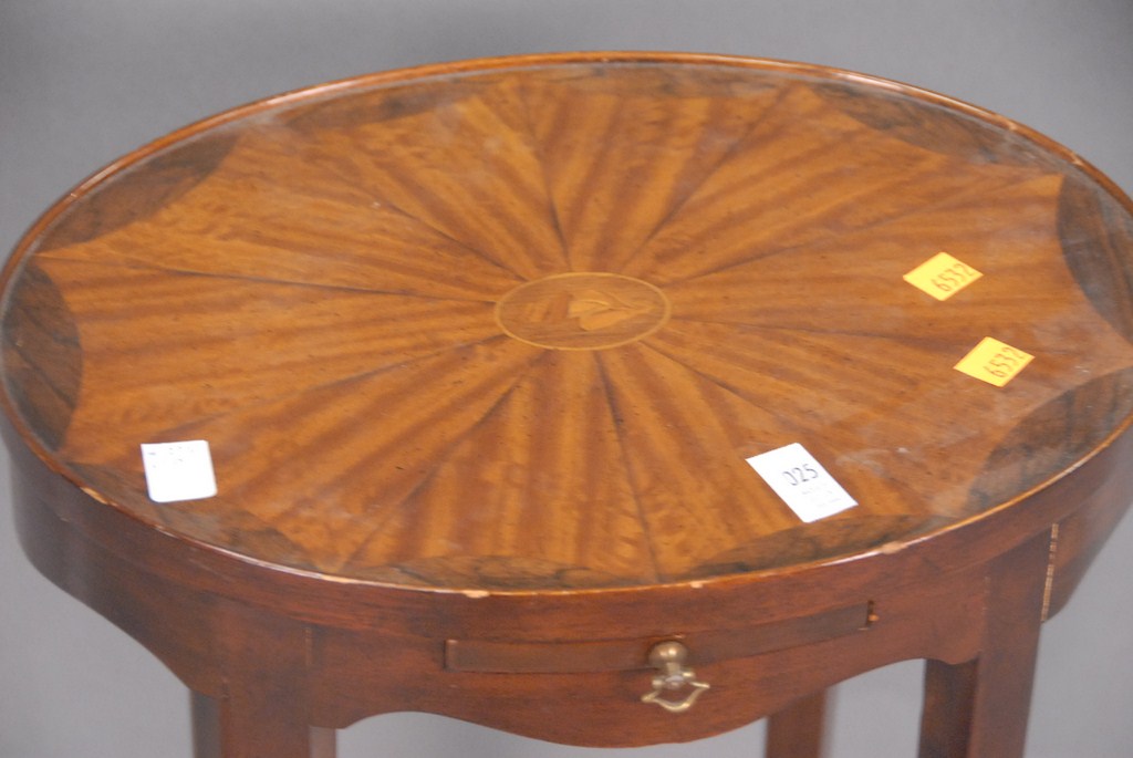 Drexel inlaid mahogany oval stand with pull out slide, ht 27in. wd. 15in.