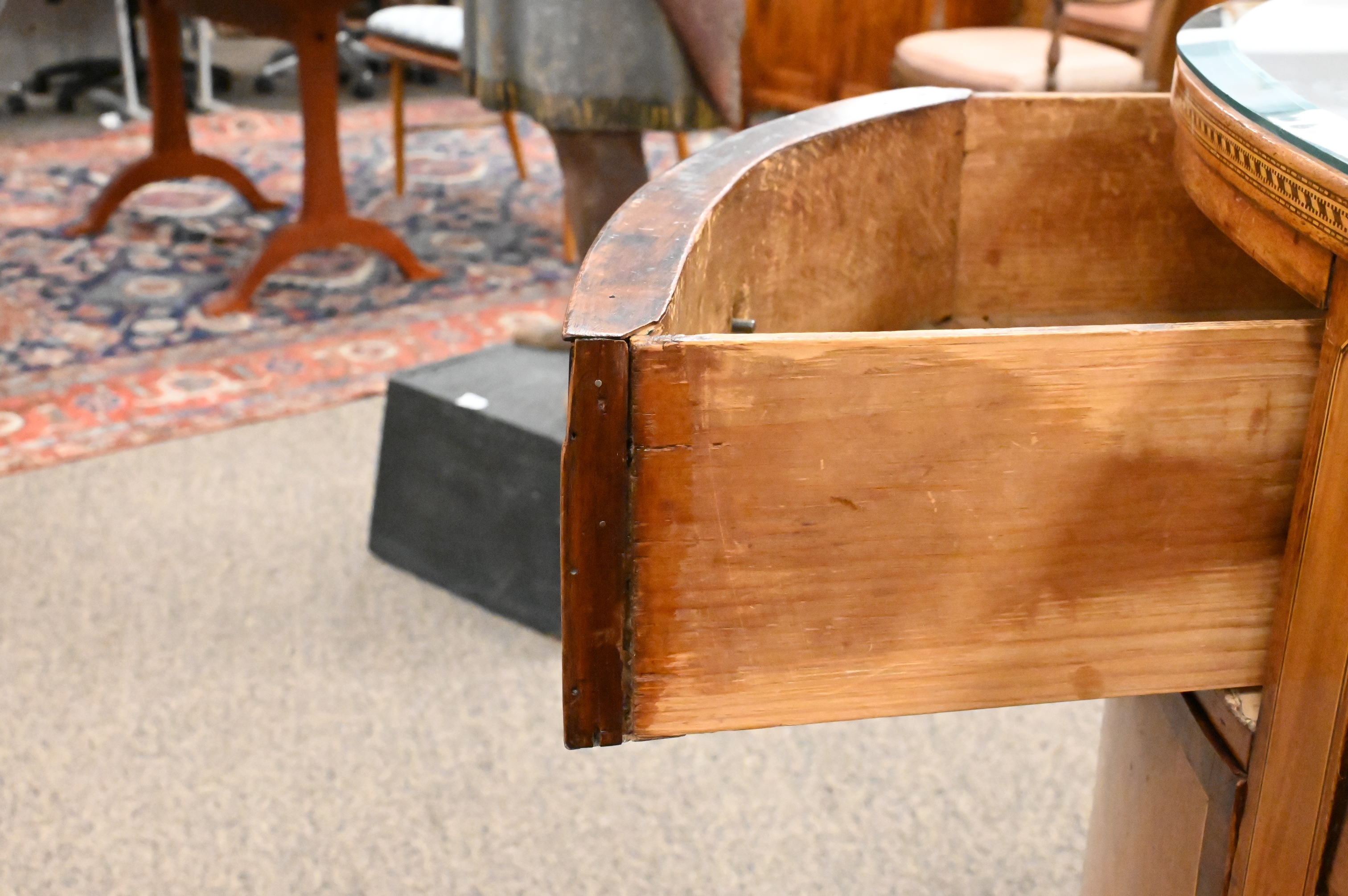 having inches inches shaped top over conforming case of three over center drawers flanked by bottle drawers and bowed doors, all rosewood banded drawers with panel inlays, all set on turned and fluted legs ending in brass capped feet and brass wheels, now fitted with bevel glass top