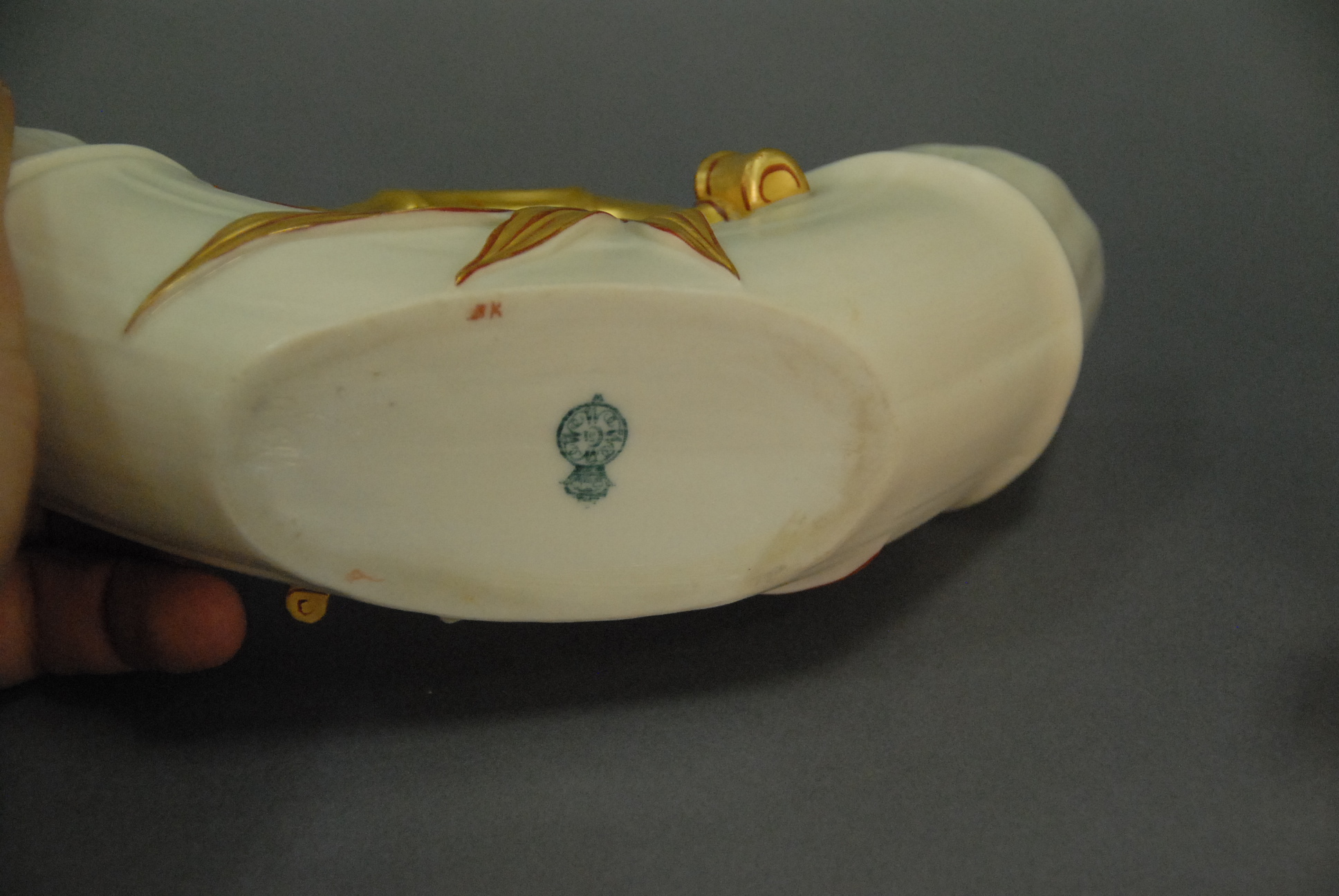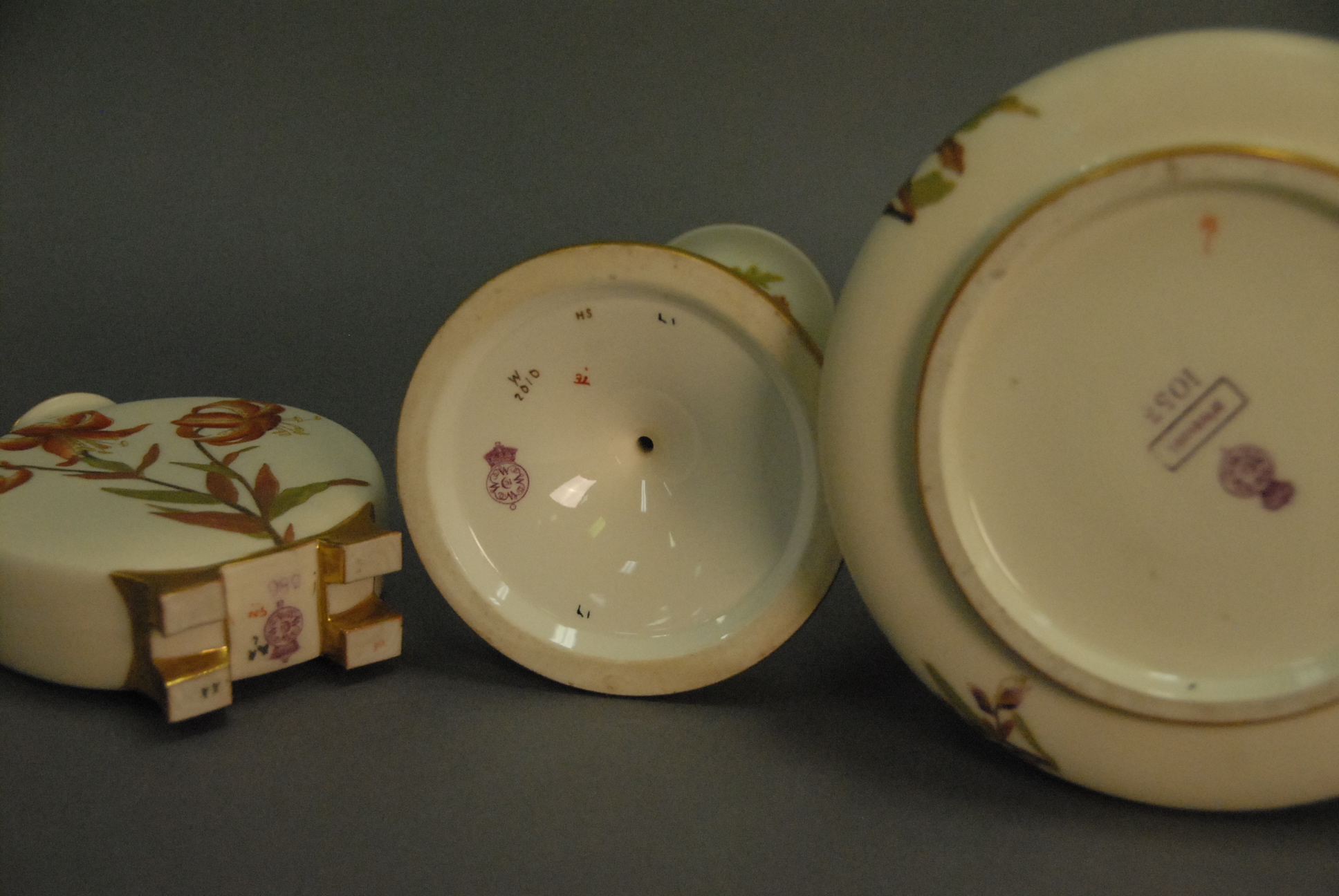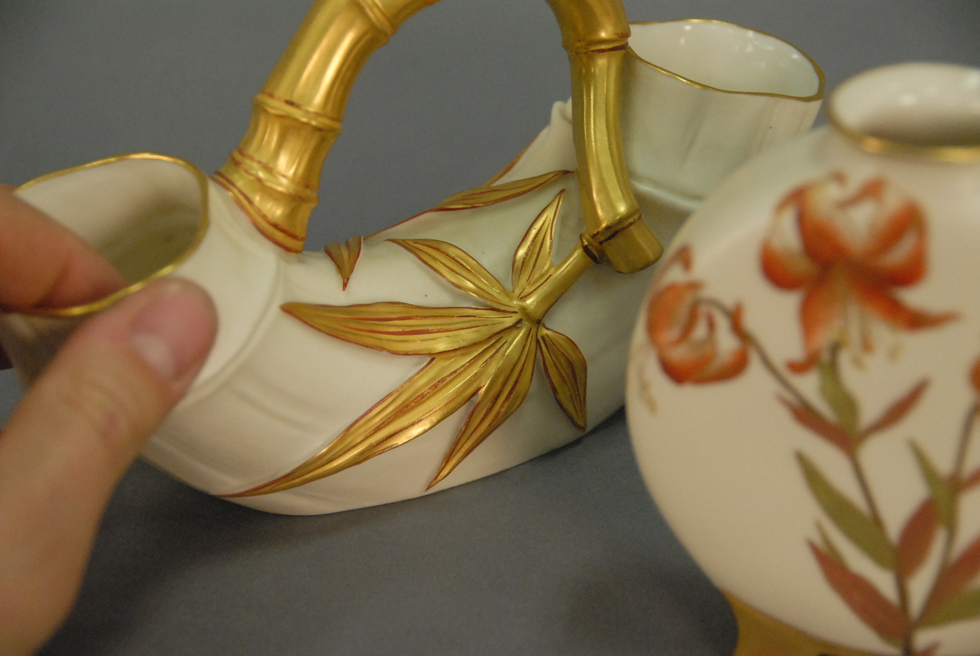 Four Royal Worcester pieces to include three vases and a candlestick.